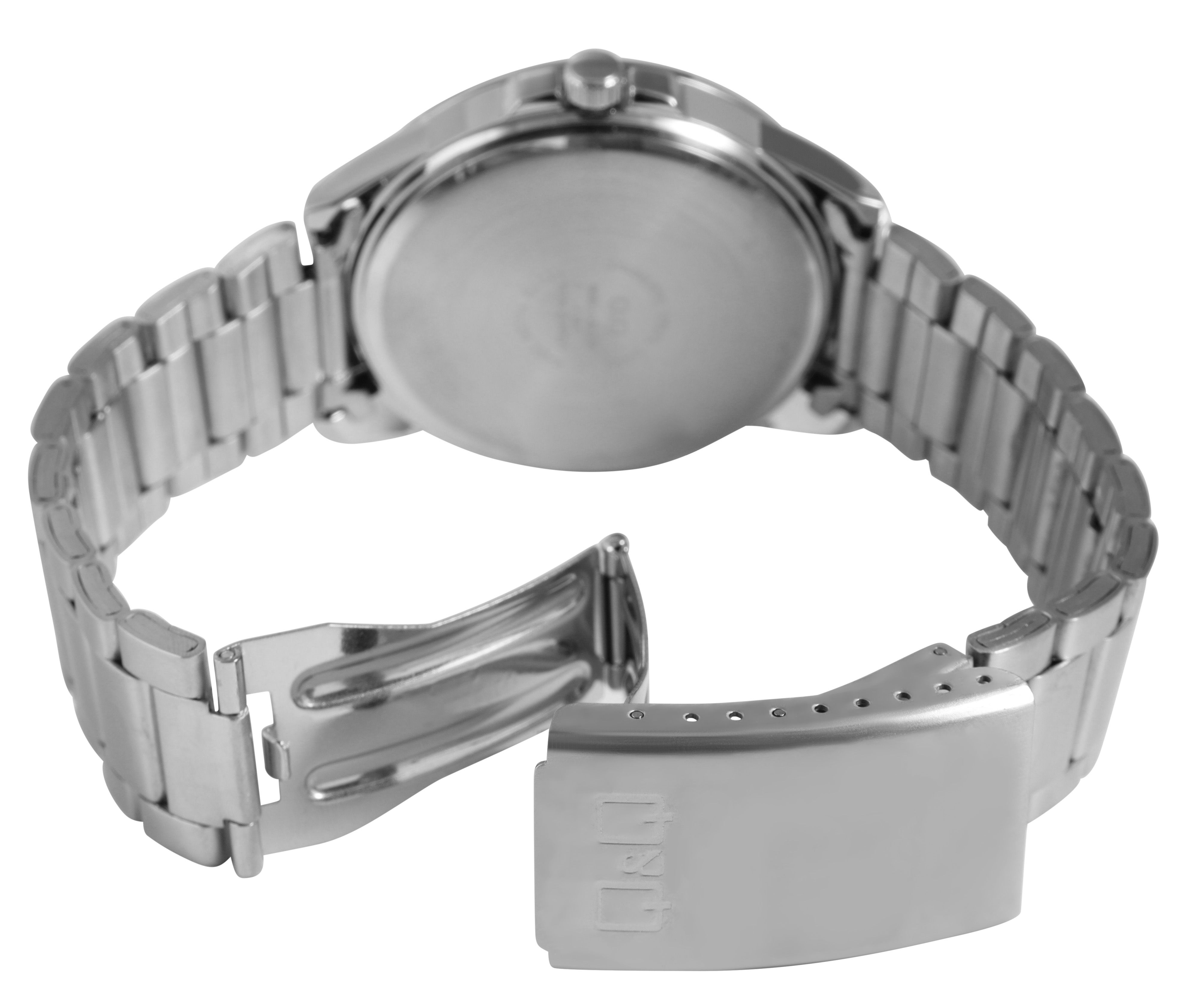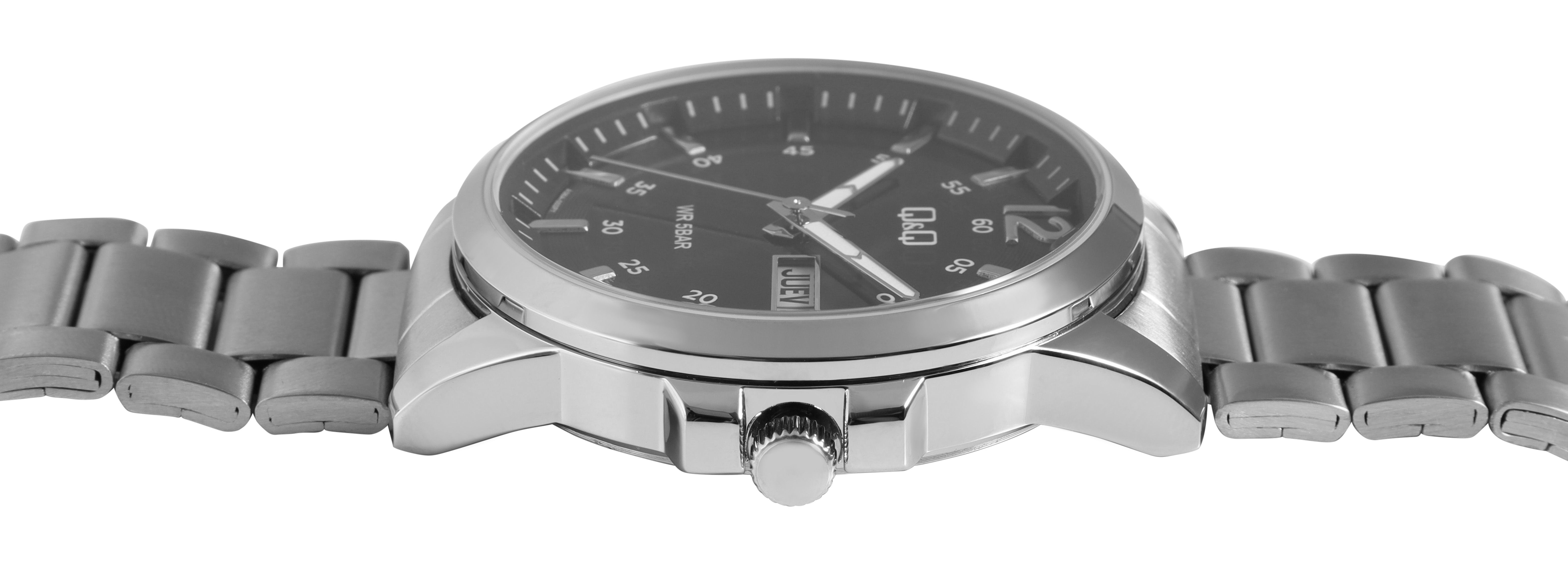 Diese Q&Q Herrenuhr mit Edelstahlarmband, 5 ATM Wasserdichtigkeit und Wochentags- und Datumsanzeige ist ein vielseitiges Accessoire, das mit ihrer Funktionalität und dem ansprechenden Design überzeugt. Das robuste und dennoch stilvolle Gliederarmband aus Edelstahl bietet nicht nur einen edlen Look, sondern auch Langlebigkeit und Tragekomfort. Es ist kürzbar, um eine perfekte Passform zu gewährleisten und dabei bietet die hochwertige Edelstahl-Faltschließe ein sicheres und einfaches An- und Ablegen.