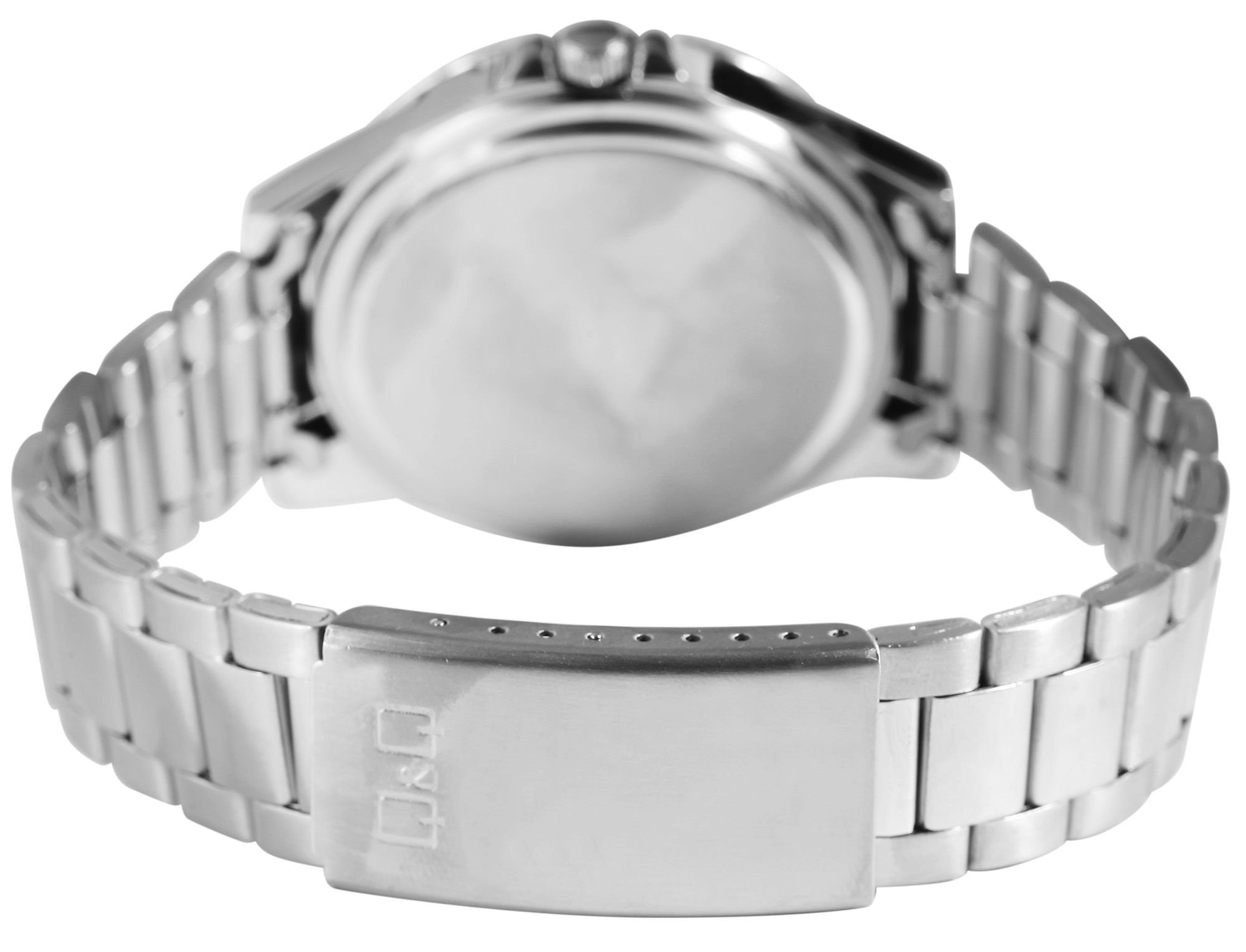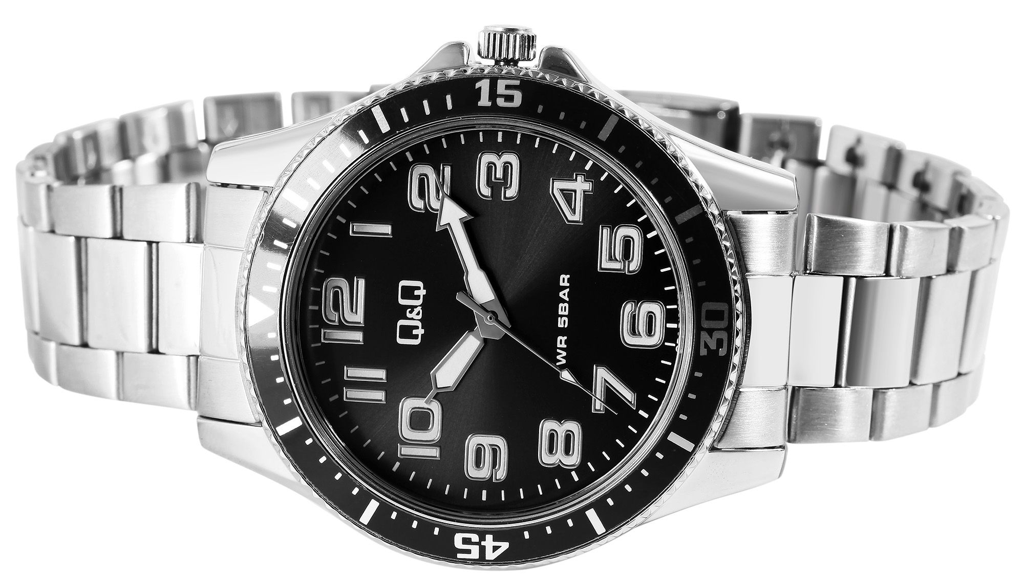 Die analoge 3-Zeiger Herrenarmbanduhr der Marke Q&Q verfügt über ein hochwertiges und ganggenaues Quarzuhrwerk. Das silberfarbene Edelstahlarmband ist im Anstoß 20 mm breit und lässt sich über eine Edelstahlfaltschließe öffnen und schließen. Das Uhrenarmband ist besonders robust und langlebig und lässt sich aufgrund der herausnehmbaren Elemente mithilfe eines passenden Werkzeuges beliebig kürzen. Die Kombination aus mattierten und glänzenden Uhrenelementen machen die Uhr dabei zu einem besonderen Accessoire. Die Gesamtlänge beträgt 23 cm. Das silberfarbene Uhrengehäuse mit Mineralglas hat eine Abmessung von 43 mm im Durchmesser und einer Gehäusehöhe von 11,5 mm. Die schwarze Lünette verleiht der Uhr ein sportives Design. Die Uhrzeit lässt sich durch das anthrazitfarbene Zifferblatt mit silberfarbenen Ziffern im arabischen Stil ideal ablesen. Dank der mit Superluminova beschichteten Zeiger und Indexe ist dies auch im Dunkeln möglich. Der Gehäuseboden ist ebenfalls aus Edelstahl gefertigt und die Uhr hat eine Wasserdichtigkeit von 5 bar. Rundum ist dieser Zeitmesser ein gelungenes und zuverlässiges Accessoire, das sich zu zahlreichen Gelegenheiten ausführen lässt.