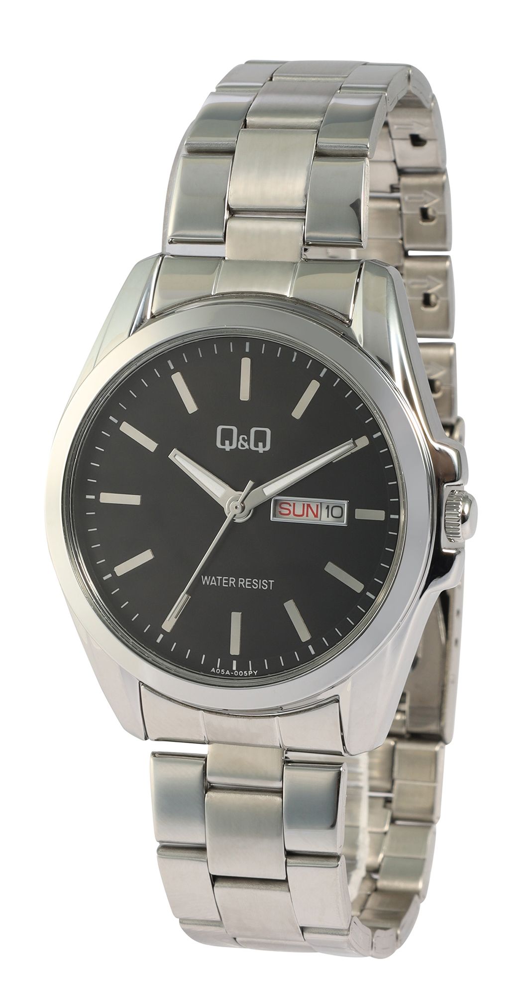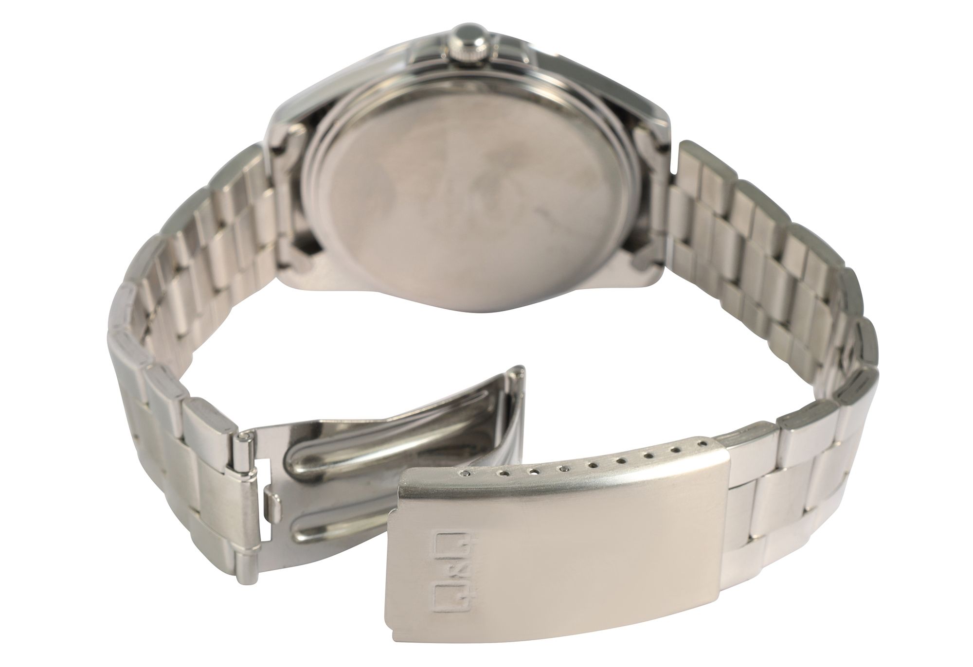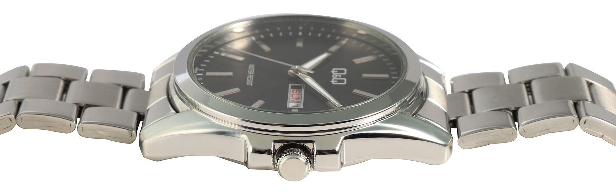 Die Herrenuhr von der Marke Q&Q verfügt über ein hochwertiges und ganggenaues Quarzuhrwerk. Das silberfarbene Edelstahlarmband ist im Anstoß 20 mm breit und lässt sich über eine Edelstahlfaltschließe öffnen und schließen. Die Kombination aus polierten und glänzenden Elementen im Uhrenarmband machen diese Uhr zu einem besonderen Accessoire. Das Uhrenarmband ist besonders robust und langlebig und lässt sich aufgrund der herausnehmbaren Elemente mithilfe eines passenden Werkzeuges beliebig kürzen. Die Gesamtlänge beträgt 23 cm. Das Uhrengehäuse mit Mineralglas hat einen Durchmesser von 41 mm und einer Gehäusehöhe von 10 mm. Das Ziffernblatt in schwarz mit einem Strichindex in silberfarben, bietet genügend kontrast um die Uhrzeit perfekt abzulesen. In der Dunkelheit lässt sich die Uhrzeit weiterhin wegen der Superluminova beschichteten Zeiger ablesen. Eine Datumsanzeige mit Wochentag und Datum befindet sich im Ziffernblatt. Der Gehäuseboden ist ebenfalls aus Edelstahl gefertigt und die Uhr hat eine Wasserdichtigkeit von 3 bar. Rundum ist dieser Zeitmesser ein gelungenes und zuverlässiges Accessoire, das sich zu zahlreichen Gelegenheiten