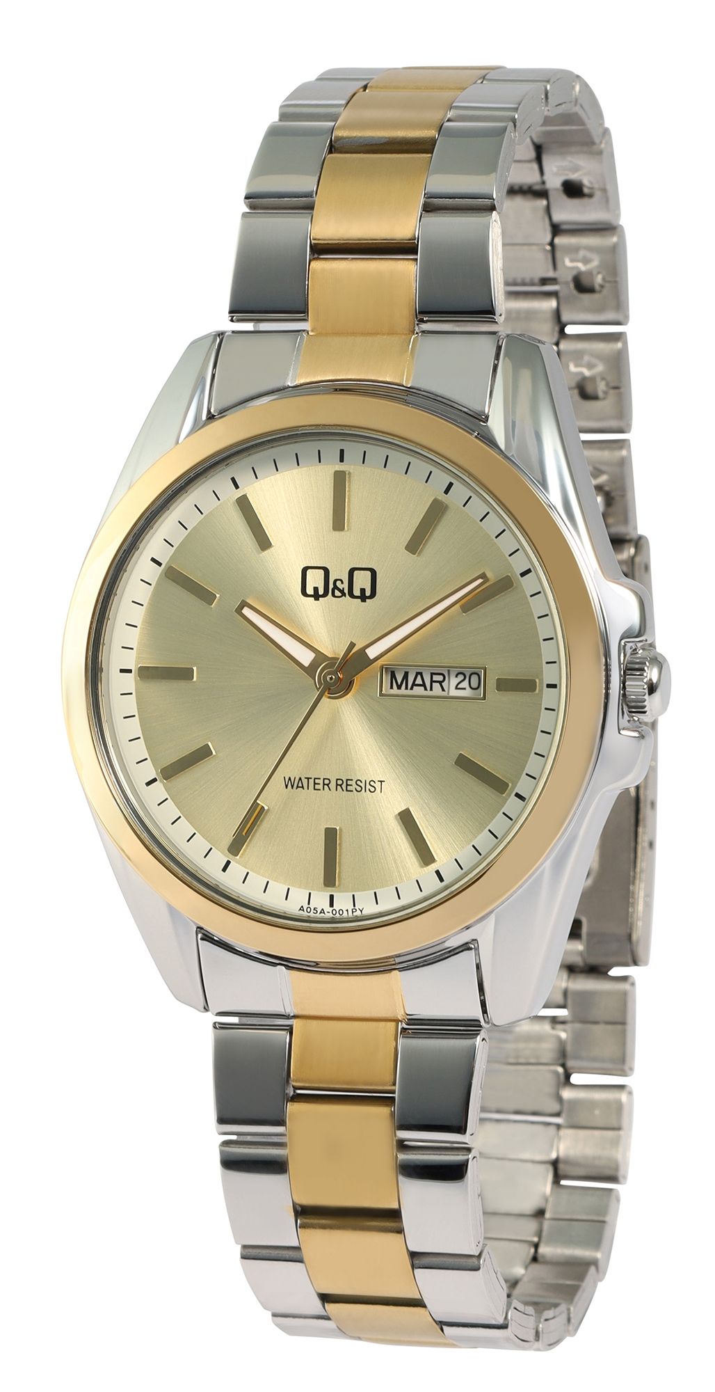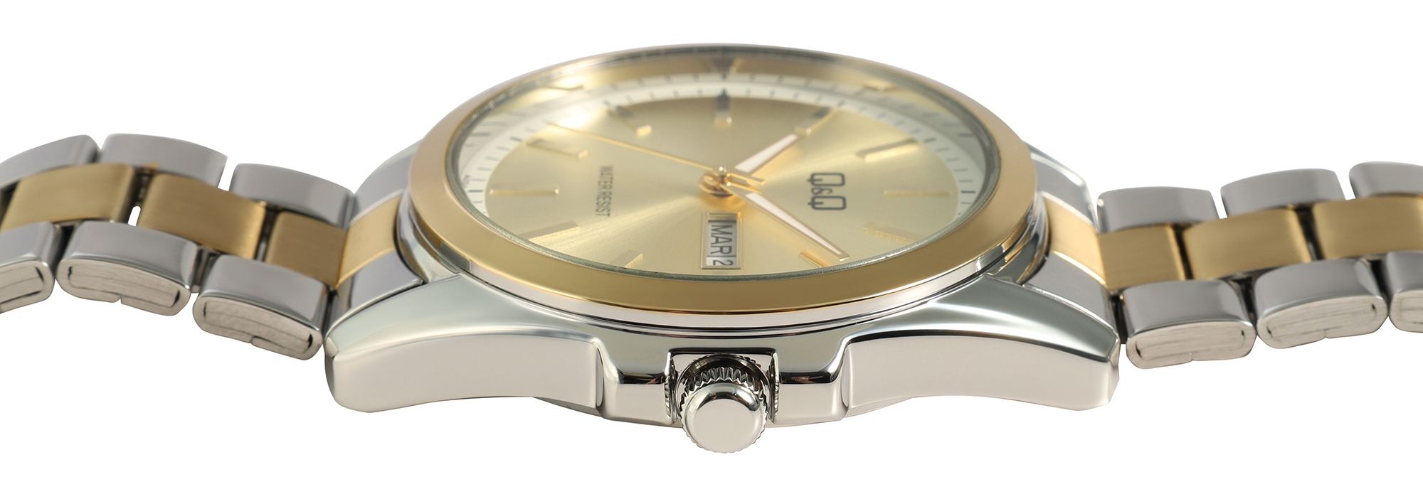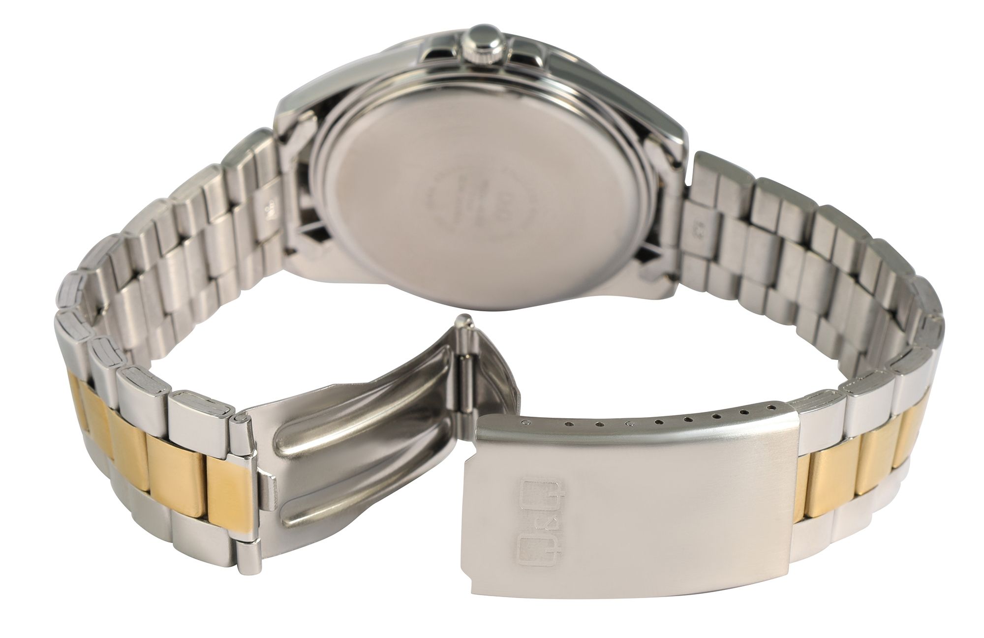 Die Herrenuhr von der Marke Q&Q - by Citizen Watch Co. LTD verfügt über ein hochwertiges und ganggenaues Quarzuhrwerk. Das bicolore Edelstahlarmband ist im Anstoß 20 mm breit und lässt sich über eine Edelstahlfaltschließe öffnen und schließen. Das Uhrenarmband ist besonders robust und langlebig und lässt sich aufgrund der herausnehmbaren Elemente mithilfe eines passenden Werkzeuges beliebig kürzen. Die Kombination silberfarbener und goldfarbener Uhrenelementen machen die Uhr dabei zu einem besonderen Accessoire. Die Gesamtlänge beträgt 23 cm. Das Uhrengehäuse mit Mineralglas hat einen Durchmesser von 41 mm und einer Gehäusehöhe von 10 mm. Das Ziffernblatt mit Strichindex sowie die Datumsanzeige lassen sich beide sehr gut ablesen. Dank der Superluminova beschichteten Zeiger lässt sich die Uhrzeit auch im dunkeln ablesen. Der Gehäuseboden ist ebenfalls aus Edelstahl gefertigt und die Uhr hat eine Wasserdichtigkeit von 3 bar. Rundum ist dieser Zeitmesser ein gelungenes und zuverlässiges Accessoire, das sich zu zahlreichen Gelegenheiten