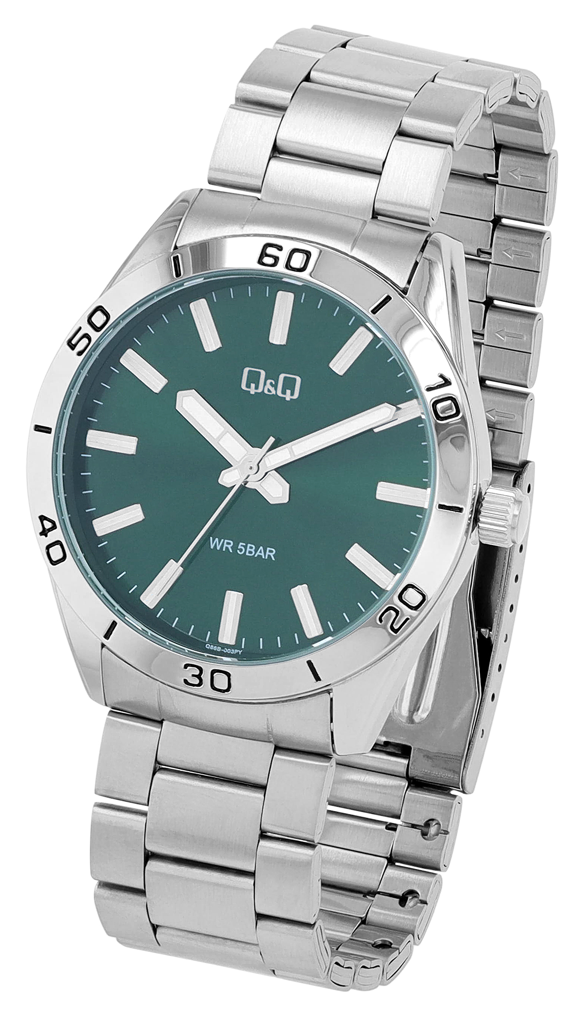 Diese Uhr der Marke Q&Q ist der perfekte Begleiter für den stilbewussten Mann, der Wert auf Qualität und Ästhetik legt. Das robuste Armband mit Faltschließe aus mattiertem Edelstahl verleiht der Uhr eine zeitlose Eleganz und bietet gleichzeitig hohe Widerstandsfähigkeit. Mit einer Gesamtlänge von 23 cm, einem Gehäusedurchmesser von 43 mm und einer Gehäusehöhe von 11 mm passt sie perfekt an das Handgelenk und bietet optimalen Tragekomfort. Die Bandbreite von 22 mm ergänzt das Design harmonisch und sorgt für Stabilität. Das Gehäuse besteht aus strapazierfähigem Metall, während der Gehäuseboden aus Edelstahl gefertigt ist, was für zusätzliche Langlebigkeit sorgt. Das hochwertige Quarzuhrwerk garantiert präzise Zeitmessung und Zuverlässigkeit im Alltag. Das Mineralglas schützt das Zifferblatt vor Kratzern und anderen Beschädigungen, was die Lebensdauer erheblich verlängert. Der Clou des grünen Zifferblattes sind die Zeiger und Indizes, welche mit Superluminova beschichtet sind, sodass die Uhrzeit auch im Dunkeln leuchtet. Es ist mit einem Strichindex versehen, was für eine klare und einfache Ablesbarkeit sorgt. Mit einer Wasserdichtigkeit von bis zu 5 Bar ist sie auch für den täglichen Gebrauch geeignet und hält den Herausforderungen des Alltages stand.