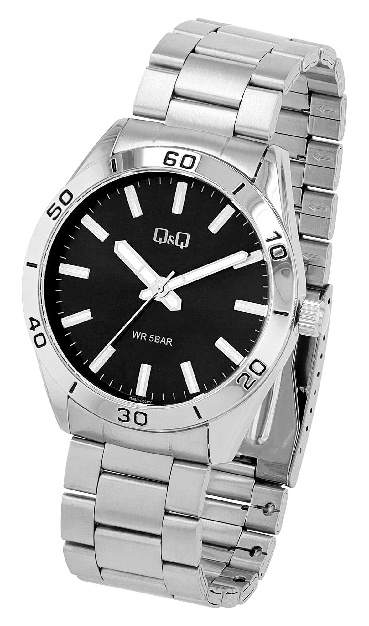 Diese Uhr der Marke Q&Q ist der perfekte Begleiter für den stilbewussten Mann, der Wert auf Qualität und Ästhetik legt. Das robuste Armband mit Faltschließe aus mattiertem Edelstahl verleiht der Uhr eine zeitlose Eleganz und bietet gleichzeitig hohe Widerstandsfähigkeit. Mit einer Gesamtlänge von 23 cm, einem Gehäusedurchmesser von 43 mm und einer Gehäusehöhe von 11 mm passt sie perfekt an das Handgelenk und bietet optimalen Tragekomfort. Die Bandbreite von 22 mm ergänzt das Design harmonisch und sorgt für Stabilität. Das Gehäuse besteht aus strapazierfähigem Metall, während der Gehäuseboden aus Edelstahl gefertigt ist, was für zusätzliche Langlebigkeit sorgt. Das hochwertige Quarzuhrwerk garantiert präzise Zeitmessung und Zuverlässigkeit im Alltag. Das Mineralglas schützt das Zifferblatt vor Kratzern und anderen Beschädigungen, was die Lebensdauer erheblich verlängert. Der Clou des schwarzen Zifferblattes sind die Zeiger und Indizes, welche mit Superluminova beschichtet sind, sodass die Uhrzeit auch im Dunkeln leuchtet. Es ist mit einem Strichindex versehen, was für eine klare und einfache Ablesbarkeit sorgt. Mit einer Wasserdichtigkeit von bis zu 5 Bar ist sie auch für den täglichen Gebrauch geeignet und hält den Herausforderungen des Alltages stand.