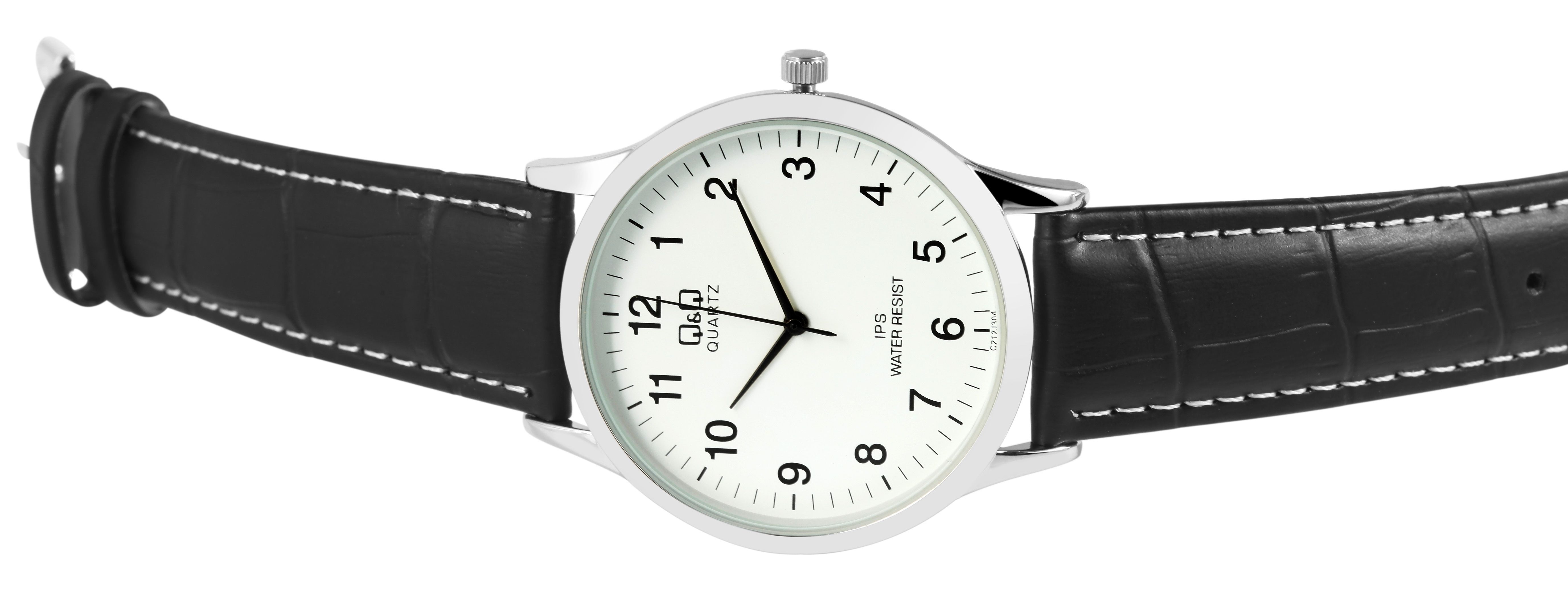 Die analoge 3-Zeiger Herrenarmbanduhr der Marke Q&Q - by Citizen Watch Co. LTD verfügt über ein hochwertiges Quarzuhrwerk. Das schwarze Lederimitatarmband in Krokoprägung ist am Anstoß 20 mm breit und lässt sich mit einer silberfarbenen Dornschließe öffnen und schließen. Die Gesamtlänge der Uhr beträgt 24 cm. Das silberfarbene Metallgehäuse mit Mineralglas hat eine Abmessung von 40 mm im Durchmesser und einer Gehäusehöhe von 8 mm. Der Gehäuseboden ist aus Edelstahl gefertigt und die Uhr hat eine Wasserdichtigkeit von 3 bar. Das weiße Zifferblatt ist schlicht, Zeiger und Indexe sind schwarz. Somit lässt sich die Uhrzeit auf einen Blick gut erkennen.