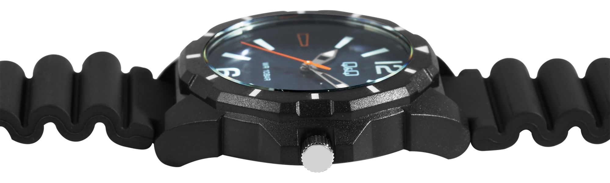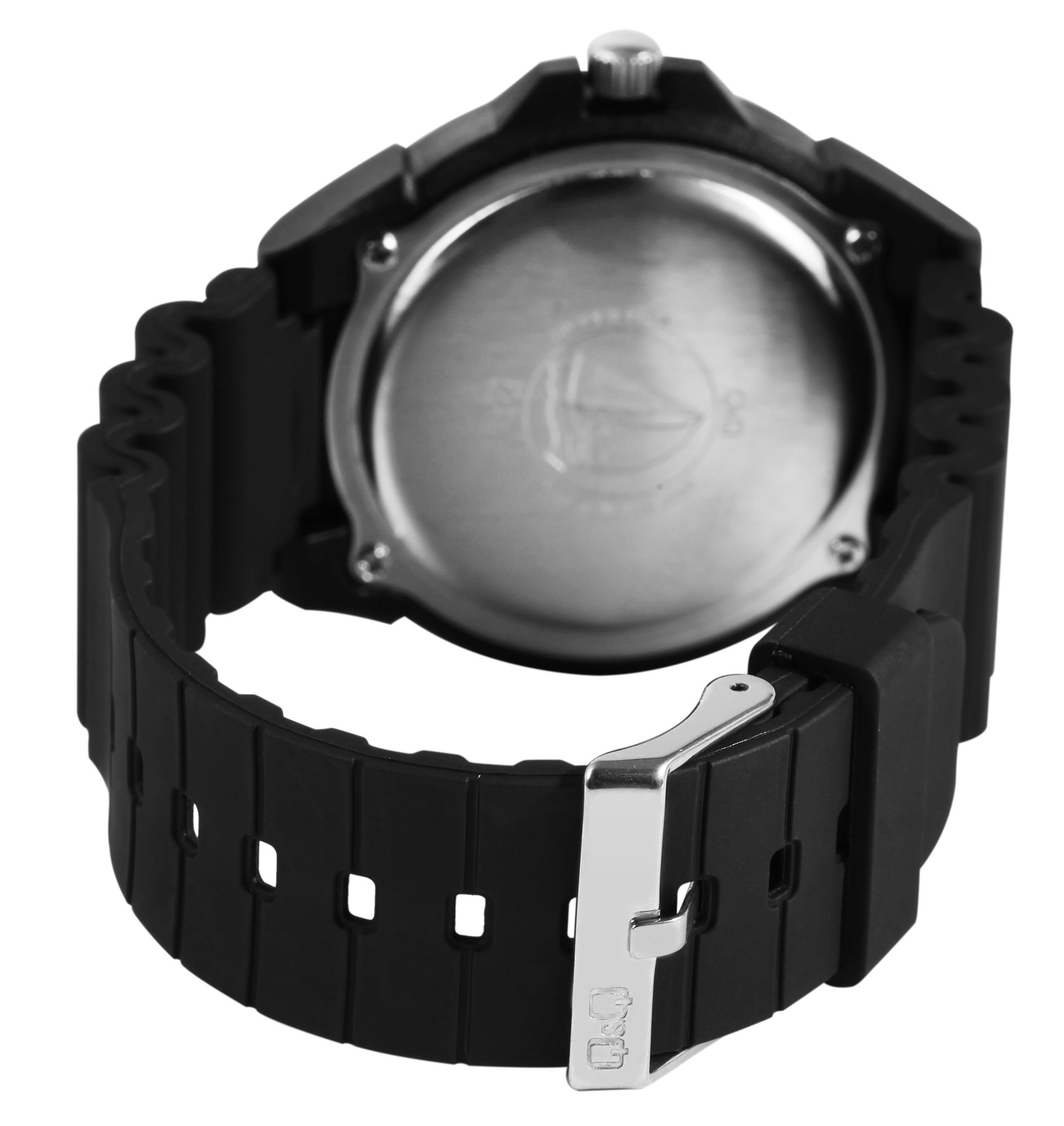 Die analoge 3-Zeiger Herrenarmbanduhr der Marke Q&Q - by Citizen Watch Co. LTD (by Citizen Watch Co. LTD) verfügt über ein hochwertiges und ganggenaues Quarzuhrwerk. Das schwarze Resinarmband ist am Anstoß 17 mm breit (Bandbreite am Steg 24 mm) und lässt sich mit einer silberfarbenen Edelstahl-Dornschließe öffnen und schließen. Die Gesamtlänge der Uhr beträgt 24,5 cm. Das schwarze Kunststoffgehäuse mit Mineralglas und sportive Lünette hat eine Abmessung von 43 mm im Durchmesser und einer Gehäusehöhe von 12 mm. Der Gehäuseboden ist aus Edelstahl gefertigt und mit vier Edelstahlschrauben am Gehäuse befestigt. Die Uhrzeit lässt sich durch das übersichtlich gestaltete Zifferblatt mit weißen Indexen ideal ablesen. Des Weiteren bietet die Armbanduhr durch das Resinarmband einen angenehmen Tragekomfort und lässt sich durch das sportliche Design wunderbar kombinieren. Zudem erweist sich das Material als besonders hautfreundlich und eignet sich dadurch ideal für Allergiker.