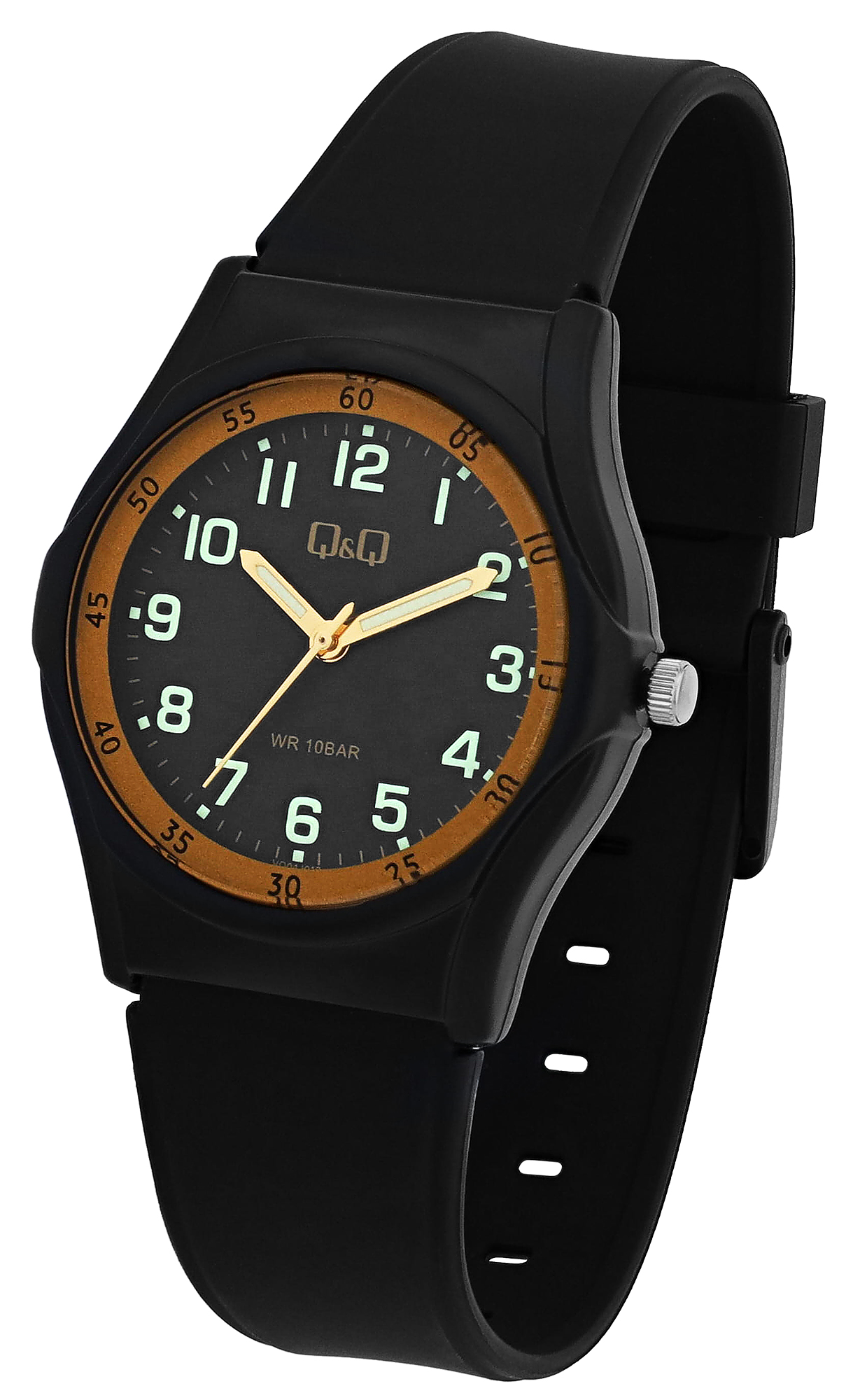 Die analoge 3-Zeiger Herrenuhr der Marke Q&Q - by Citizen Watch Co. LTD verfügt über ein hochwertiges Quarzuhrwerk, das für äußerste Präzision und Zuverlässigkeit sorgt. Mit ihrem schlichten und dennoch sportlichen Design ist diese Uhr der ideale Begleiter für aktive Männer, die Wert auf Qualität und zeitlosen Charme legen. Das schwarze und übersichtliche Zifferblatt der Uhr besticht durch grüne arabische Ziffern und mit Superluminova beschichtete Zeiger. Die Schlichtheit des Designs macht diese Uhr zu einem vielseitigen Begleiter und sorgt für eine schnelle und einfache Ablesung der Uhrzeit. Das Gehäuse der Uhr ist aus strapazierfähigem Kunststoff gefertigt, während der Gehäuseboden aus Edelstahl zusätzliche Stabilität bietet. Mit einem Gehäusedurchmesser von 34 mm und einer Höhe von 10 mm ist diese Uhr präsent, aber dennoch angenehm zu tragen. Das 20 mm breite Silikonarmband sorgt für Komfort und passt perfekt zu einem aktiven Lebensstil. Die Dornschließe aus Kunststoff gewährleistet einen sicheren Halt, während des Tragens der Uhr. Mit einer Wasserdichtigkeit von 10 ATM ist diese Herrenuhr bereit, jedes Abenteuer zu erleben, sei es beim Schwimmen, Schnorcheln oder Wassersport.