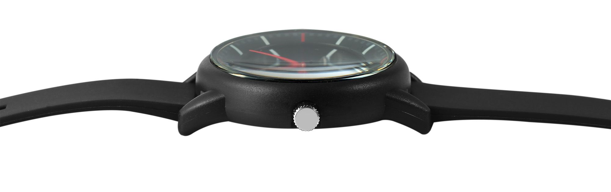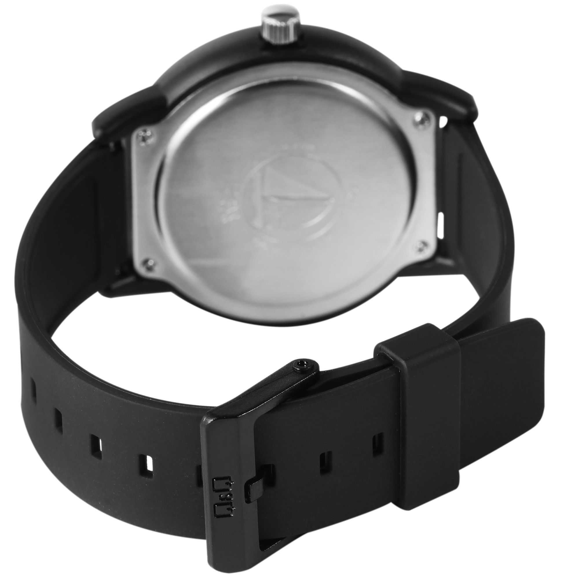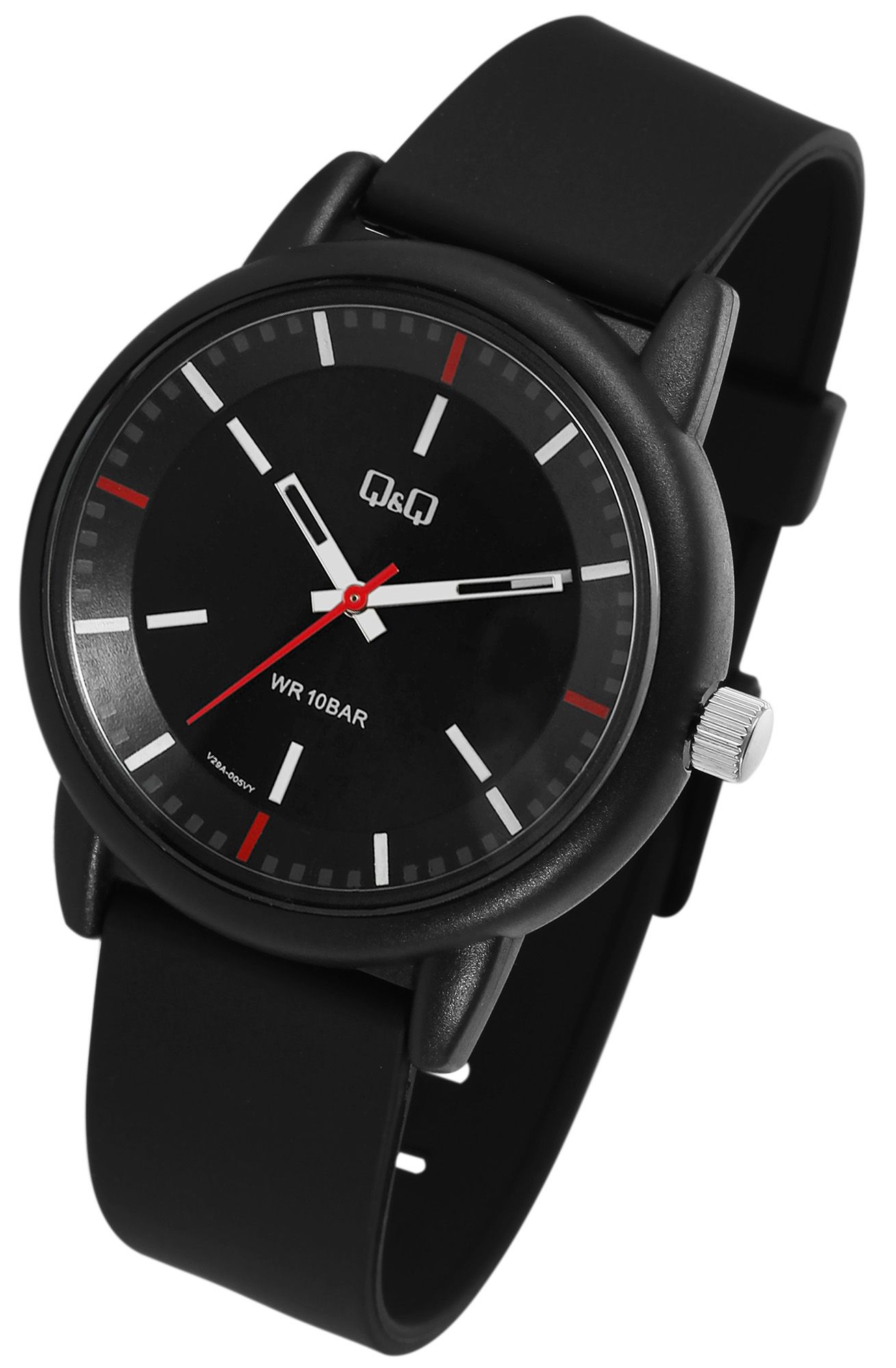 Die analoge 3-Zeiger Herrenarmbanduhr der Marke Q&Q - by Citizen Watch Co. LTD verfügt über ein hochwertiges und ganggenaues Quarzuhrwerk. Das schwarze Silikonarmband ist am Anstoß 20 mm breit und lässt sich mit einer schwarzen Dornschließe öffnen und schließen. Die Gesamtlänge der Uhr beträgt 24,5 cm. Das schwarze Kunststoffgehäuse mit Mineralglas hat eine Abmessung von 42 mm im Durchmesser und einer Gehäusehöhe von 11 mm. Der Gehäuseboden ist aus Edelstahl gefertigt und mit vier Edelstahlschrauben am Gehäuse befestigt. Die Uhrzeit lässt sich durch das schwarze Zifferblatt mit rot/weißen Indexen ideal ablesen. Des Weiteren bietet die Armbanduhr durch das weiche Silikonarmband einen angenehmen Tragekomfort und lässt sich durch das sportliche Design wunderbar kombinieren. Zudem erweist sich das Material als besonders hautfreundlich und eignet sich dadurch ideal für Allergiker.