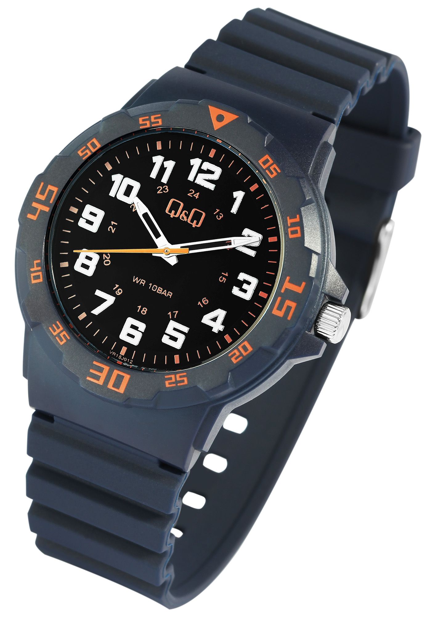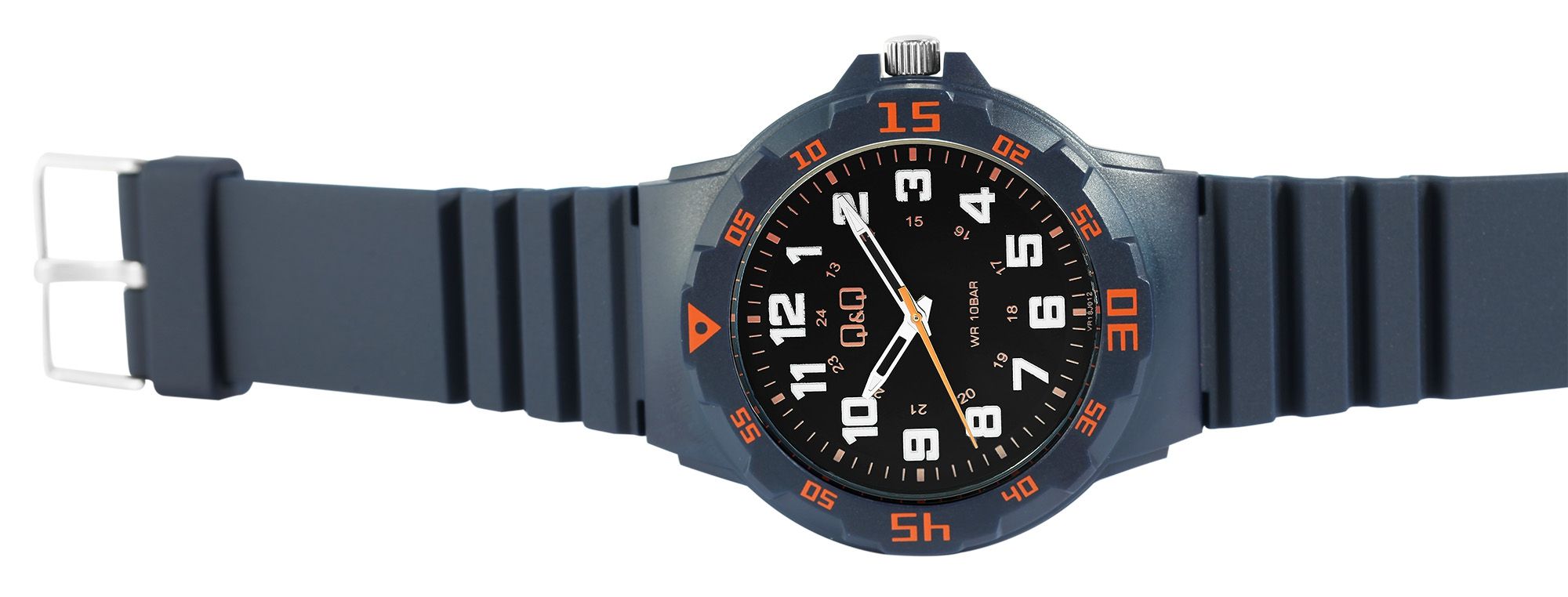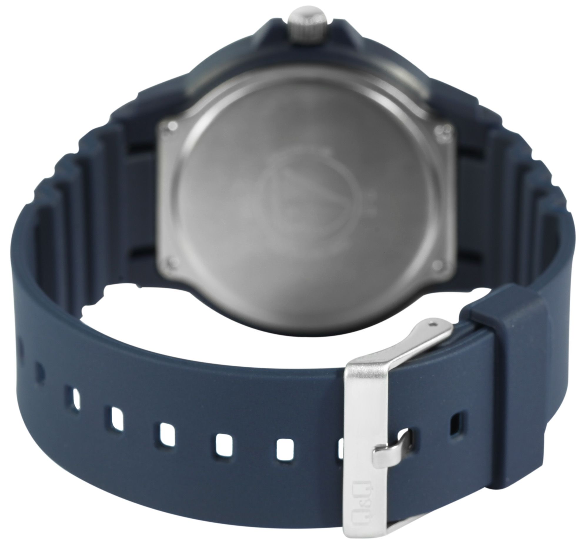 Die analoge 3-Zeiger Herrenarmbanduhr der Marke Q&Q - by Citizen Watch Co. LTD (by Citizen Watch Co. LTD) verfügt über ein hochwertiges Quarzuhrwerk. Das blaue Silikonarmband ist am Steg 16 mm breit (Bandbreite am 22 mm) und lässt sich mit einer silberfarbenen Dornschließe öffnen und schließen. Die Gesamtlänge der Uhr beträgt 25 cm. Das blaue Kunststoffgehäuse mit Mineralglas hat einen Durchmesser von 43 mm und eine Gehäusehöhe von 11 mm. Der Gehäuseboden ist aus Edelstahl gefertigt. Durch die mit Superluminova beschichteten Zeiger und Indexe lässt sich auch im Dunkeln die Zeit gut ablesen. Die Uhr hat eine Wasserdichtigkeit von 10 bar.