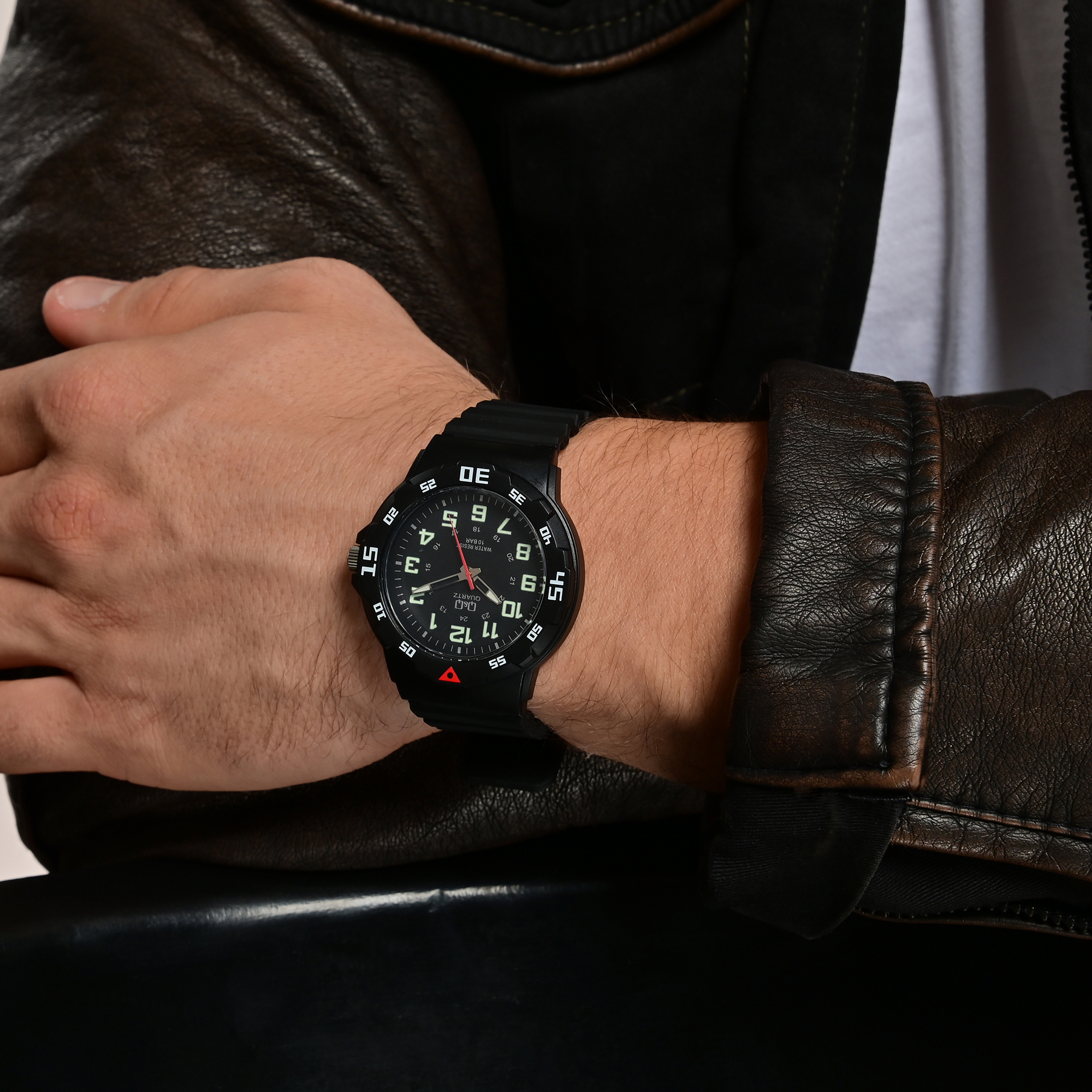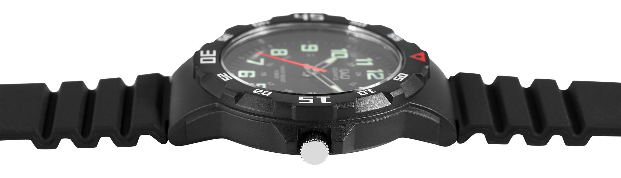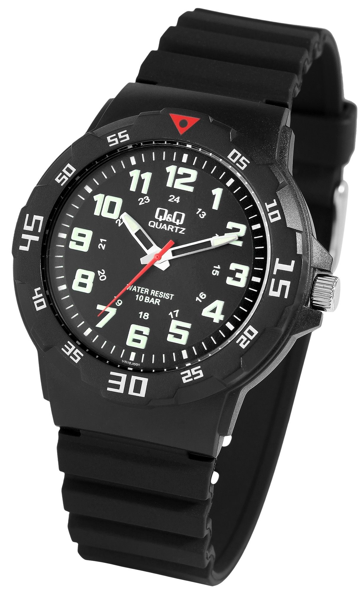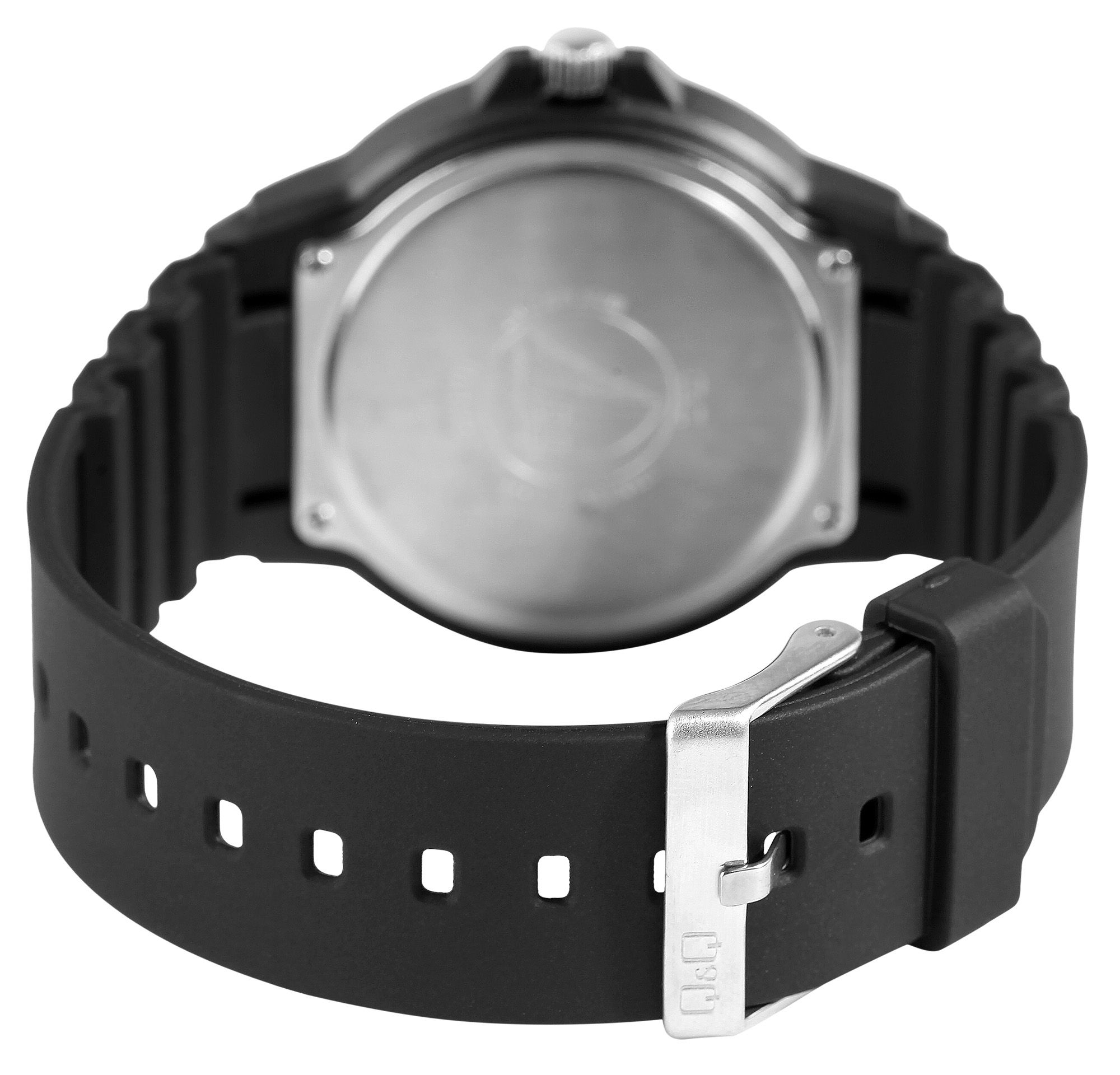 Die analoge 3-Zeiger Herrenarmbanduhr der Marke Q&Q - by Citizen Watch Co. LTD (by Citizen Watch Co. LTD) verfügt über ein hochwertiges Quarzuhrwerk. Das schwarze Silikonarmband ist am Steg 16 mm breit (Bandbreite am 22 mm) und lässt sich mit einer silberfarbenen Dornschließe öffnen und schließen. Die Gesamtlänge der Uhr beträgt 25 cm. Das schwarze Kunststoffgehäuse mit Mineralglas hat einen Durchmesser von 43 mm und eine Gehäusehöhe von 11 mm. Der Gehäuseboden ist aus Edelstahl gefertigt. Durch die mit Superluminova beschichteten Zeiger und Indexe lässt sich auch im Dunkeln die Zeit gut ablesen. Die Uhr hat eine Wasserdichtigkeit von 10 bar.
