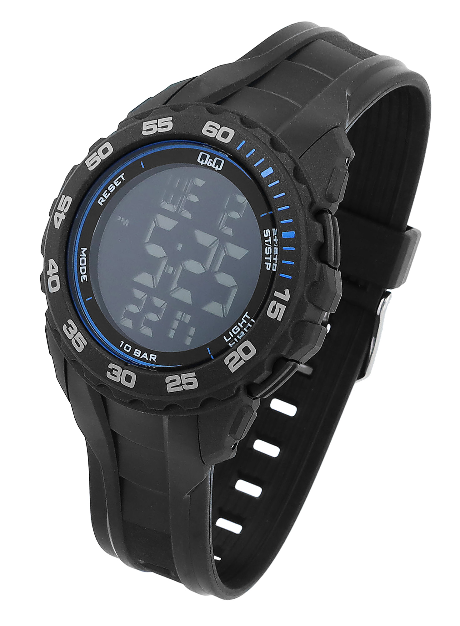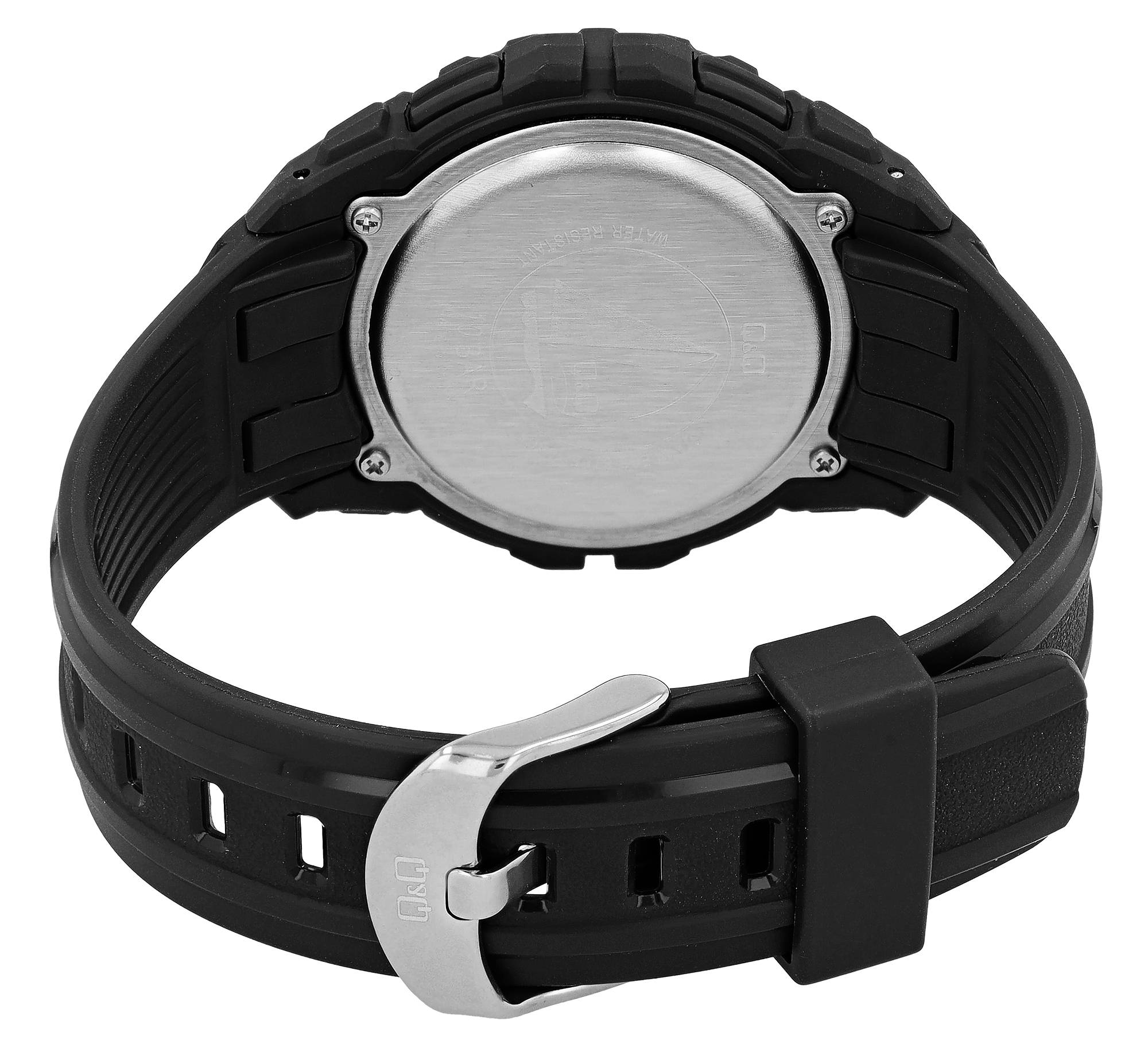 Diese sportliche Uhr von Q&Q bietet vielzählige Funktionen in einem kompakten Gehäuse aus Kunststoff und Edelstahl: