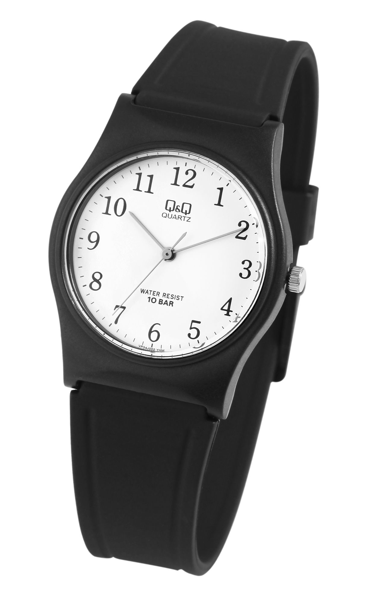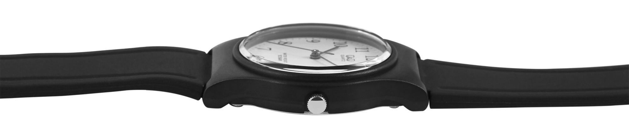 Die analoge 3-Zeiger Armbanduhr der Marke Q&Q - by Citizen Watch Co. LTD verfügt über ein hochwertiges Quarzuhrwerk. Das schwarze Kunststoffarmband ist am Anstoß 18 mm breit und lässt sich mit einer schwarzen Dornschließe öffnen und schließen. Die Gesamtlänge der Uhr beträgt 24,5 cm. Das schwarze Kunststoffgehäuse mit Kunststoffglas hat einen Durchmesser von 33 mm und eine Gehäusehöhe von 9 mm. Der Gehäuseboden ist aus Edelstahl gefertigt. Das Zifferblatt ist weiß und die Zeiger und Indexe sind schwarz. Durch den farblichen Kontrast lässt sich die Uhrzeit übersichtlich ablesen. Zudem hat die Uhr eine Wasserdichtigkeit von 10 bar.