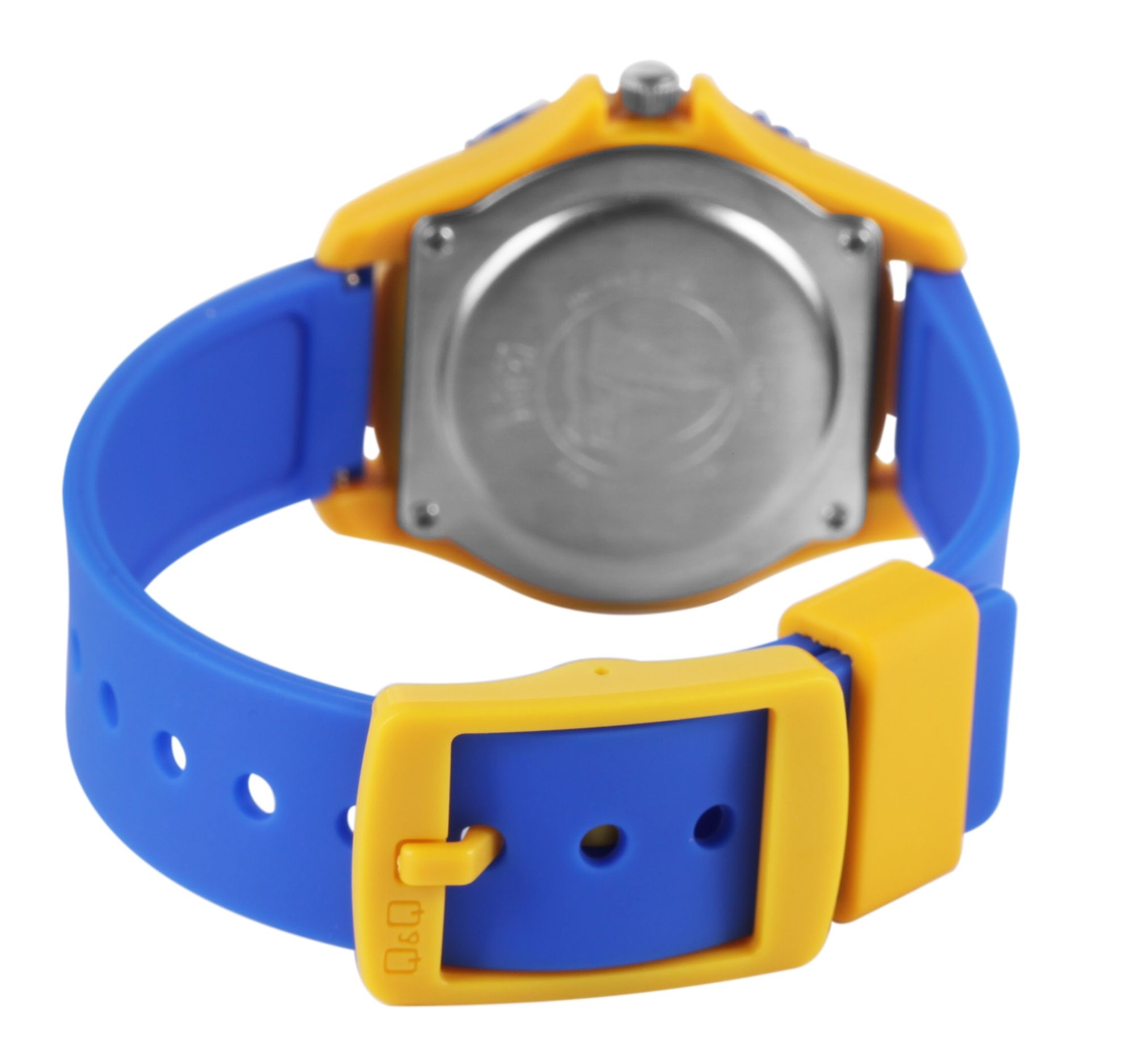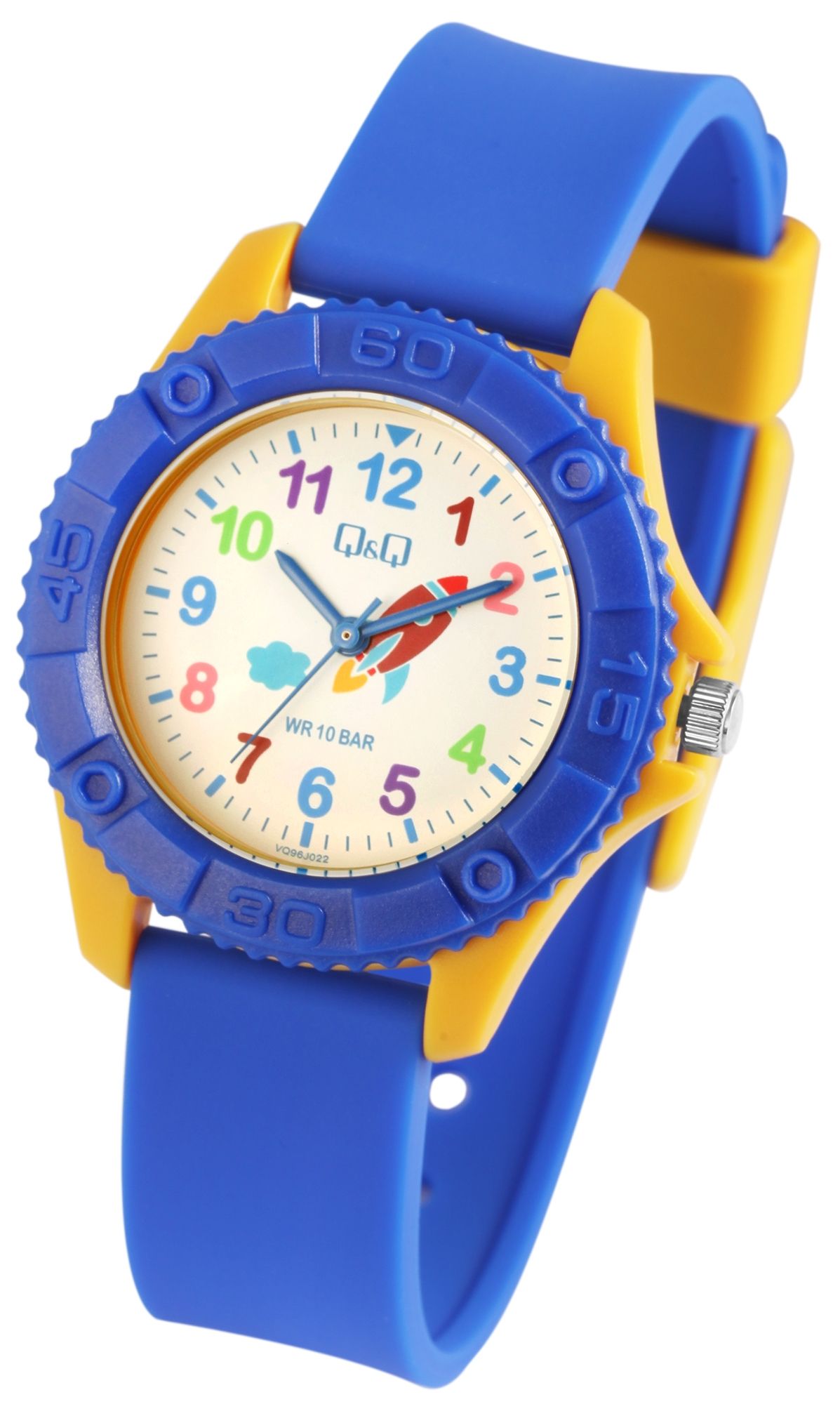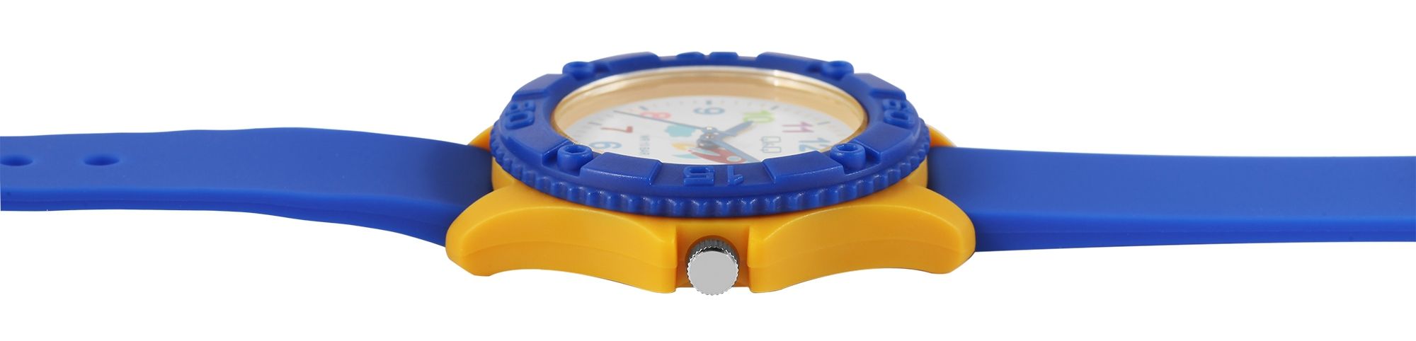 Die analoge 3-Zeiger Kinderarmbanduhr der Marke Q&Q verfügt über ein hochwertiges Quarzuhrwerk. Das blaue Silikonarmband ist am Anstoß 16 mm breit und lässt sich mit einer gelben Dornschließe aus Kunststoff öffnen und schließen. Dank des Materials ist die Uhr nicht nur robust, sie bietet auch einen angenehmen Tragekomfort. Die Gesamtlänge der Uhr beträgt 24 cm. Das gelbe Kunststoffgehäuse mit Kunststoffglas hat eine Abmessung von 35 mm im Durchmesser und einer Gehäusehöhe von 10 mm. Der Gehäuseboden ist aus Edelstahl gefertigt. Das Zifferblatt ist weiß und mit bunten Ziffern bedruckt, die drei Zeiger sind blau. Des Weiteren wird das Zifferblatt mit einer Rakete geschmückt und die Uhr hat eine Wasserdichtigkeit von 10 bar.