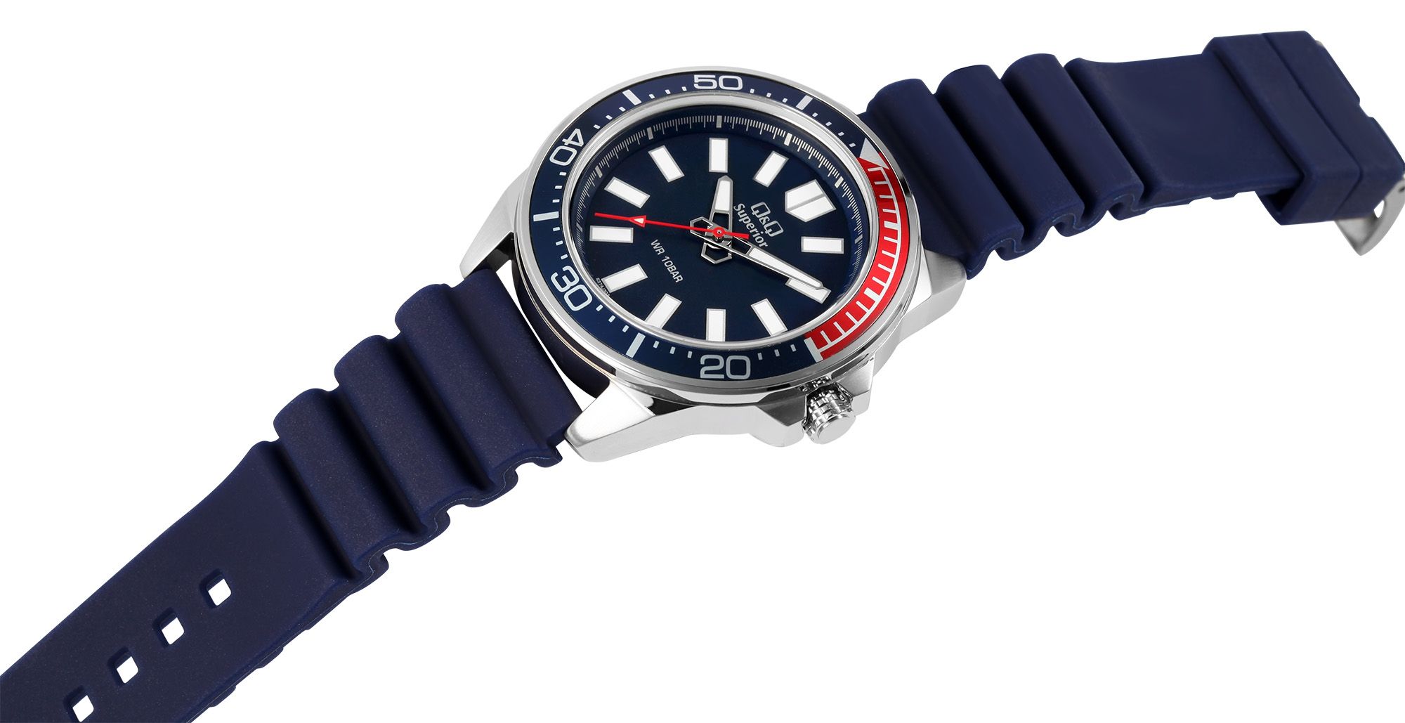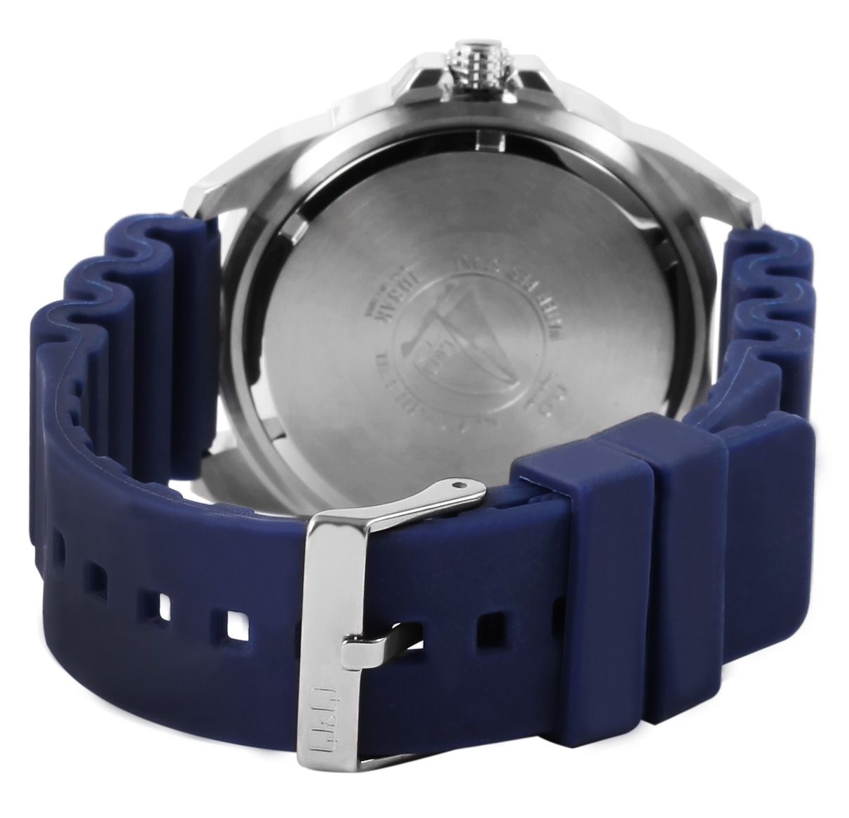 Die analoge 3-Zeiger Herrenarmbanduhr der Marke Q&Q verfügt über ein hochwertiges und ganggenaues Quarzuhrwerk der Marke Miyota. Das dunkelblaue Silikonarmband ist am Anstoß 22 mm breit und lässt sich über eine silberfarbene Dornschließe öffnen und schließen. Die Gesamtlänge der Uhr beträgt 26 cm. Das silberfarbene Metallgehäuse mit blau/roter Lünette und Mineralglas hat eine Abmessung von 44 mm im Durchmesser und einer Gehäusehöhe von 12 mm. Der Gehäuseboden ist aus Edelstahl gefertigt und die Uhr hat eine Wasserdichtigkeit von 10 bar. Durch die mit Superluminova beschichteten Zeiger und Indexe lässt sich auch im Dunkeln die Zeit gut ablesen. Das Silikonarmband und die markante Lünette sorgen für eine sportive Optik und runden das gelungene Design des Zeitmessers perfekt ab. Jede Q&Q Superior wird in einer hochwertigen Uhrenbox geliefert, somit eignet sie sich perfekt zum Verschenken.