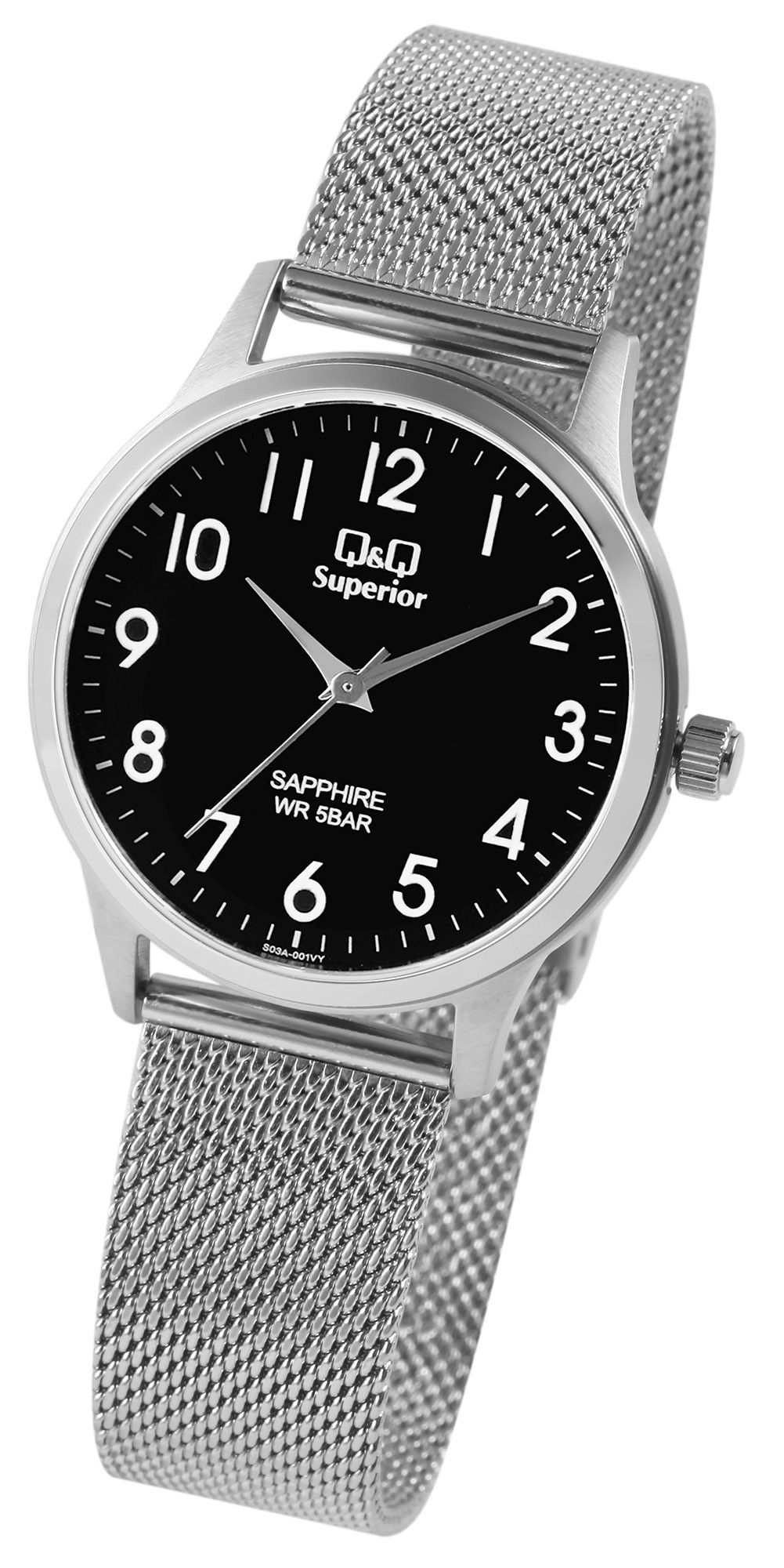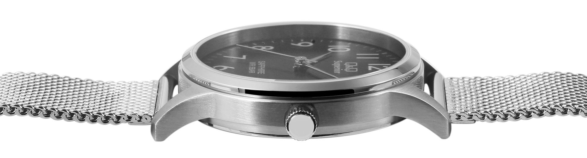 Die analoge 3-Zeiger Armbanduhr der Marke Q&Q - by Citizen Watch Co. LTD verfügt über ein hochwertiges und ganggenaues Quarzuhrwerk der Marke Miyota. Das silberfarbene Mesharmband ist im Anstoß 18 mm breit und lässt sich über einen Hakenverschluss öffnen und schließen. Das Uhrenarmband hat durch die besondere Machart einen hohen Tragekomfort und ist durch die feine Stufenverstellung perfekt an jedes Handgelenk anpassbar. Das Zusammentreffen aus klassischen Uhrenelementen mit modernem Design machen die Uhr dabei zu einem besonderen Accessoire. Die Gesamtlänge der Uhr beträgt 23 cm. Das silberfarbene Uhrengehäuse mit Saphirglas hat eine Abmessung von 36 mm im Durchmesser und einer Gehäusehöhe von 8 mm. Die Uhrzeit lässt sich durch das schwarze Zifferblatt mit weißen Ziffern im arabischen Stil ideal ablesen. Der Gehäuseboden ist ebenfalls aus Edelstahl gefertigt und die Uhr hat eine Wasserdichtigkeit von 5 bar. Jede Q&Q - by Citizen Watch Co. LTD Superior wird in einer hochwertigen Uhrenbox geliefert, somit eignet sie sich perfekt zum Verschenken.
