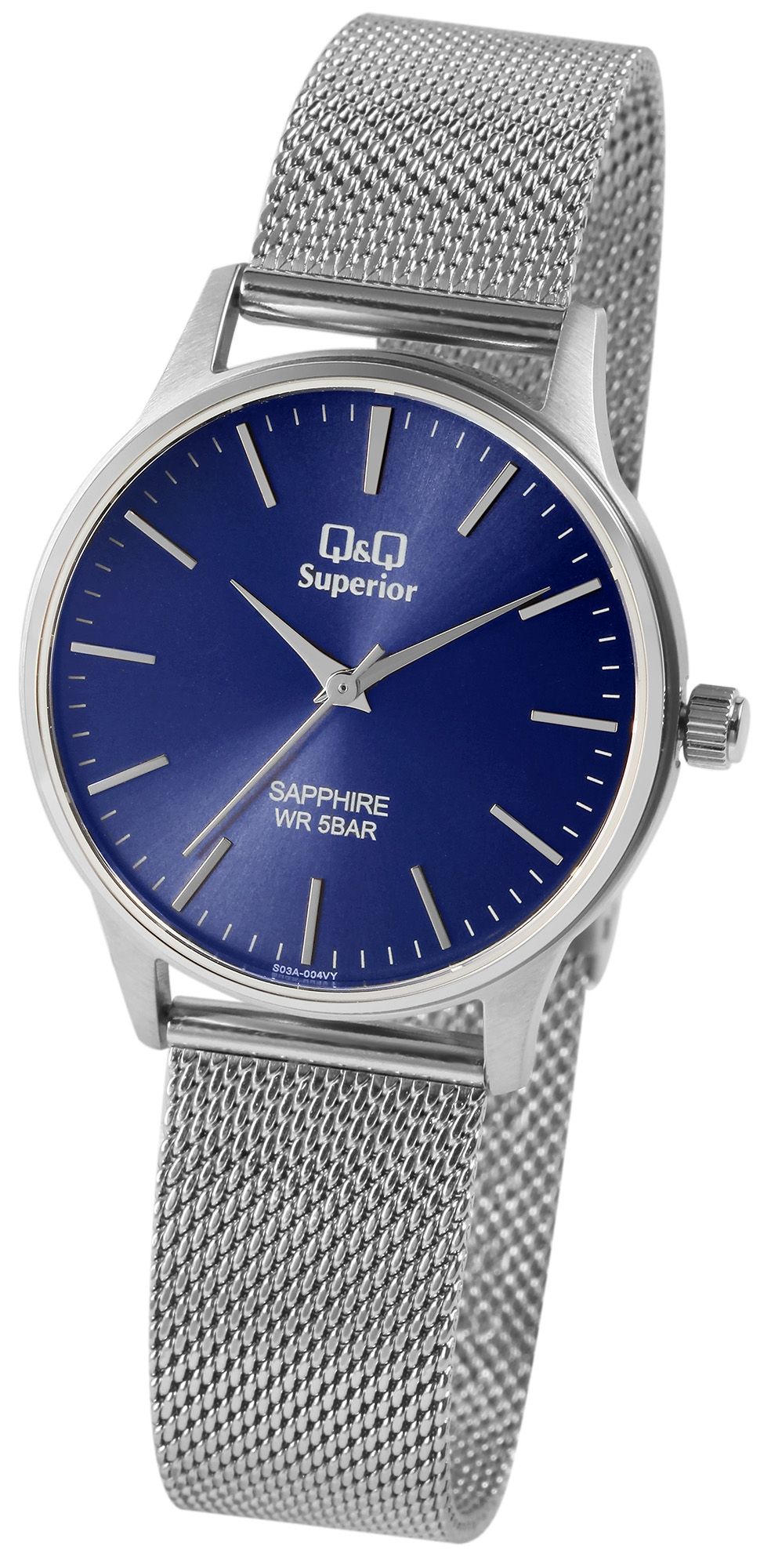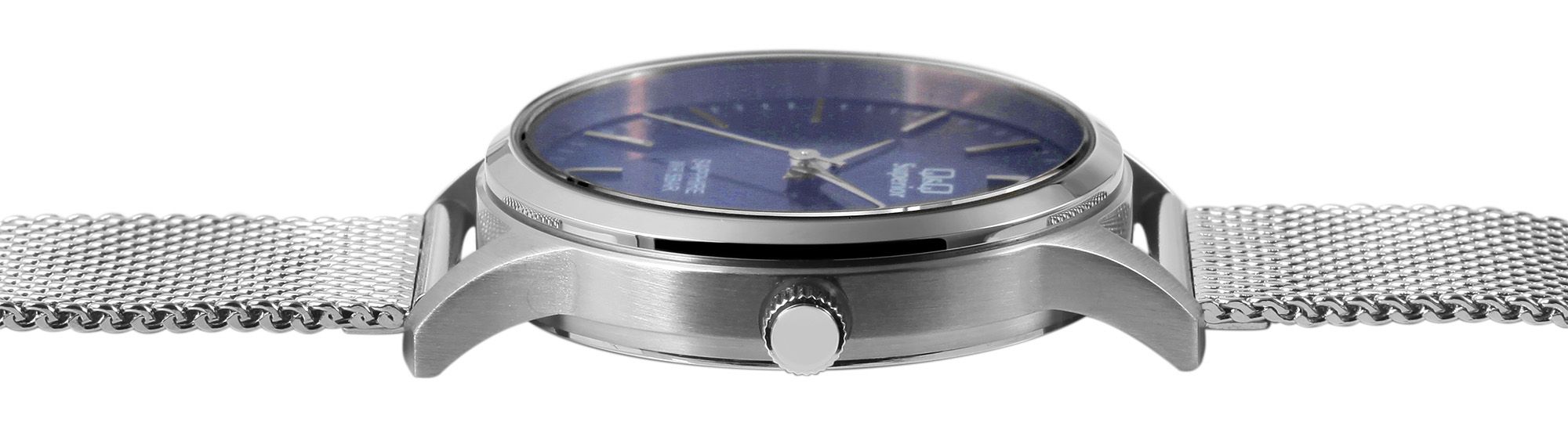 Die analoge 3-Zeiger Armbanduhr der Marke Q&Q verfügt über ein hochwertiges und ganggenaues Quarzuhrwerk der Marke Miyota. Das silberfarbene Mesharmband ist im Anstoß 18 mm breit und lässt sich über einen Hakenverschluss öffnen und schließen. Das Uhrenarmband hat durch die besondere Machart einen hohen Tragekomfort und ist durch die feine Stufenverstellung perfekt an jedes Handgelenk anpassbar. Das Zusammentreffen aus klassischen Uhrenelementen mit modernem Design machen die Uhr dabei zu einem besonderen Accessoire. Die Gesamtlänge der Uhr beträgt 23 cm. Das silberfarbene Uhrengehäuse mit Saphirglas hat eine Abmessung von 36 mm im Durchmesser und einer Gehäusehöhe von 8 mm. Die Uhrzeit lässt sich durch das blaue Zifferblatt mit silberfarbenen Indexen ideal ablesen. Der Gehäuseboden ist ebenfalls aus Edelstahl gefertigt und die Uhr hat eine Wasserdichtigkeit von 5 bar. Jede Q&Q Superior wird in einer hochwertigen Uhrenbox geliefert, somit eignet sie sich perfekt zum Verschenken.