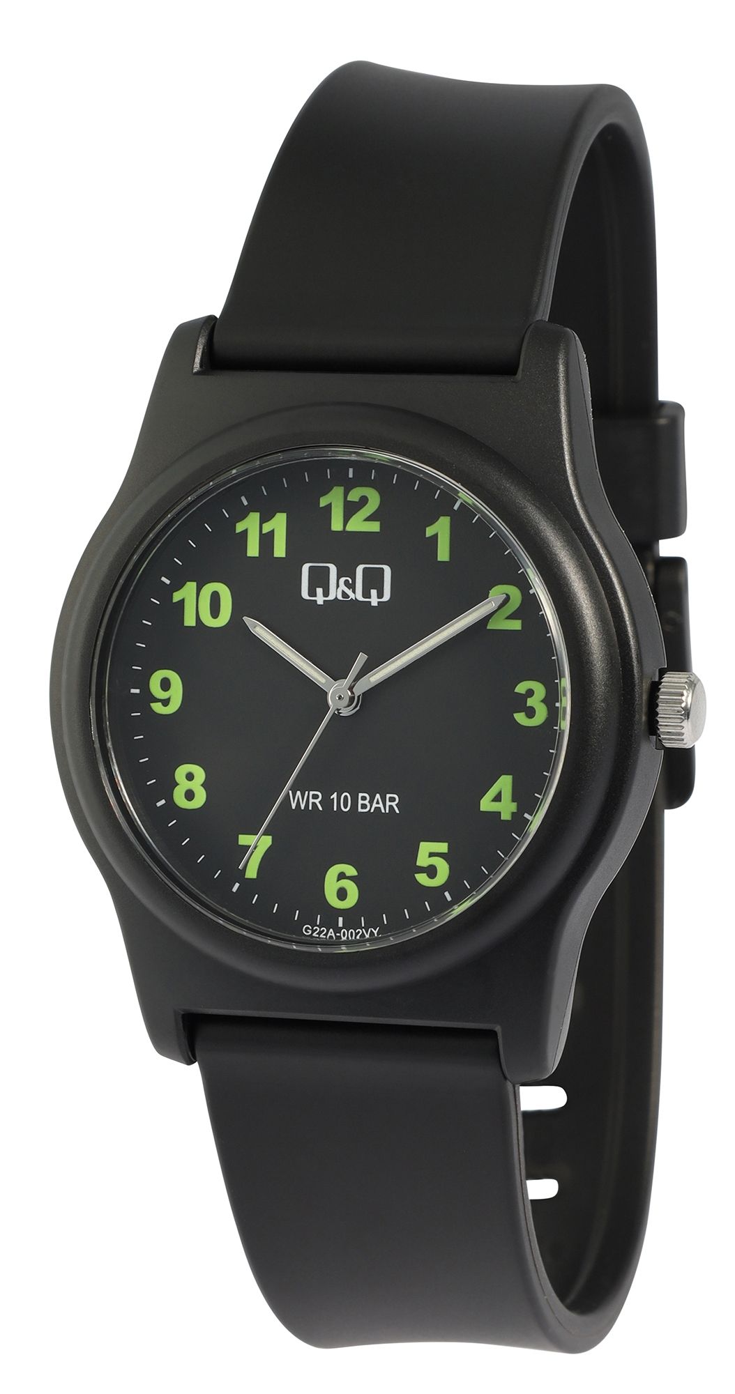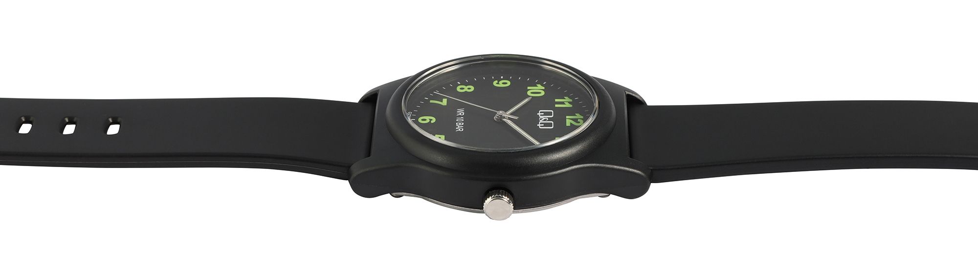 Diese sportliche Armbanduhr der Marke Q&Q (by Citizen Watch Co. LTD) ist in klassischem Schwarz gehalten. Sie bietet nicht nur ein tolles Design, sondern überzeugt auch durch Widerstandsfähigkeit und Zuverlässigkeit. Die perfekte Wahl, um Ihrem Alltagslook eine sportliche und schlichte Note zu verleihen!