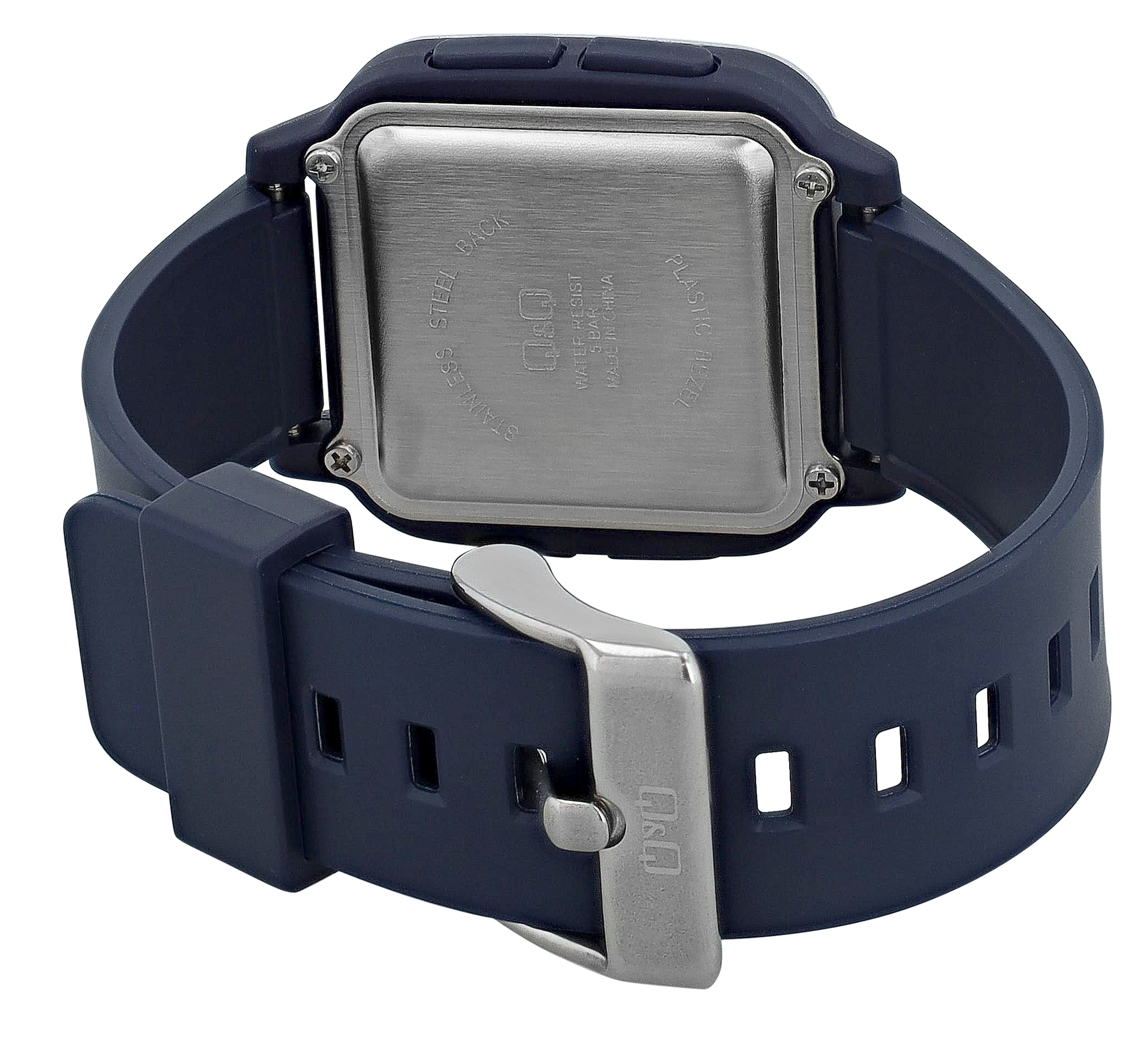 Das leichte, aber widerstandsfähige Kunststoffgehäuse (34 mm Länge x 34 mm Breite x 11 mm Höhe) beherbergt ein präzises Quarzuhrwerk. Ein Edelstahl-Gehäusedeckel sorgt für zusätzliche Langlebigkeit und Schutz. Das robuste Kunststoffglas, eingerahmt von einer silberfarbenen Lünette, bewahrt das Display zuverlässig vor Kratzern und Abnutzung. Mit einer Wasserdichtigkeit von bis zu 5 Bar ist diese Uhr ideal für den täglichen Gebrauch und widersteht Spritzwasser sowie kurzzeitigem Eintauchen.
