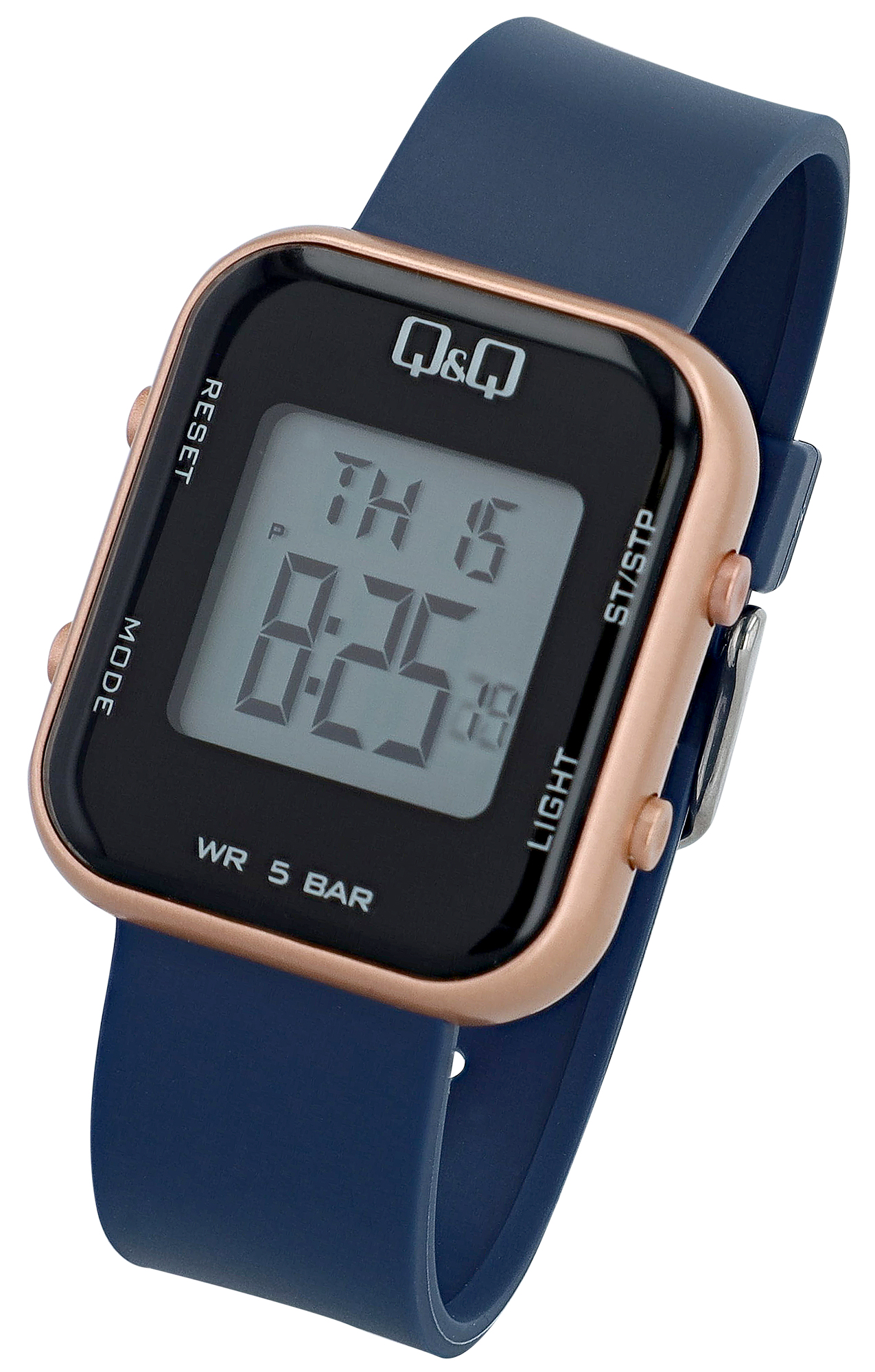 Entdecke einen Zeitmesser, der entwickelt wurde, um die Anforderungen eines aktiven Lebensstils zu erfüllen, ohne Kompromisse bei Design oder Funktionalität einzugehen. Die digitale Unisex Sportuhr von Q&Q - by Citizen Watch Co. LTD (by Citizen Watch Co. LTD) in Blau mit roségoldfarbenem Gehäuse und vielen Highlights, die begeistern, ist der perfekte Begleiter für Sport, Alltag und jedes andere Abenteuer. Robust und zuverlässig garantiert die digitale Sportuhr mit einer Wasserdichtigkeit von 5 Bar, dass sie Wasser und Schweiß standhält – ideal für Trainingseinheiten, Regen oder den täglichen Einsatz. Gefertigt mit einem widerstandsfähigen Kunststoffgehäuse mit einer Länge und Breite von 40 mm x 34 mm, bei einer Höhe von 11 mm, und einem komfortablen und hautfreundlichem Resinarmband (Gesamtlänge der Uhr 22,5 cm), bietet sie höchste Langlebigkeit. Die robuste Edelstahl-Dornschließe hält die Uhr zuverlässig am Handgelenk.