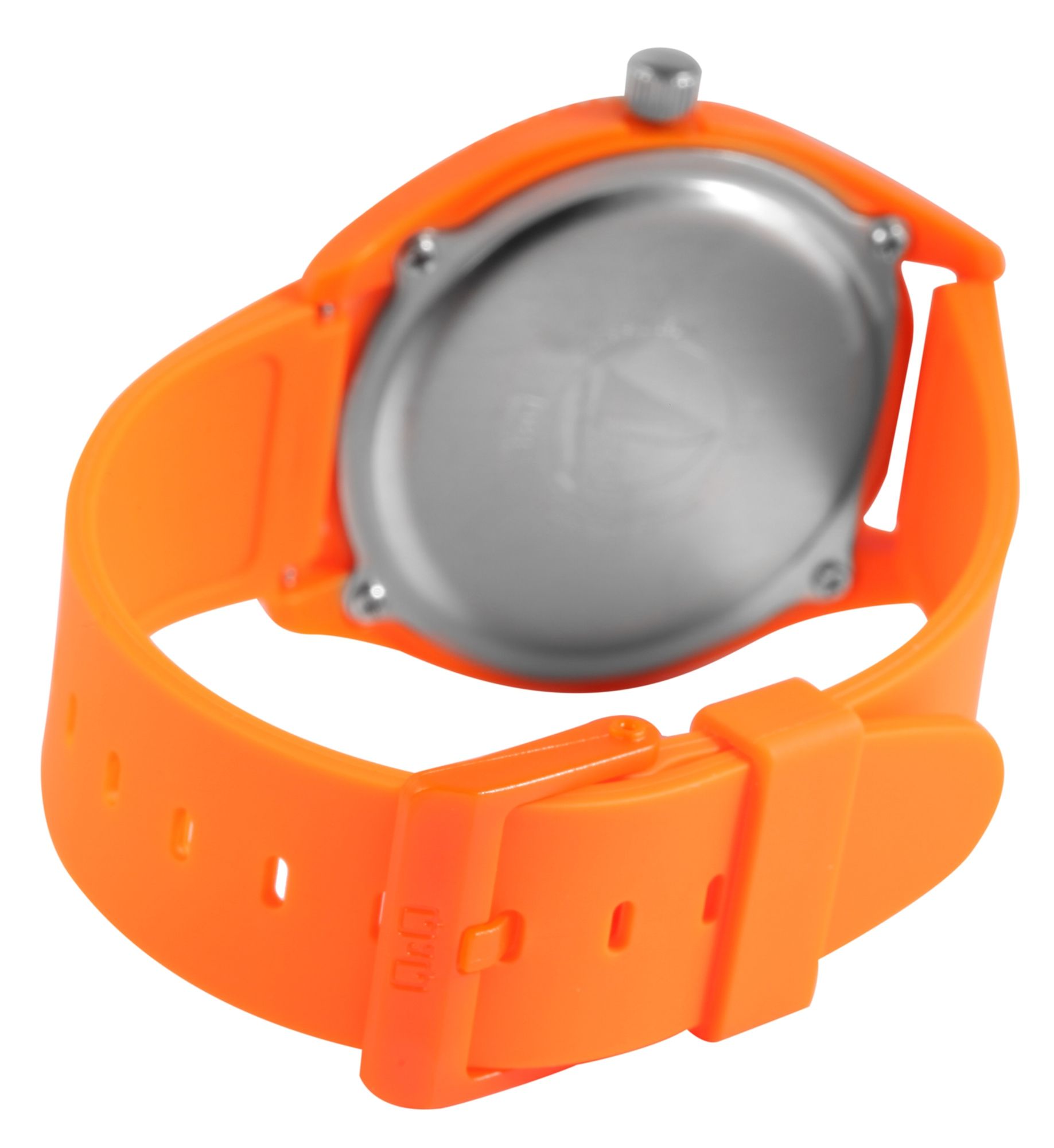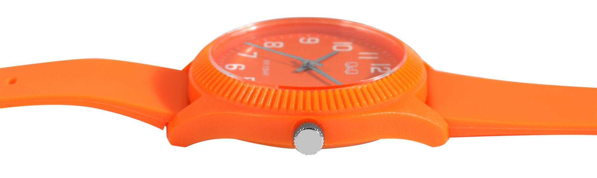 Die analoge 3-Zeiger Unisexarmbanduhr der Marke Q&Q - by Citizen Watch Co. LTD verfügt über ein hochwertiges und ganggenaues Quarzuhrwerk. Das orangefarbene Silikonarmband ist am Anstoß 21 mm breit und lässt sich mit einer orangenen Dornschließe öffnen und schließen. Die Gesamtlänge der Uhr beträgt 25 cm. Das orangene Kunststoffgehäuse mit Mineralglas hat eine Abmessung von 41 mm im Durchmesser und einer Gehäusehöhe von 11 mm. Der Gehäuseboden ist aus Edelstahl gefertigt und mit vier Edelstahlschrauben am Gehäuse befestigt. Die Uhrzeit lässt sich durch das orangefarbene Zifferblatt mit weißen Ziffern im arabischen Stil ideal ablesen. Des Weiteren bietet die Armbanduhr durch das weiche Silikonarmband einen angenehmen Tragekomfort und lässt sich durch das sportliche Design wunderbar kombinieren. Zudem erweist sich das Material als besonders hautfreundlich und eignet sich dadurch ideal für Allergiker.