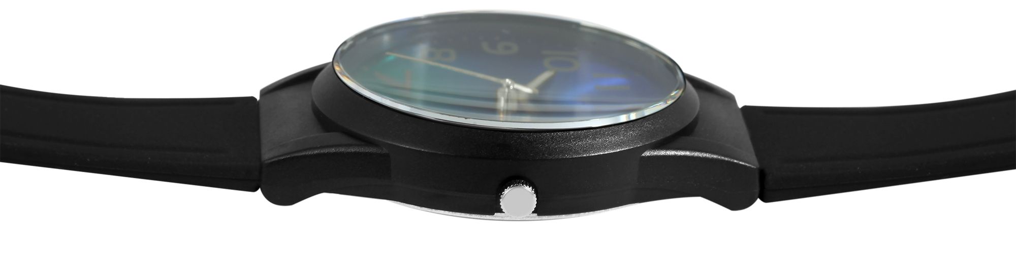 Die analoge 3-Zeiger Unisexarmbanduhr der Marke Q&Q verfügt über ein hochwertiges und ganggenaues Quarzuhrwerk. Das Silikonarmband ist am Anstoß 18 mm breit und lässt sich mit einer Dornschließe öffnen und schließen. Die Gesamtlänge der Uhr beträgt 25 cm. Das Kunststoffgehäuse mit Kunststoffglas hat eine Abmessung von 38 mm im Durchmesser und einer Gehäusehöhe von 10 mm. Der Gehäuseboden ist aus Edelstahl gefertigt und mit vier Edelstahlschrauben am Gehäuse befestigt. Die Besonderheit bei dieser Uhr ist das Zifferblatt, welches je nach Lichteinfluss und Reflexion unterschiedliche Farbeffekte ausweist. Dabei lässt sich die Uhrzeit aufgrund der Ziffern im arabischen Stil ideal ablesen. Des Weiteren bietet die Armbanduhr durch das weiche Silikonarmband einen angenehmen Tragekomfort und lässt sich aufgrund der pflegeleichten Materialien besonders leicht reinigen. Diese Armbanduhr überzeugt auf ganzer Linie! Die hautfreundlichen Materialien, die Wasserdichtigkeit von 10 ATM und das sportive Design lassen diesen Zeitmesser zur perfekten Uhr für Jung und Alt werden.