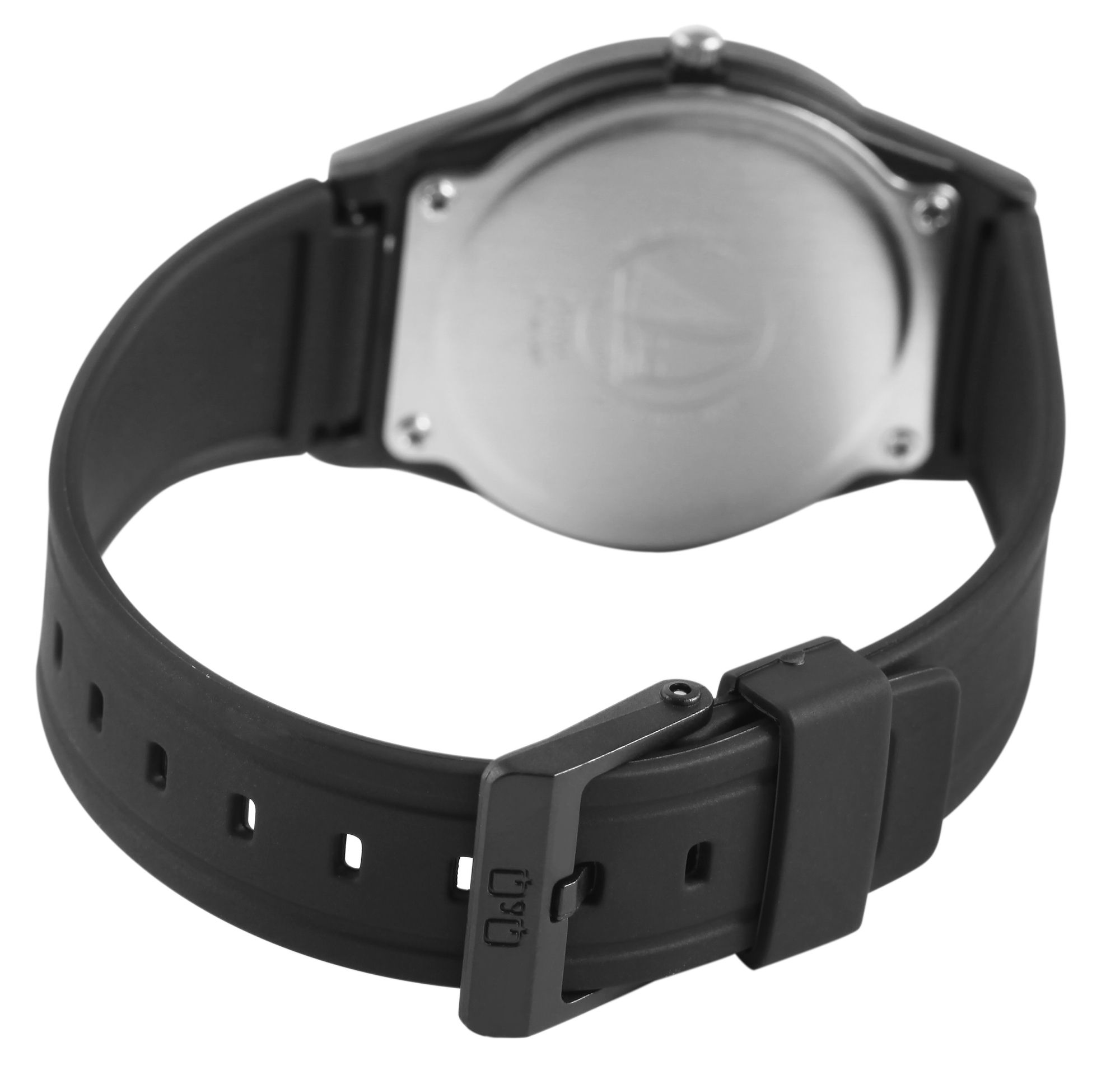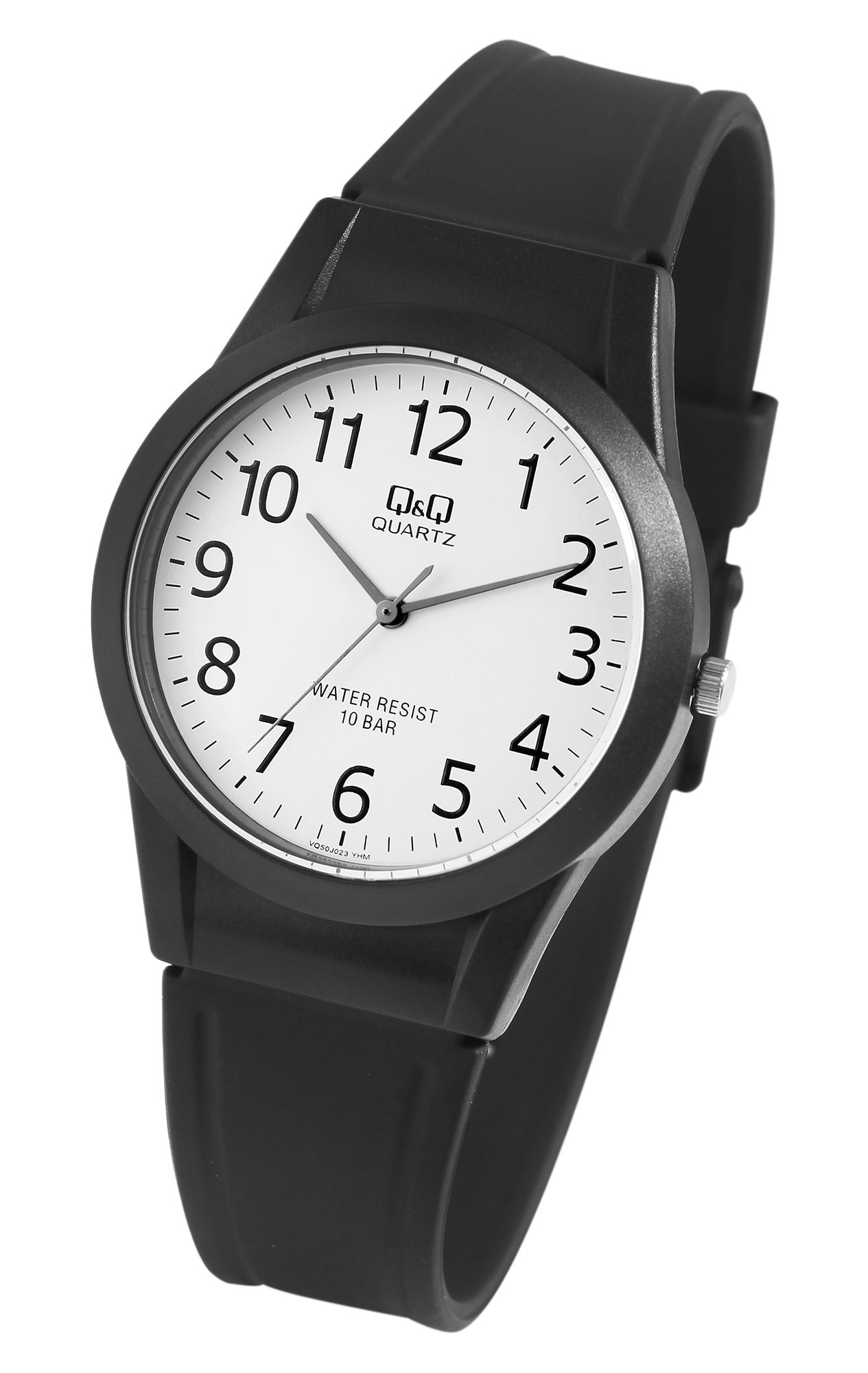 Die analoge 3-Zeiger Armbanduhr der Marke Q&Q verfügt über ein hochwertiges Quarzuhrwerk. Das schwarze Silikonarmband ist am Anstoß 21 mm breit und lässt sich mit einer schwarzen Dornschließe öffnen und schließen. Die Gesamtlänge der Uhr beträgt 25 cm. Das schwarze Kunststoffgehäuse mit Mineralglas hat einen Durchmesser von 38 mm und eine Gehäusehöhe von 10 mm. Der Gehäuseboden ist aus Edelstahl gefertigt. Dank des Kontrastes des weißen Zifferblattes und den schwarzen Zeigern und Indexen hat man die Uhrzeit immer gut im Blick. Zudem hat die Uhr hat eine Wasserdichtigkeit von 10 bar.