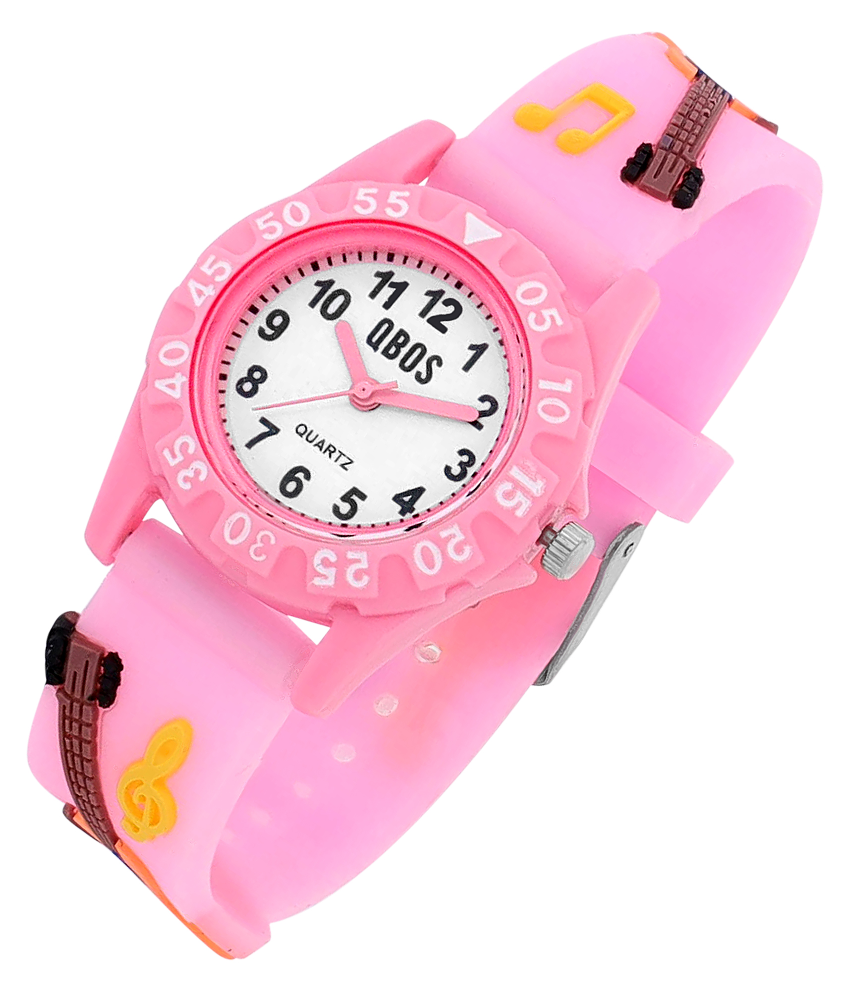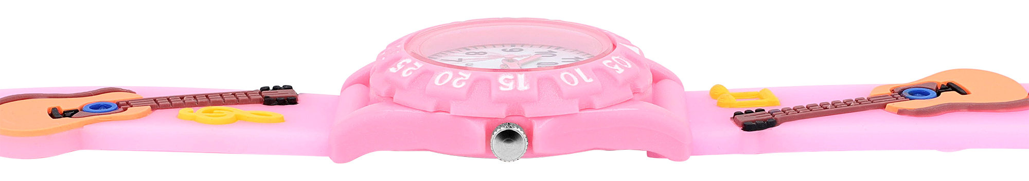 Qbos Kinderuhr mit Silikonband, bunt, Motiv Gitarre, Ø 28 mm, hellrosa