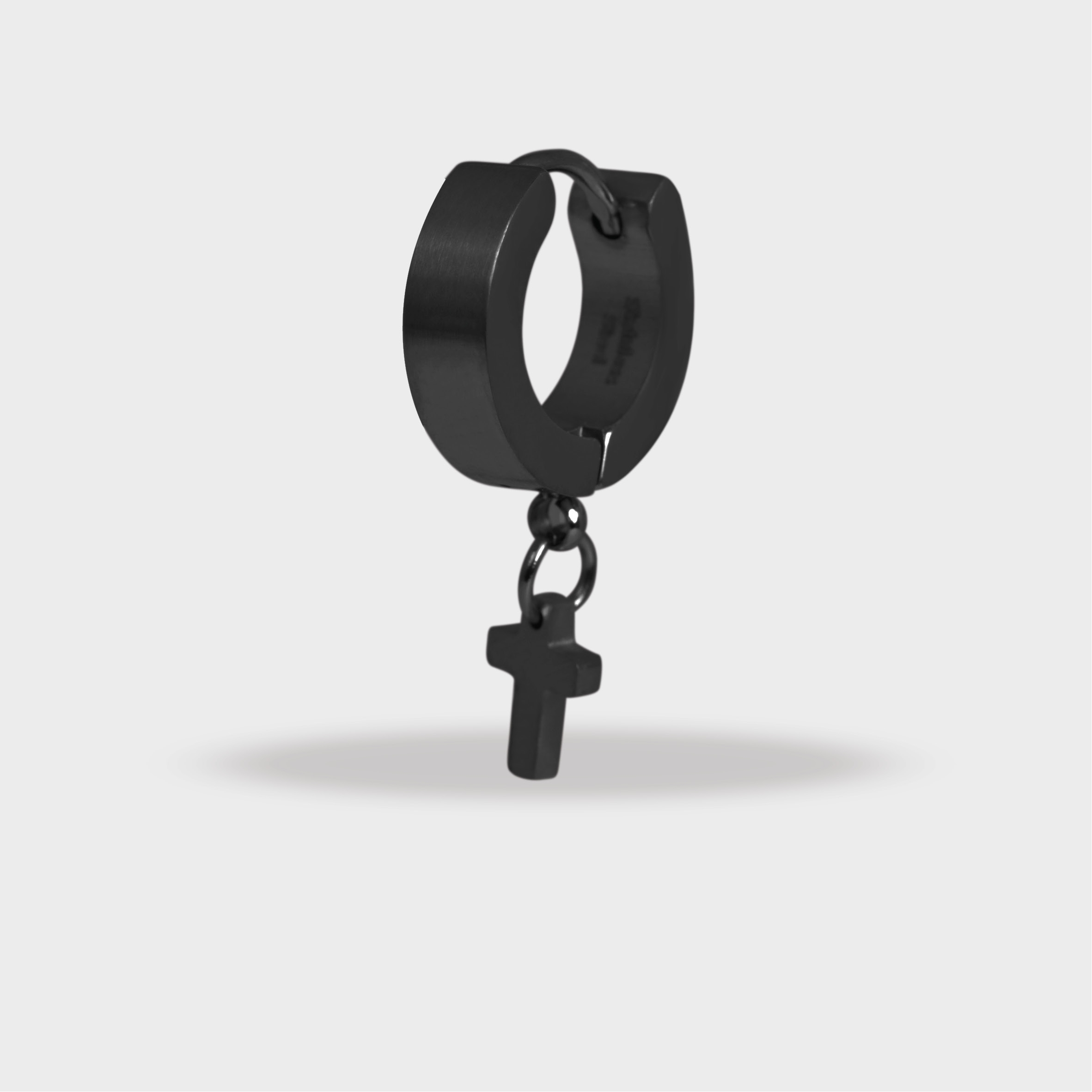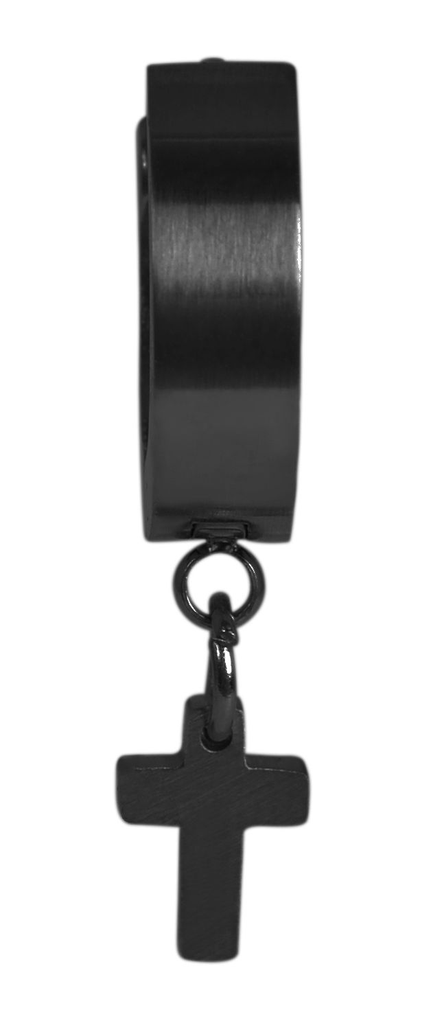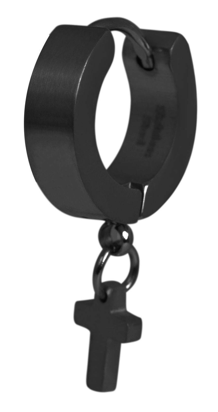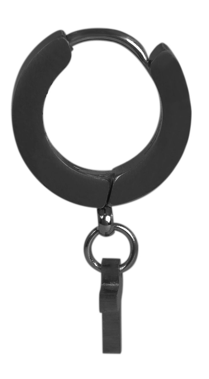 Die Klapp-Creole der Marke Raptor ist aus Edelstahl gefertigt und in schwarz und silberfarben erhältlich. Der Innendurchmesser der Creole beträgt 8,5 mm, sie ist 4 mm breit und die Oberfläche ist mattiert. An der Unterseite der Creole ist eine Öse befestigt, an der ein kleiner Kreuzanhänger angebracht ist. Dieser ist 7 mm lang, 5 mm breit und hat eine Stärke von 1,4 mm. Die Creole ist nur einzeln erhältlich und eignet sich daher hervorragend als Blickfang oder für Personen mit nur einem Ohrloch.