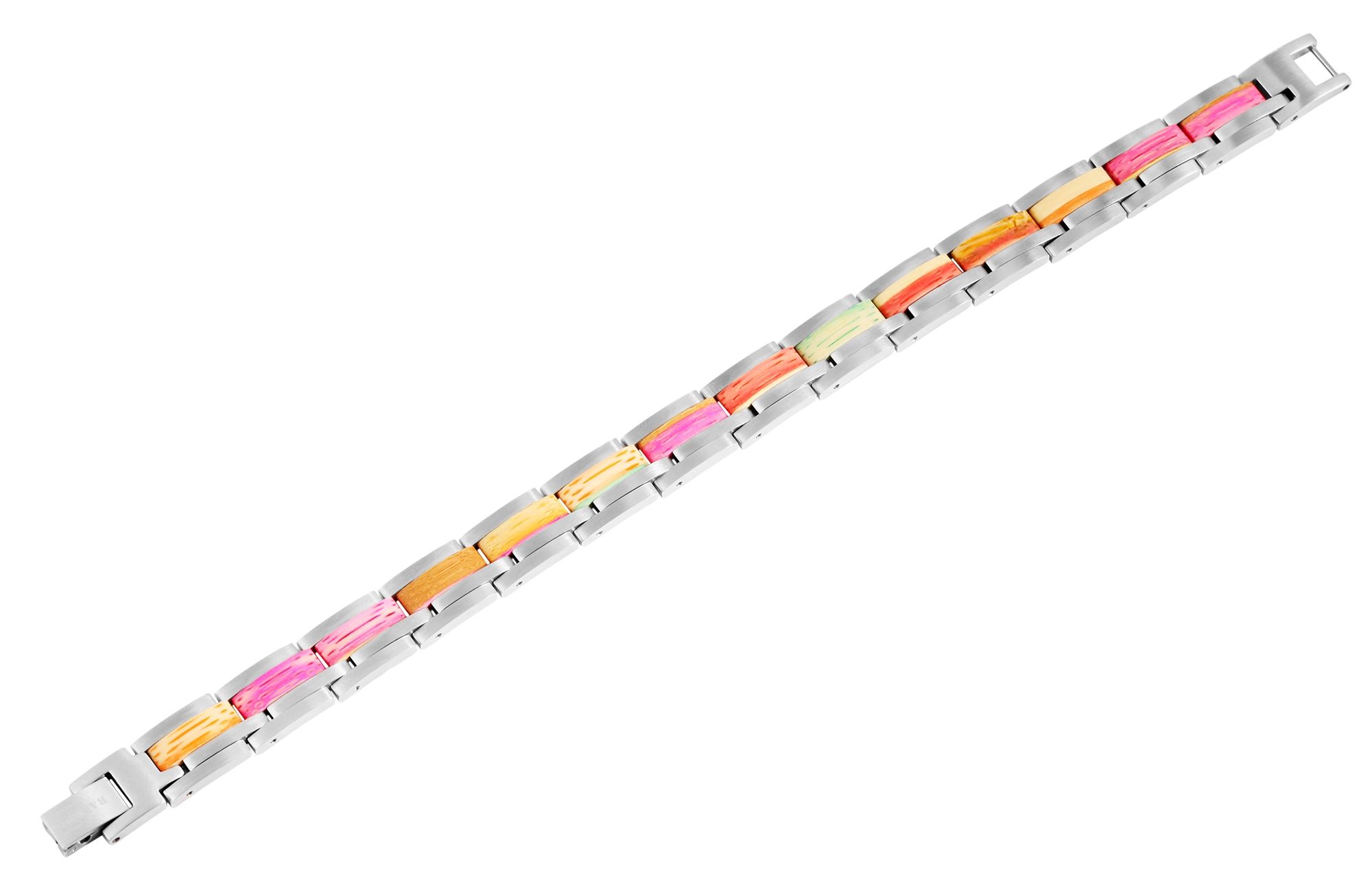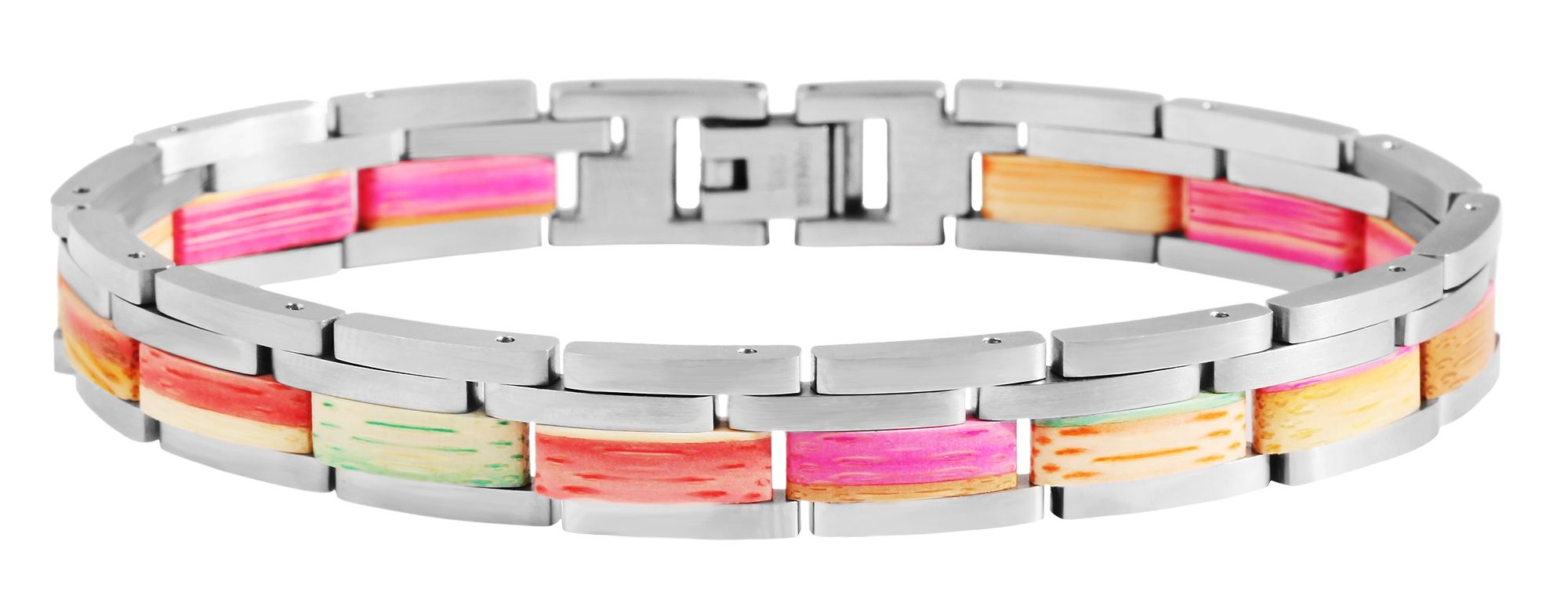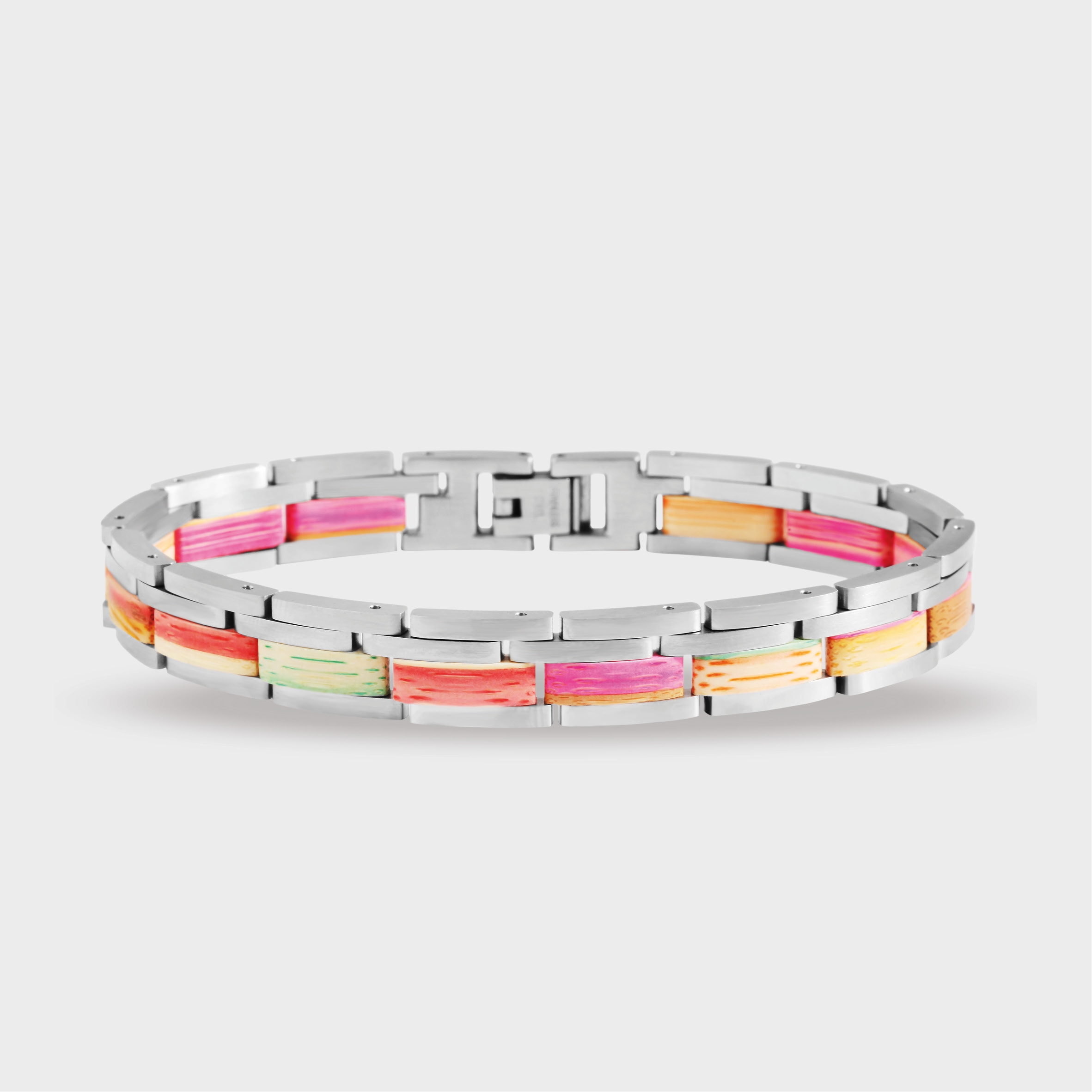 Das Schmuckarmband der Marke Raptor ist aus silberfarbenem Edelstahl und mehrfarbigem Bambus gefertigt und besteht aus 16 mit Stiften verbundenen Elementen. Das Armband erscheint durch die Art und Anordnung der Elemente vierreihig. Das optische Highlight dieses besonderen Schmuckstückes sind die 4 mm breiten Holzelemente, die seitlich in das Schmuckarmband eingearbeitet wurden. Dadurch, dass die Elemente mit Stiften verbunden sind, ist es möglich, das Armband jeder Handgelenksgröße anzupassen. Das Schmuckstück hat eine Abmessung von 10 mm in der Breite und einer Materialstärke von 3 mm. Die Gesamtlänge des Armbandes beträgt 21 cm. Durch die Kombination von silberfarbenem Edelstahl und buntem Bambus präsentiert sich das Raptor-Schmuckarmband in einem ganz besonderen Look. Es ist vor allem durch die Verarbeitung dieser beiden Materialien vielseitig kombinierbar und komplettiert einfach jedes Outfit. Besonders gut kombinieren lässt sich dieses einzigartige Schmuckstück zu den Raptor Holzuhren. Einzeln oder in Kombination mit einer Holzuhr - es ist ein unverzichtbares Must-Have!