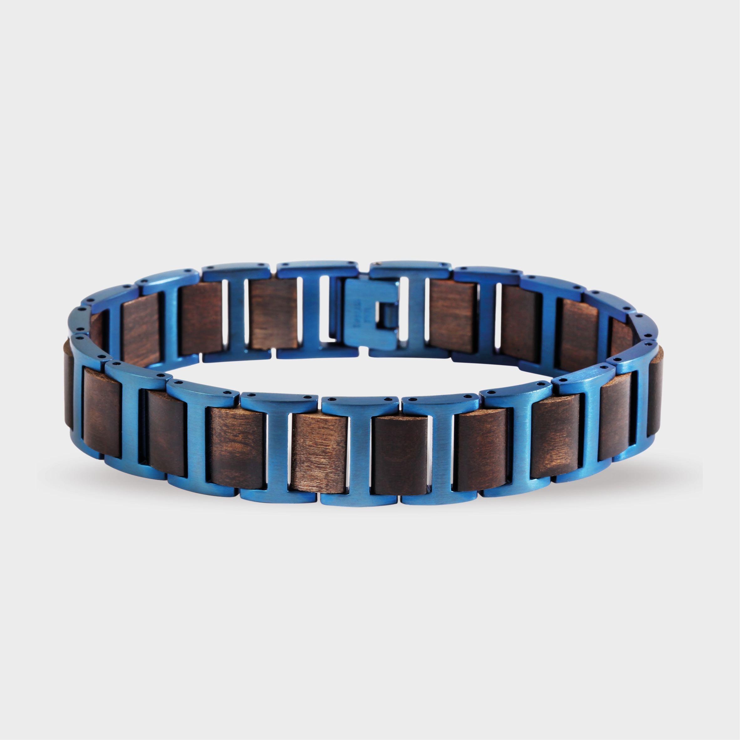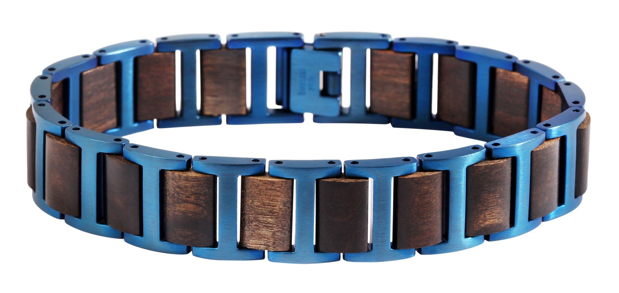 Das Schmuckarmband der Marke Raptor ist aus Edelstahl und Holz gefertigt. Es besteht aus 19 mit Stiften verbundenen Elementen, dessen äußere Kanten aus blauem Edelstahl und der mittlere Teil aus dunkelbraunem Sandelholz gefertigt ist. Dadurch, dass die Elemente mit Stiften verbunden sind, ist es möglich, das Armband jeder Handgelenksgröße anzupassen. Das Schmuckstück hat eine Abmessung von 14 mm in der Breite und einer Materialstärke von 4 mm. Die Gesamtlänge des Armbandes beträgt 20 cm. Durch die Kombination von blauem Edelstahl und dunkelbraunem Sandelholz präsentiert sich das Raptor-Schmuckarmband in einem ganz besonderen Look. Es ist vor allem durch die Verarbeitung dieser beiden Materialien vielseitig kombinierbar und komplettiert einfach jedes Outfit. Besonders gut kombinieren lässt sich dieses einzigartige Schmuckstück zu den Raptor Holzuhren. Einzeln oder in Kombination mit einer Holzuhr - es ist ein unverzichtbares Must-Have!