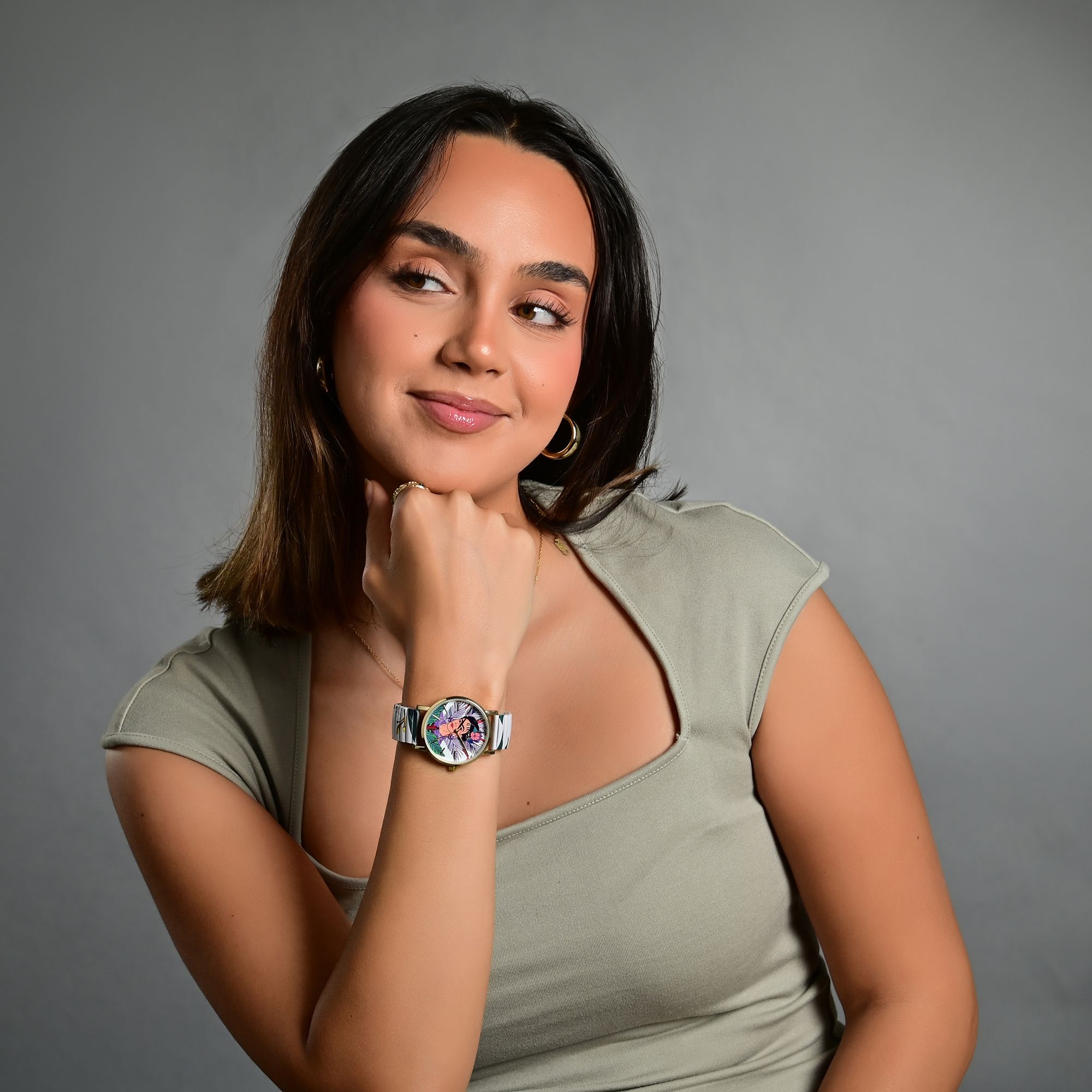 Das Zifferblatt mit Strichindex präsentiert sich wie eine Leinwand, auf der sich die Motive Frida Kahlos entfalten. Die Farben umfassen lebhafte Nuancen wie Blau, Rot, Grün oder Gelb, die perfekt angeordnet sind. In dieser Pracht finden sich Verweise auf die berühmten Gemälde von Frida Kahlo. Mit den kunstvollen Details erhält die 3 Zeiger Uhr eine unverkennbare künstlerische Identität und machen sie zu einem tollen Blickfang.