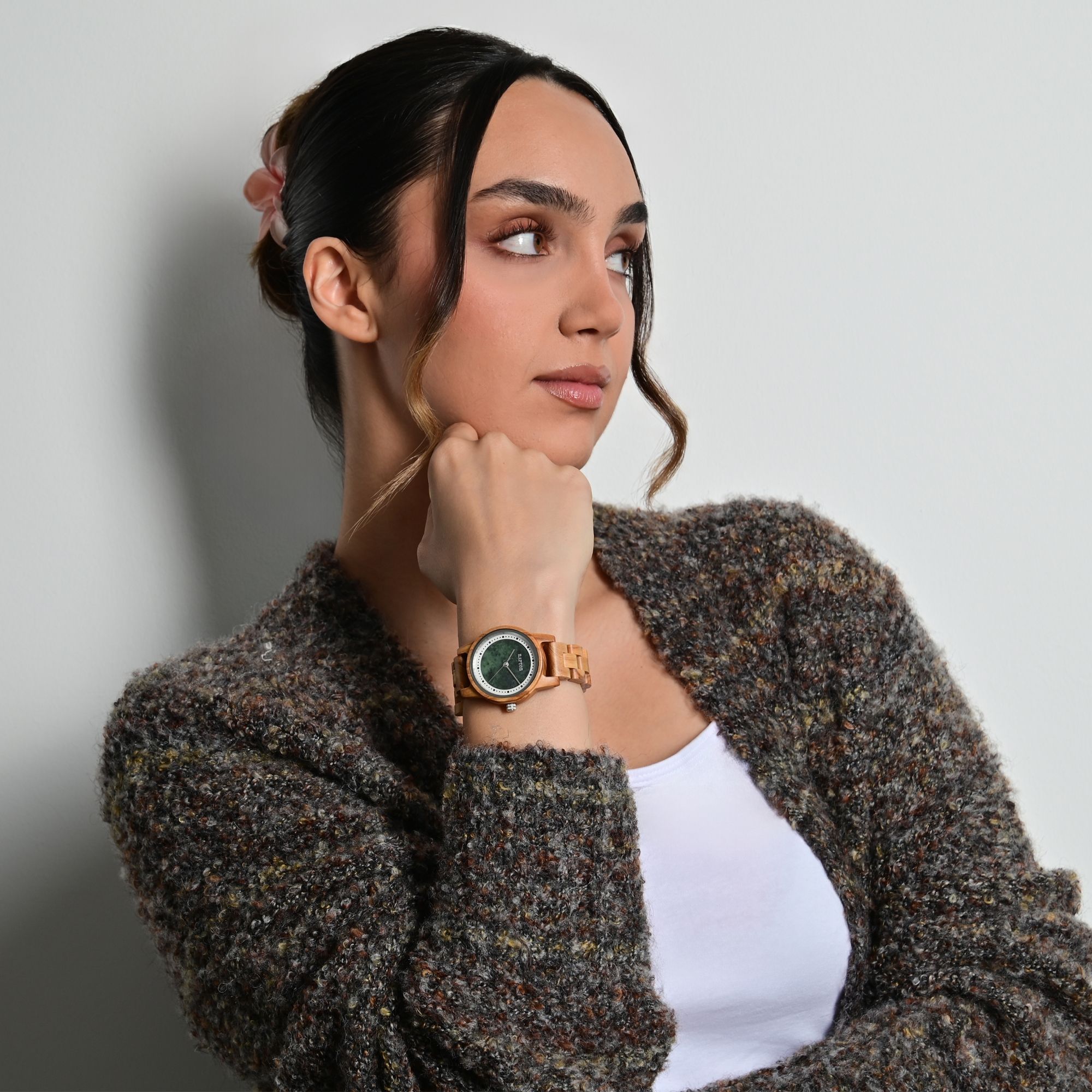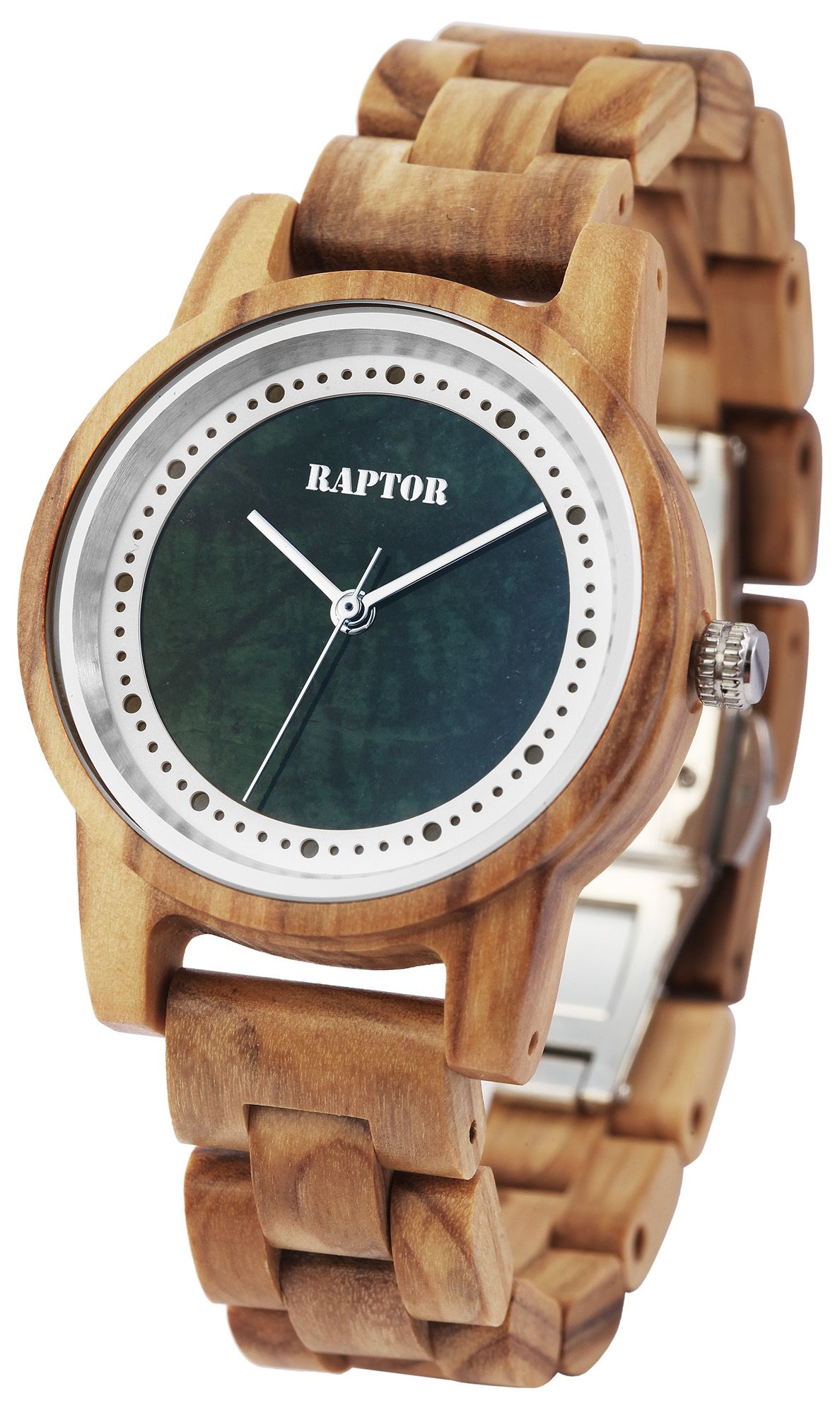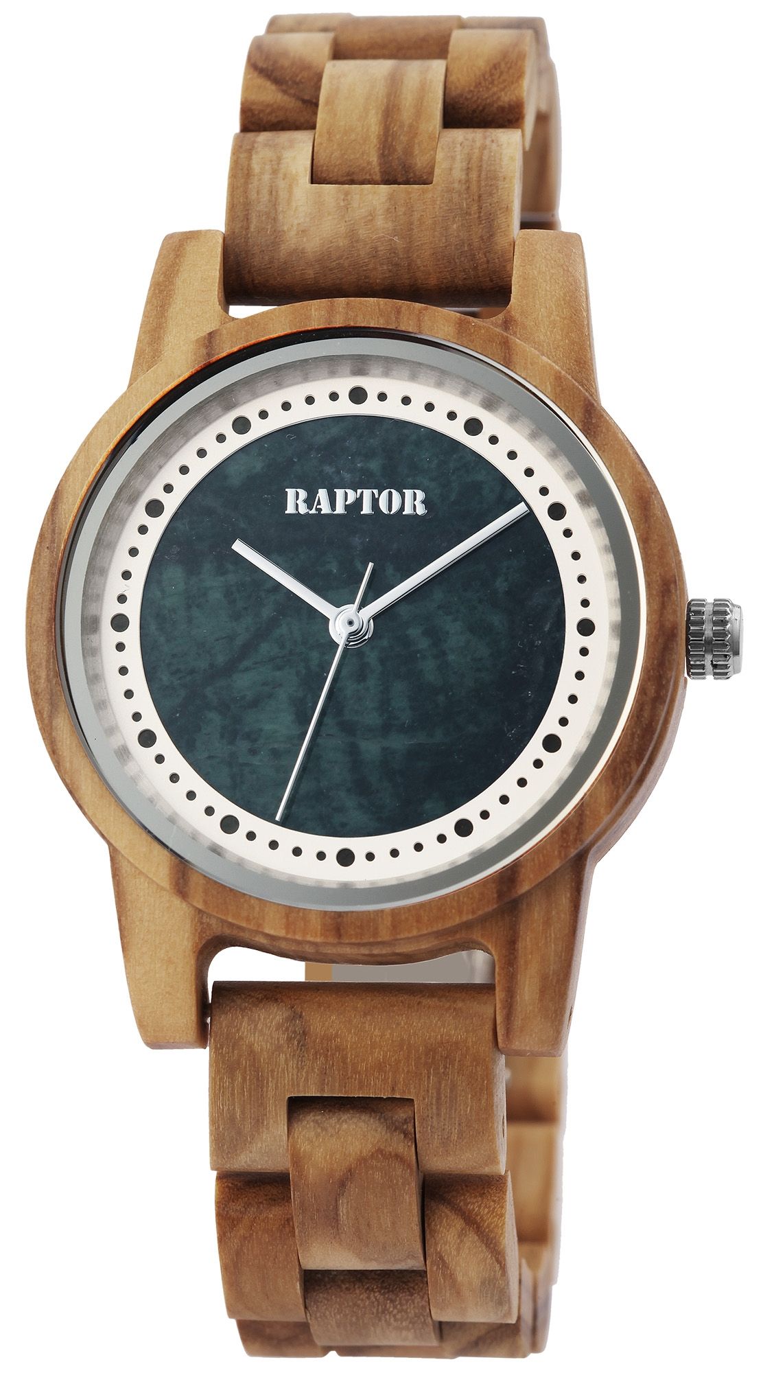 Produktinformationen "Raptor Damenarmbanduhr "Rock Nature" aus Olivenholz, Zifferblatt türkiser Marmor"