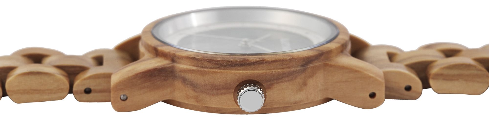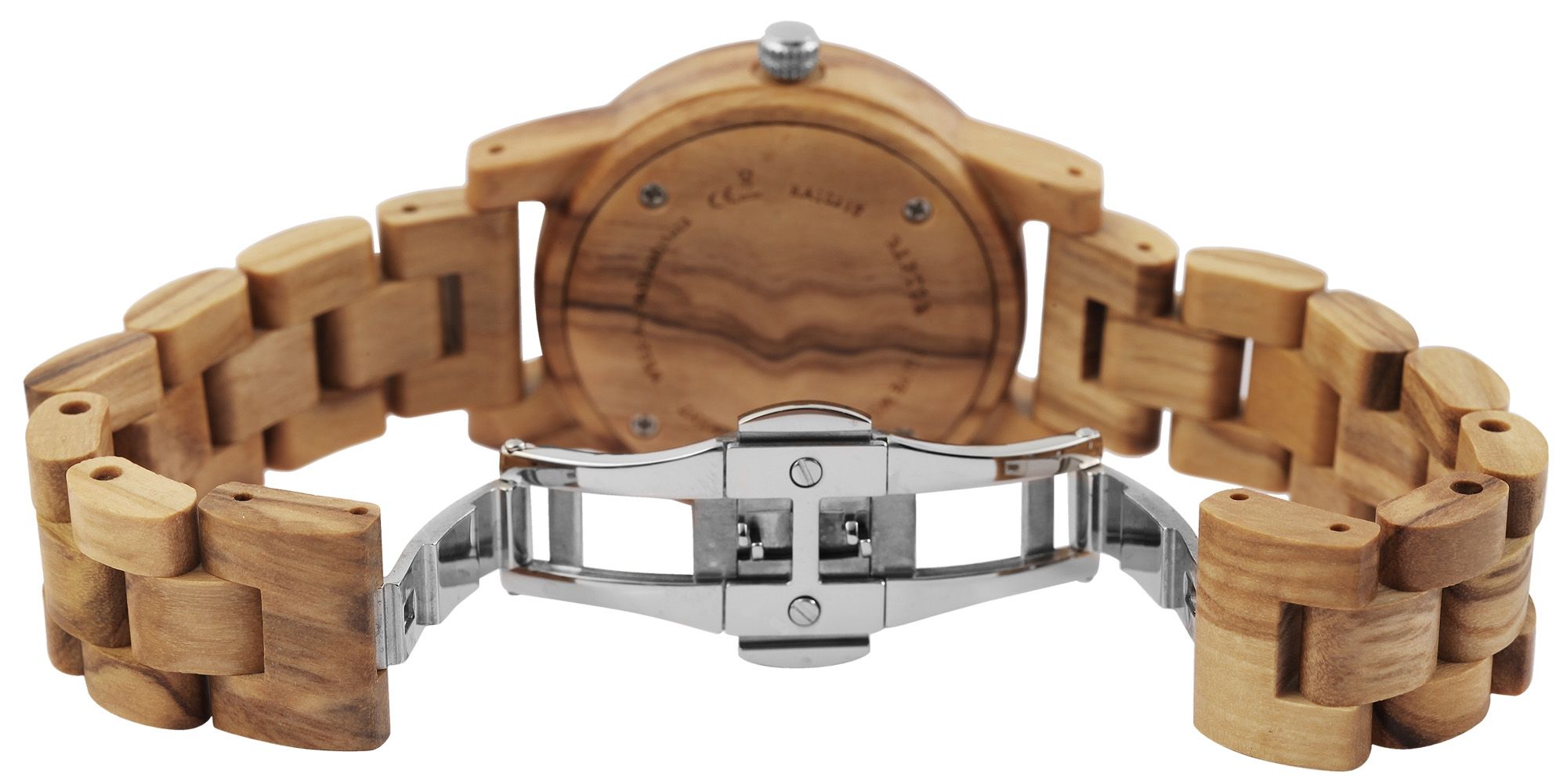 Die analoge 3-Zeiger Damenarmbanduhr der Marke Raptor verfügt über das hochwertige Quarzuhrwerk Miyota GL 30. Das Olivenholz Armband ist am Anstoß 16 mm breit und lässt sich über eine Edelstahl-Butterflyfaltschließe öffnen und schließen. Die Gesamtlänge der Uhr beträgt 19 cm. Das Olivenholz Gehäuse mit Mineralglas hat eine Abmessung von 36 mm im Durchmesser und einer Gehäusehöhe von 11 mm. Der Gehäuseboden ist ebenfalls aus Olivenholz gefertigt. Ein optisches Highlight ist der 1 mm breite Spiegelrand auf dem Mineralglas. Dieser verleiht im Zusammenspiel mit den Zeigern der Uhr einen besonderen, eleganten Look. Mit dieser Uhr tragen Sie einen absoluten Hingucker am Handgelenk, den man zu jedem Anlass kombinieren kann. Durch das leichte Material passt sie sich perfekt dem Handgelenk an und ist angenehm zu tragen. Als Zubehör zu Ihrem Produkt erhalten Sie eine Garantiekarte und eine Originalbox der Marke Raptor.