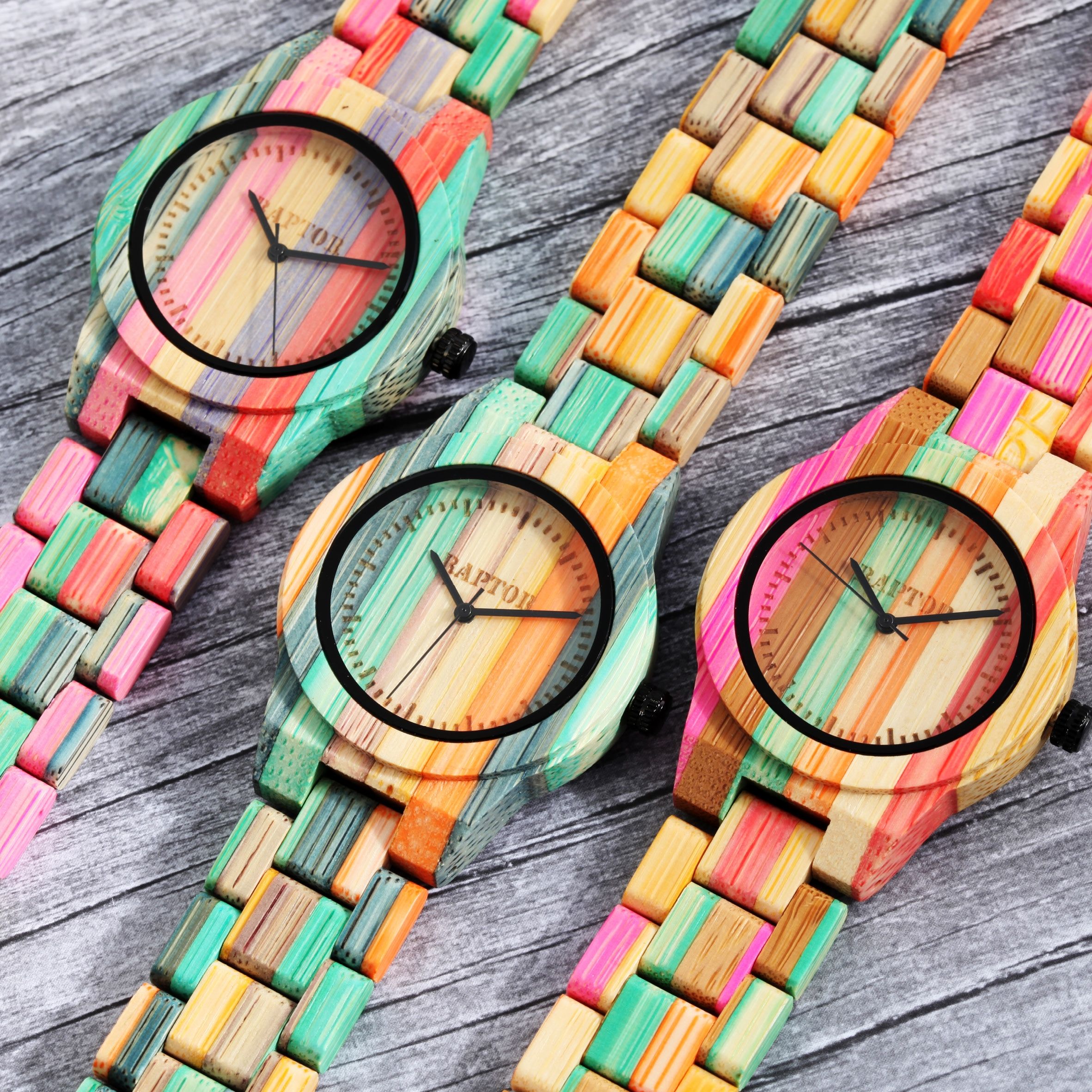 Die analoge 3-Zeiger Damenarmbanduhr der Marke Raptor verfügt über ein hochwertiges Quarzuhrwerk. Das mehrfarbige Gliederarmband aus Bambus ist am Anstoß 20 mm breit und lässt sich über eine silberfarbene Edelstahlfaltschließe öffnen und schließen. Die Gesamtlänge der Uhr beträgt 23,5 cm. Das mehrfarbige Bambusgehäuse mit Mineralglas hat eine Abmessung von 38 mm im Durchmesser und einer Gehäusehöhe von 11 mm. Ein besonderer Hingucker ist das Mineralglas, welches einen 1,5 mm breiten, schwarzen Spiegelrand hat. Zusammen mit der schwarzen Krone rundet dieser den einzigartigen Look der Uhr ab. Das Zifferblatt ist ebenfalls aus Bambus gefertigt und zeigt sich in denselben Farben, wie auch das Band und das Gehäuse. Die schwarzen Zeiger passen sich optisch gut dem Gesamtbild der Uhr an. Mit der Raptor Holzuhr tragen Sie einen absoluten Hingucker am Handgelenk, den man zu jedem Anlass kombinieren kann. Durch das leichte Material passt sie sich perfekt dem Handgelenk an und ist angenehm zu tragen. Als Zubehör zu Ihrem Produkt erhalten Sie eine Garantiekarte und eine Originalbox der Marke Raptor. Die Uhr eignet sich perfekt als Geschenk. Zum Beispiel zum Geburtstag, zum Muttertag, zu Weihnachten und zum Valentinstag.