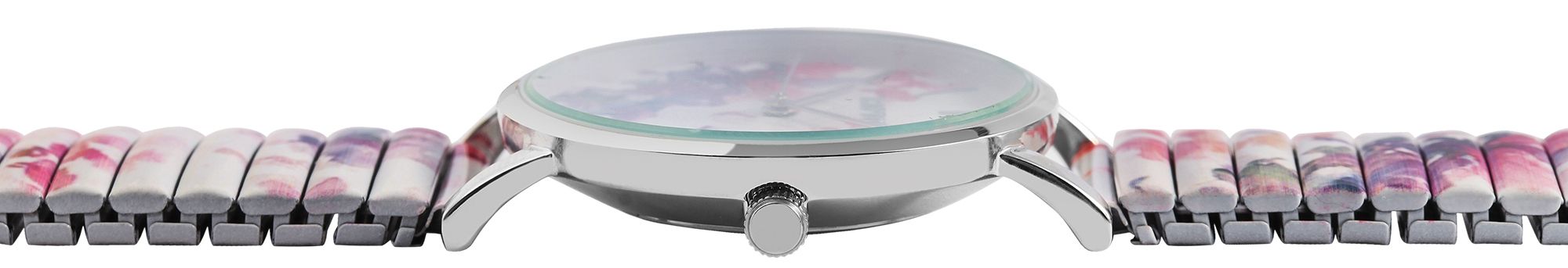 Die analoge 3-Zeiger Damenuhr mit Zugarmband verfügt über ein hochwertiges Quarzuhrwerk. Das weiße Zugarmband aus Edelstahl mit floralen Mustern in verschiedenen Rosa- und Violetttönen ist am Anstoß 18 mm breit und lässt sich aufgrund des flexiblen Armbandes besonders einfach über das Handgelenk ziehen. Zudem bietet die Uhr aufgrund der Leichtigkeit und der Flexibilität einen sehr hohen Tragekomfort. Die Gesamtlänge der Uhr beträgt 18,5 cm. Die Länge des Armbandes ist auf jedes Handgelenk anpassbar. Das silberfarbene Metallgehäuse mit Mineralglas hat eine Abmessung von 36 mm im Durchmesser und einer Gehäusehöhe von 8 mm. Der Gehäuseboden ist aus Edelstahl gefertigt. Jede Zugarmbanduhr ist ein optisches Highlight. Das bunte, florale Muster des Bandes findet sich im Zifferblatt wieder und macht die Uhr zu einem rundum gelungenen Hingucker. Die Zeiger und Indexe sind einfarbig und passen sich optisch gut dem Gesamtbild der Uhr an. Bei einer Auswahl zwischen 17 verschiedenen Mustern und drei verschiedenen Gehäusefarben ist auf jeden Fall für jeden Geschmack etwas dabei. Alles in Allem ist sie ein unverzichtbares Schmuckstück, das an keinem Handgelenk fehlen darf.