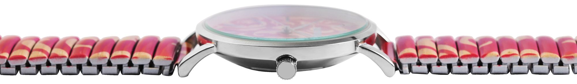 Die analoge 3-Zeiger Damenuhr mit Zugarmband verfügt über ein hochwertiges Quarzuhrwerk. Das pink und rosafarbene Zugarmband aus Edelstahl ist am Anstoß 18 mm breit und lässt sich aufgrund des flexiblen Armbandes besonders einfach über das Handgelenk ziehen. Zudem bietet die Uhr aufgrund der Leichtigkeit und der Flexibilität einen sehr hohen Tragekomfort. Die Gesamtlänge der Uhr beträgt 18,5 cm. Die Länge des Armbandes ist auf jedes Handgelenk anpassbar. Das silberfarbene Metallgehäuse mit Mineralglas hat eine Abmessung von 36 mm im Durchmesser und einer Gehäusehöhe von 8 mm. Der Gehäuseboden ist aus Edelstahl gefertigt. Jede Zugarmbanduhr ist ein optisches Highlight. Das rosa- und pinkfarbene Muster des Bandes findet sich im Zifferblatt wieder und macht die Uhr zu einem rundum gelungenen Hingucker. Die Zeiger und Indexe sind einfarbig und passen sich optisch gut dem Gesamtbild der Uhr an. Bei einer Auswahl zwischen 17 verschiedenen Mustern und drei verschiedenen Gehäusefarben ist auf jeden Fall für jeden Geschmack etwas dabei. Alles in Allem ist sie ein unverzichtbares Schmuckstück, das an keinem Handgelenk fehlen darf.