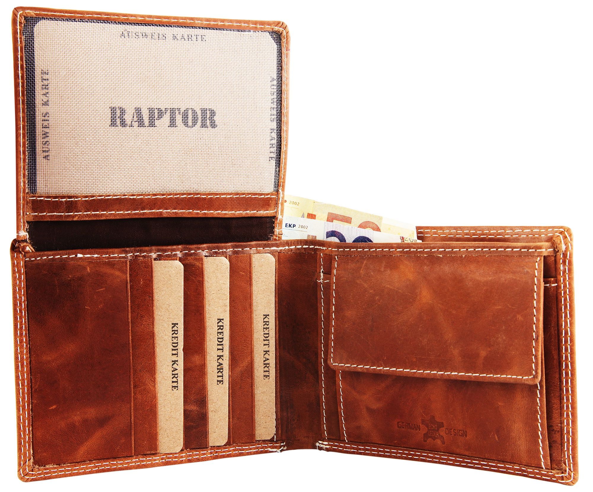 Raptor Herren Geldbörse aus Echtleder. Die Querformat-Geldbörse ist 12 cm breit und 10 cm hoch. Die Farbe ist Hellbraun. Sie verfügt über 2 Geldscheinfächer, ein Kleingeldfach, 12 Kreditkartenfächer, und ein transparentes Ausweisfach.