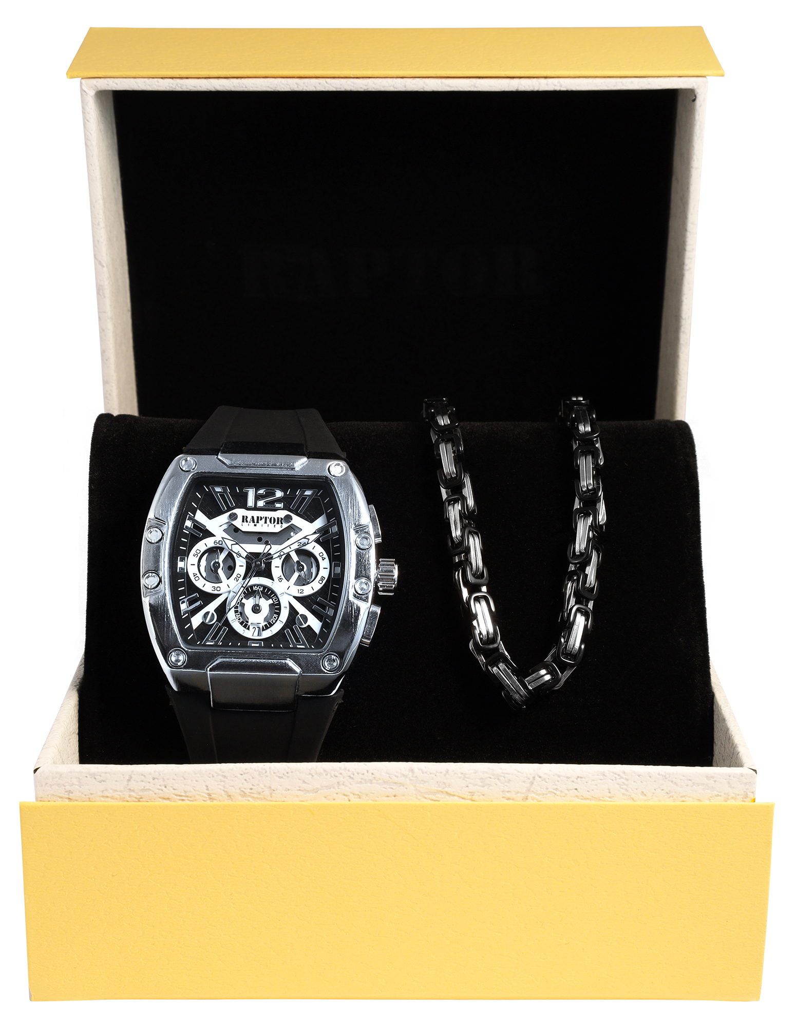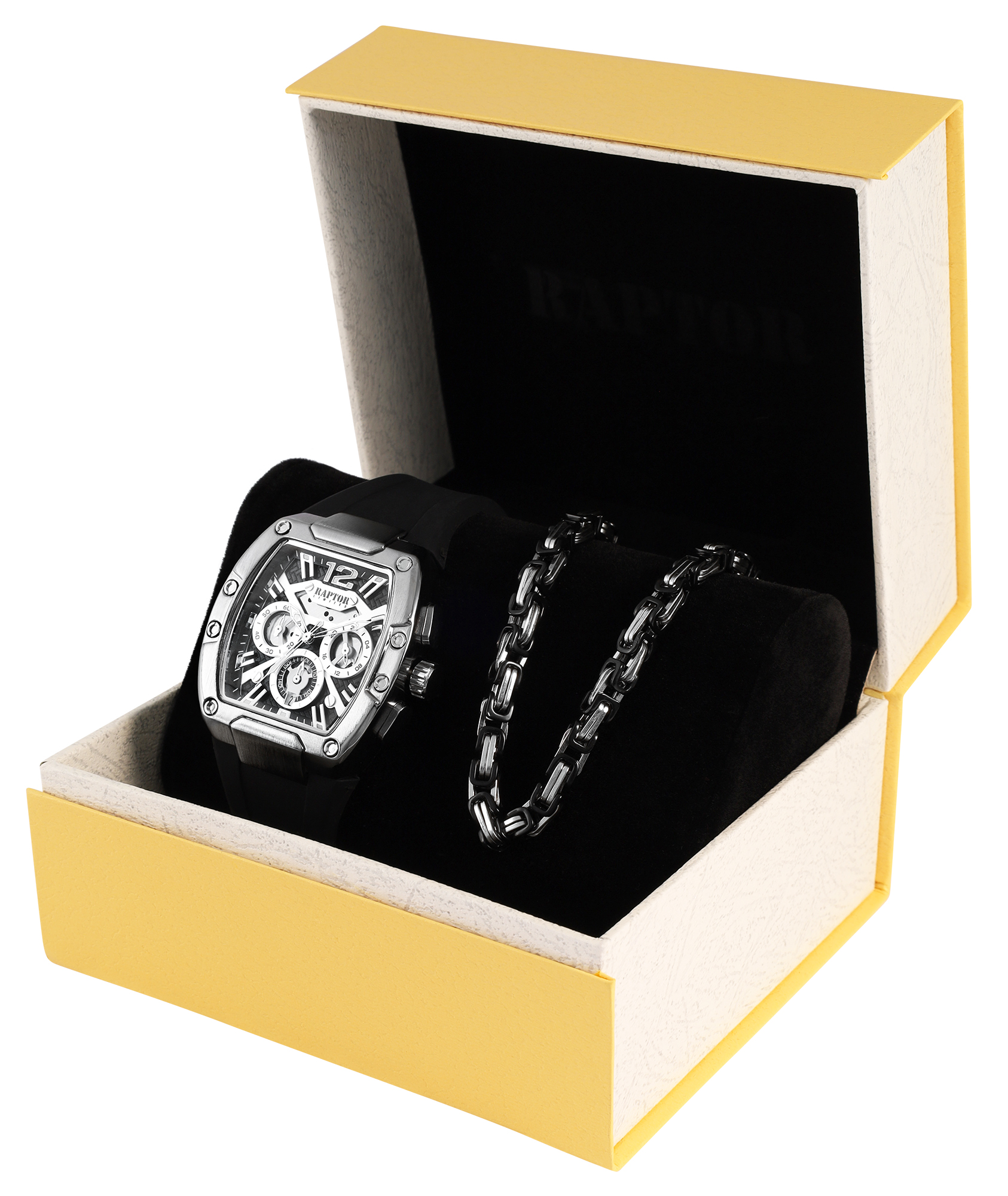 Die exklusiven Raptor Geschenksets bieten die perfekte Kombination aus einer markanten Herrenuhr und einem harmonisch abgestimmten Accessoire (Armband oder Kette). Unsere Geschenksets bieten eine Vielfalt an Designs, die jedem Stil gerecht werden: