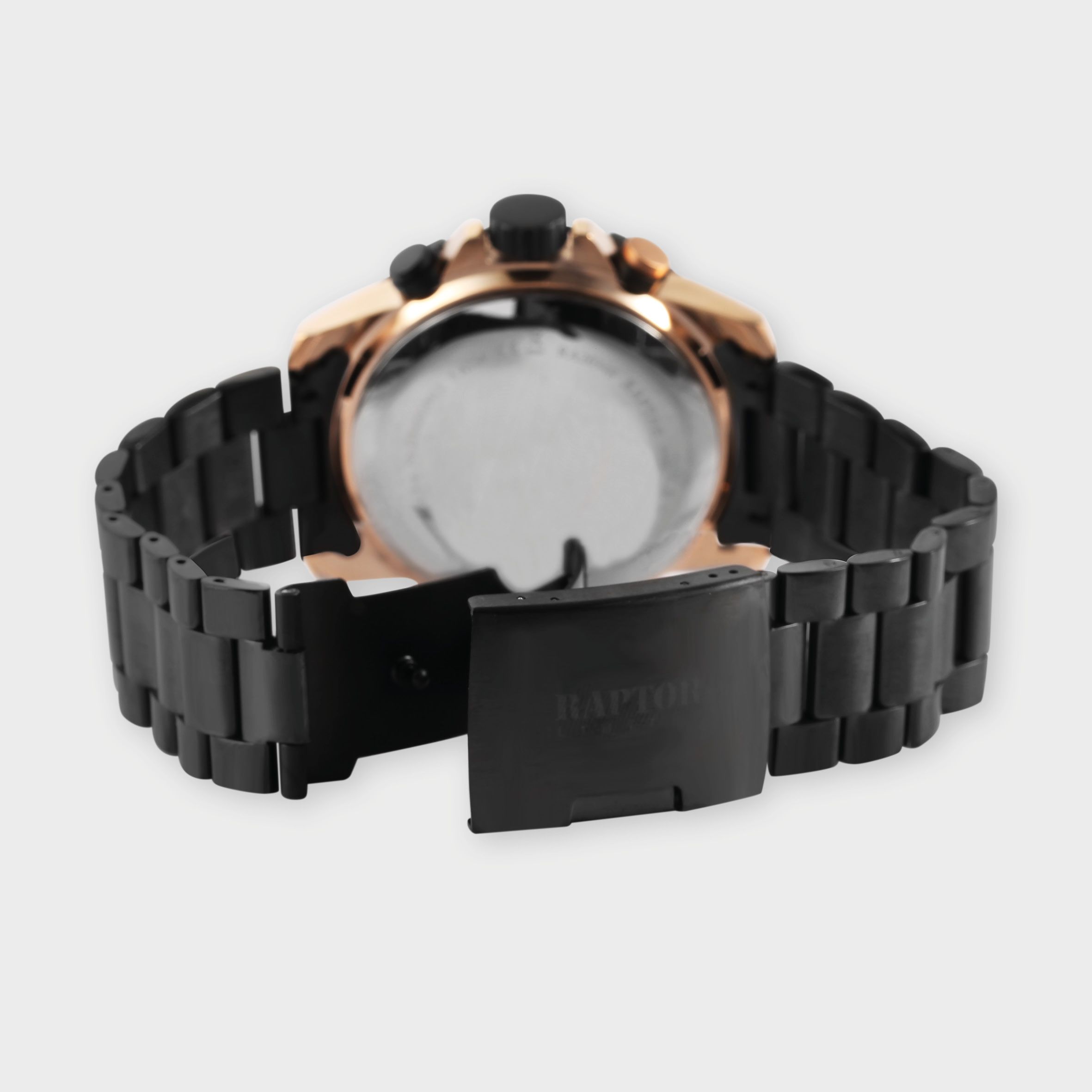 Der Raptor Limited Chronograph "Kifah" überzeugt nicht nur durch sein markantes Design, sondern auch durch seine Funktionalität. Das Herzstück dieser Herrenuhr ist das hochwertige Quarzuhrwerk, das nicht nur für unübertroffene Genauigkeit steht, sondern auch für Zuverlässigkeit und Langlebigkeit sorgt. Die analoge Anzeige mit drei Zeigern und Strichindexeinteilung, sowie drei Totalisatoren auf sechs, neun und zwölf Uhr verleiht dem Chronographen eine klare und leicht ablesbare Ästhetik.