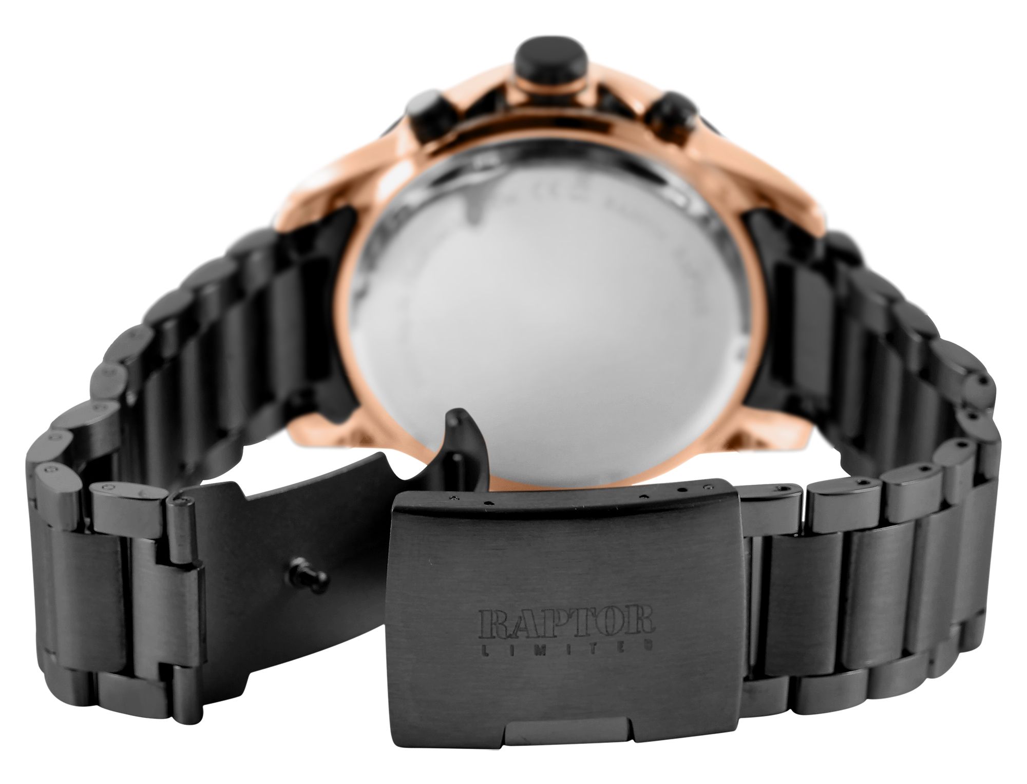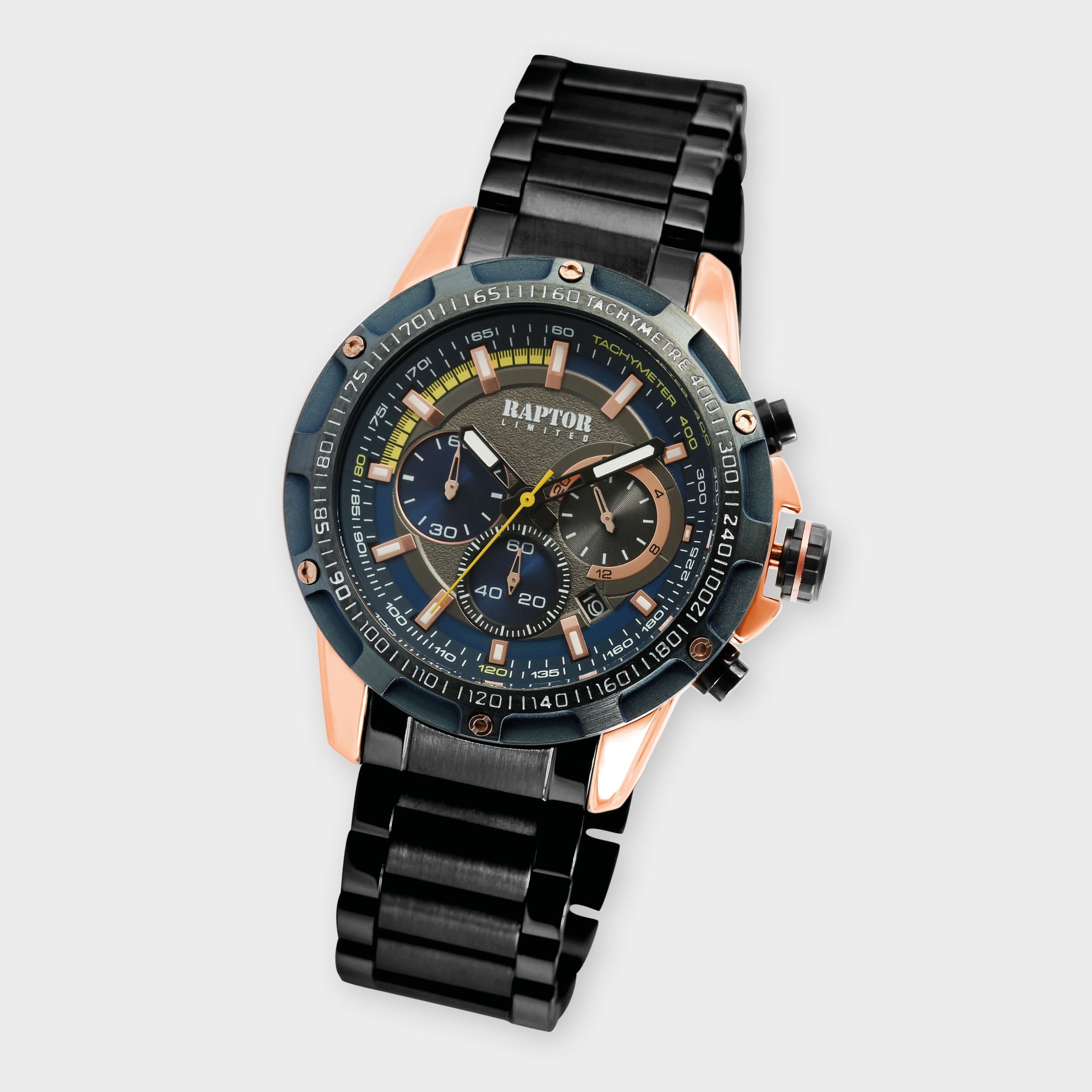 Der Raptor Limited Chronograph "Omran" überzeugt nicht nur durch sein markantes Design, sondern auch durch seine Funktionalität. Das Herzstück dieser Herrenuhr ist das hochwertige Quarzuhrwerk, das nicht nur für unübertroffene Genauigkeit steht, sondern auch für Zuverlässigkeit und Langlebigkeit sorgt. Die analoge Anzeige mit drei Zeigern und Strichindexeinteilung, sowie drei Totalisatoren auf drei, sechs und neun Uhr verleiht dem Chronographen eine klare und leicht ablesbare Ästhetik.