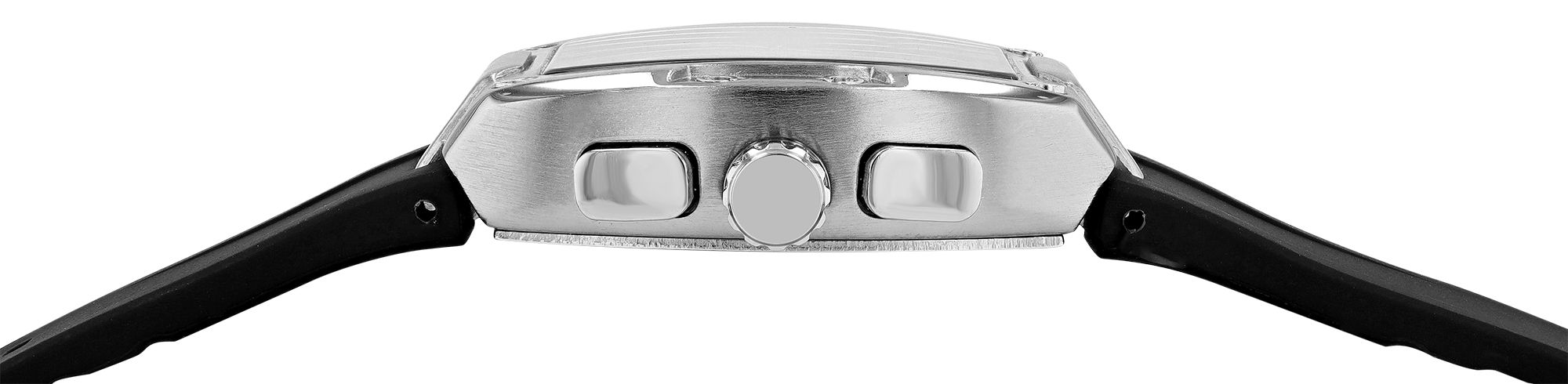 Das markante Tonneau-förmige Gehäuse aus Metall mit Edelstahlboden mit den Maßen ca. 46 x 42 x 12 mm zieht alle Blicke auf sich. Das hochwertige Silikonarmband in mit einer Bandbreite von 30 mm am Steg, die sich verjüngt, sorgt für einen angenehmen Tragekomfort und einen sportlichen Look.