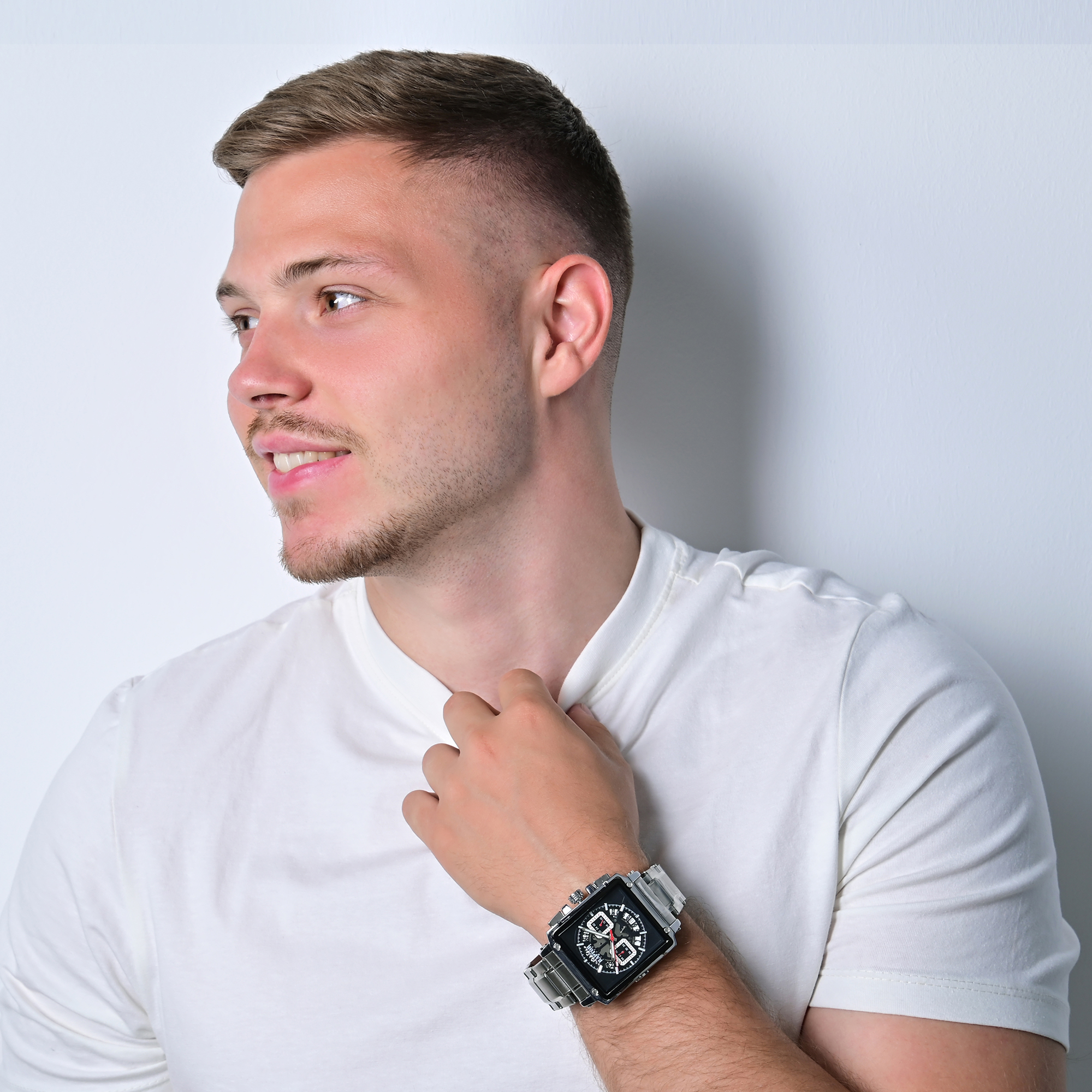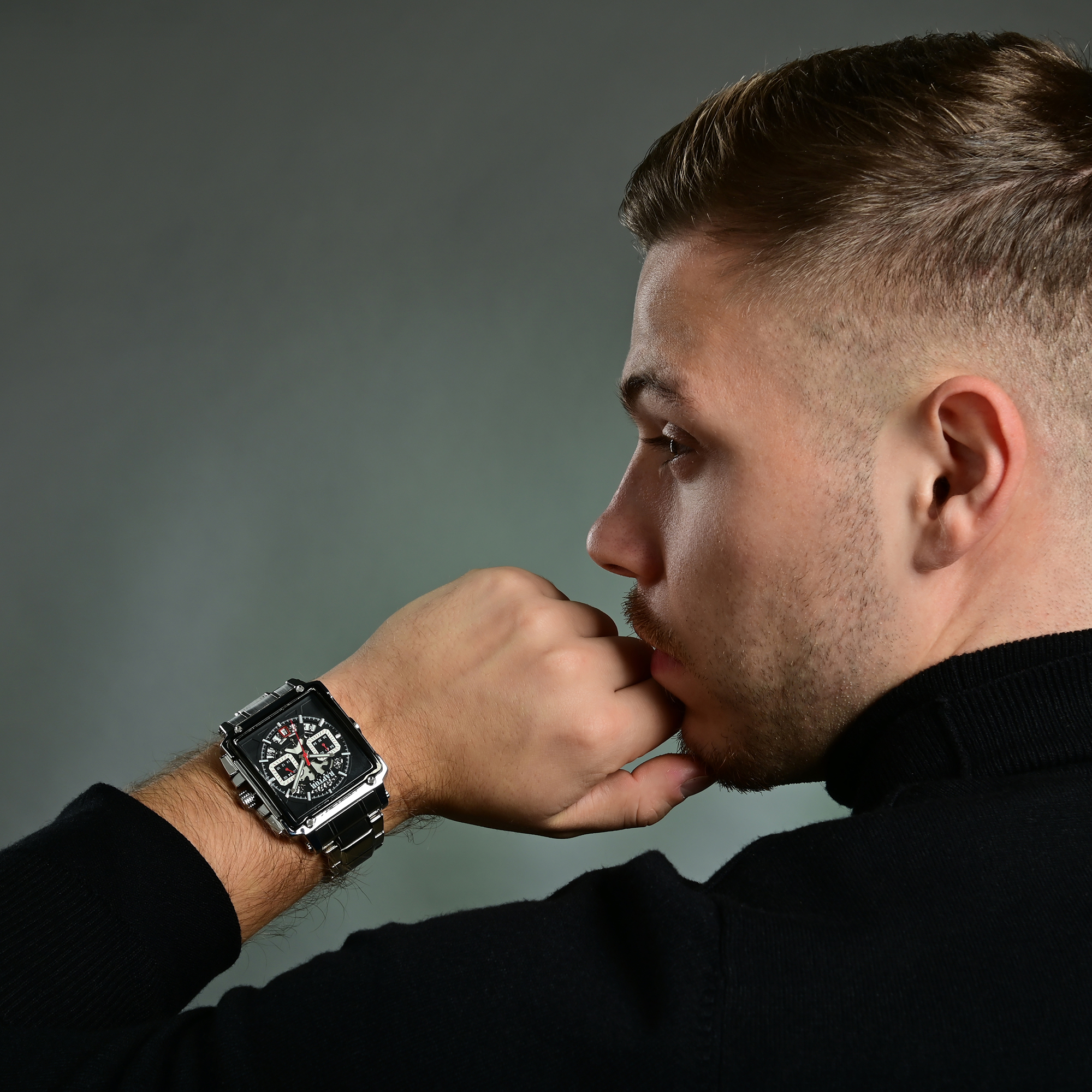 Das markantes Design mit dem quadratischen Gehäuse (56 x 52 x 13,5 mm) zieht alle Blicke auf sich. Das robuste Edelstahlband, das von 24 mm Breite konisch zuläuft und mit einer praktischen Faltschließe versehen ist, sorgt für einen sicheren und angenehmen Tragekomfort. Die Gesamtlänge der Uhr beträgt 25 cm.