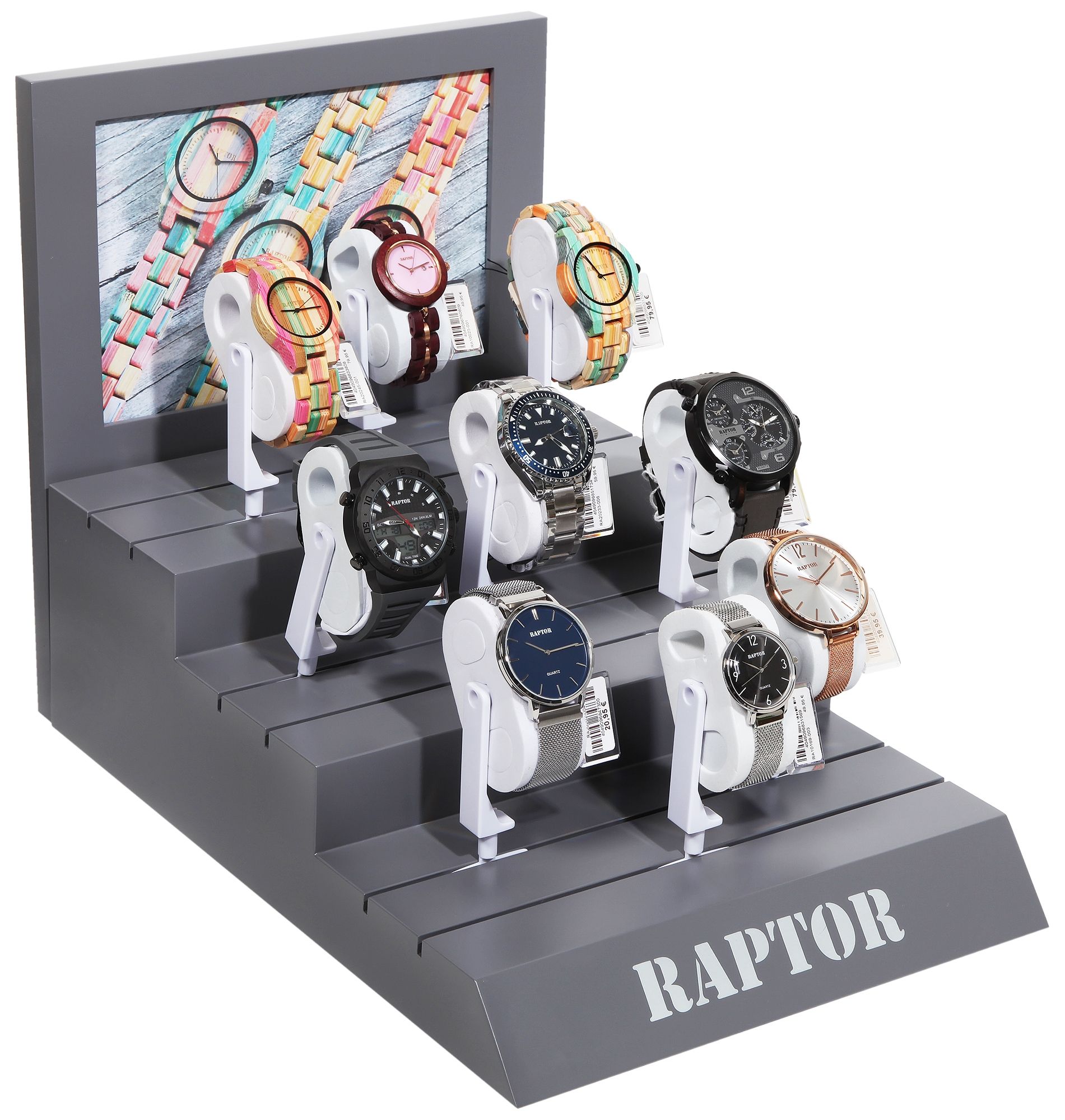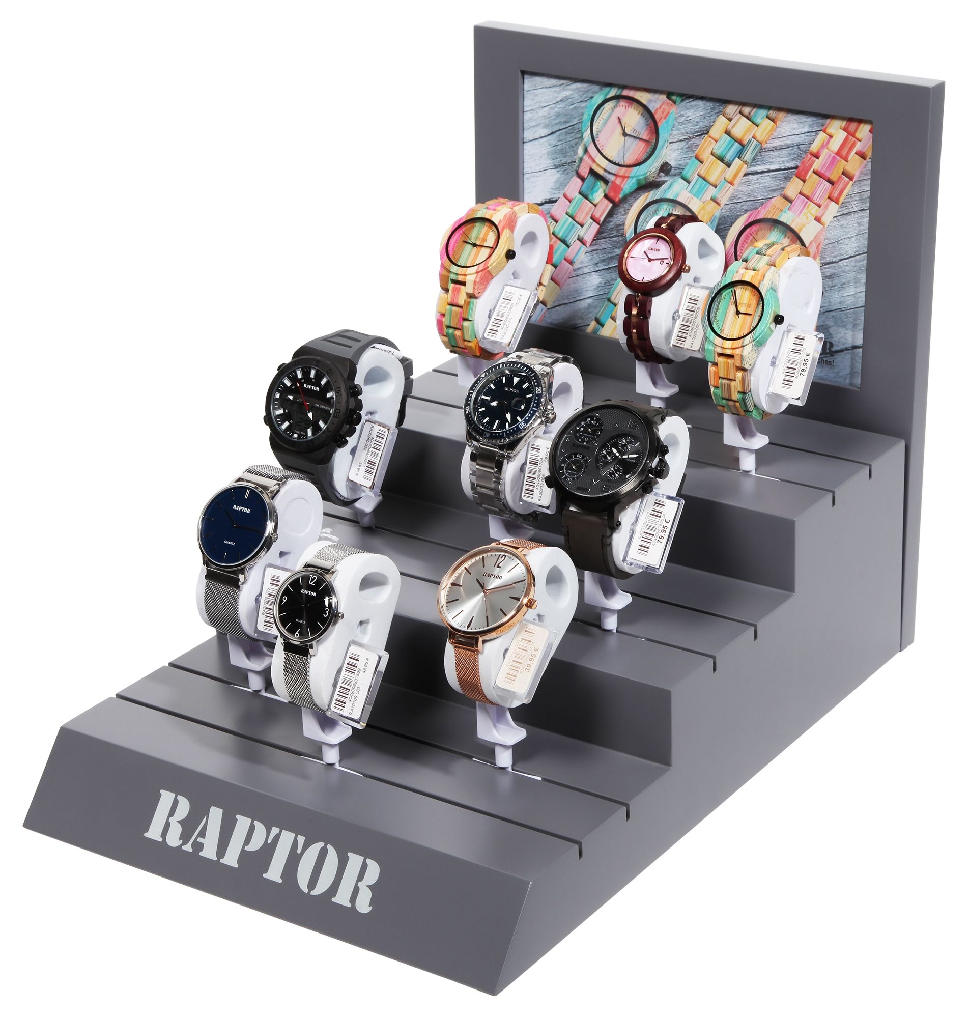 Das Raptor Display aus Holz ist die ideale, verkaufsfördernde Lösung, um Ihre exklusive Raptor Uhrenkollektion stilvoll in Szene zu setzen.