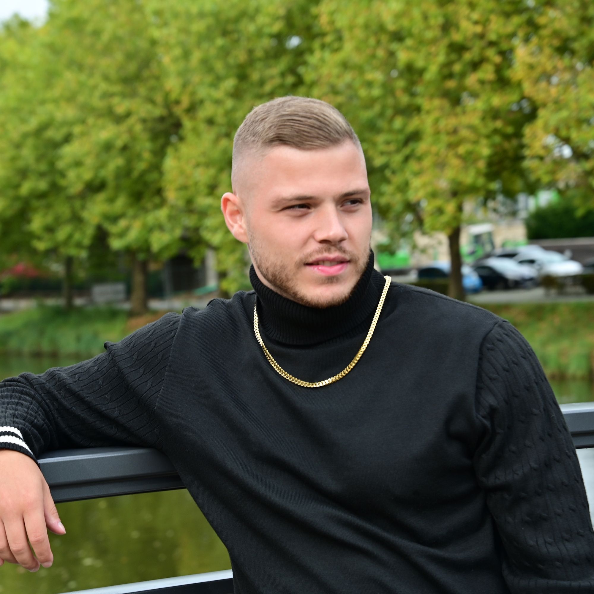 Die goldfarbene Edelstahlkette der Marke Raptor ist im Vierkant-Francokettenmuster gefertigt und ist in verschiedenen Längen erhältlich. Durch die Kettenstärke von 5 mm erhält die Halskette ihren maskulinen und prunkvollen Look. Diese Kette besteht aus einer Reihe eng verbundener V-förmigen Elementen, die für einen hohen Tragekomfort sorgen und das Aussehen so massiv werden lassen. Öffnen und schließen lässt sich die Halskette mit einem goldfarbenen Karabinerhaken, der ebenfalls aus Edelstahl gefertigt ist. Mit diesem Schmuckstück erhalten Sie ein zeitloses und robustes Accessoire, welches Sie sowohl mit, aber auch ohne Kettenanhänger kombinieren können.