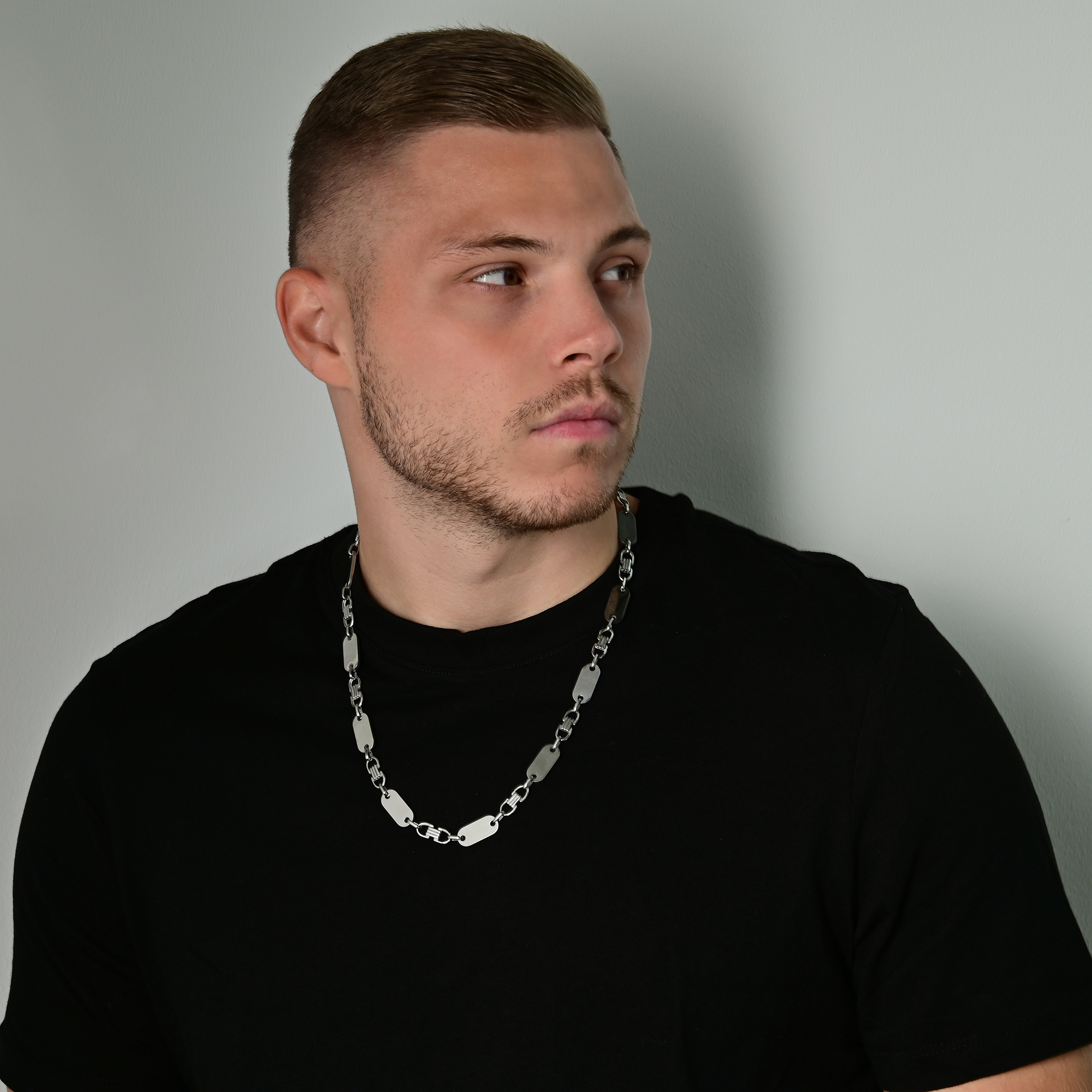 Die Platten mit einer Größe von 22 x 10 mm bieten genügend Platz für eine persönliche Gravur, hier sind Ihrer Kreativität keine Grenzen gesetzt. Die Gravurplatten im Wechsel mit den strukturierten Elementen verleihen der Kette "Reto" eine beeindruckende Optik.