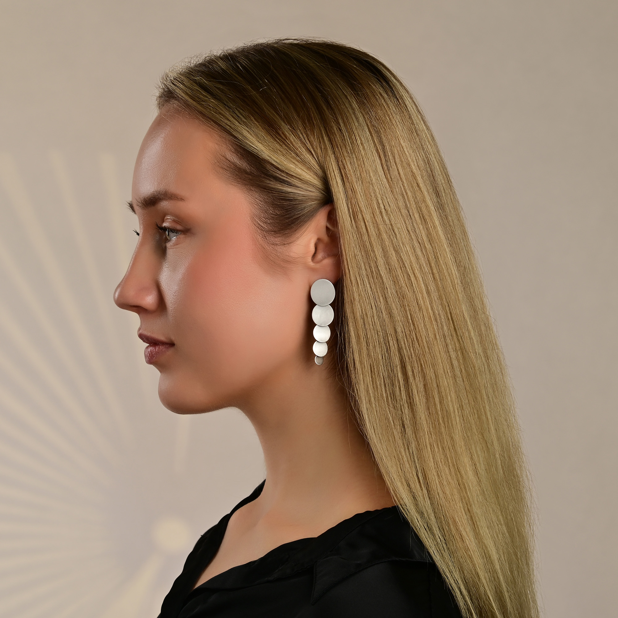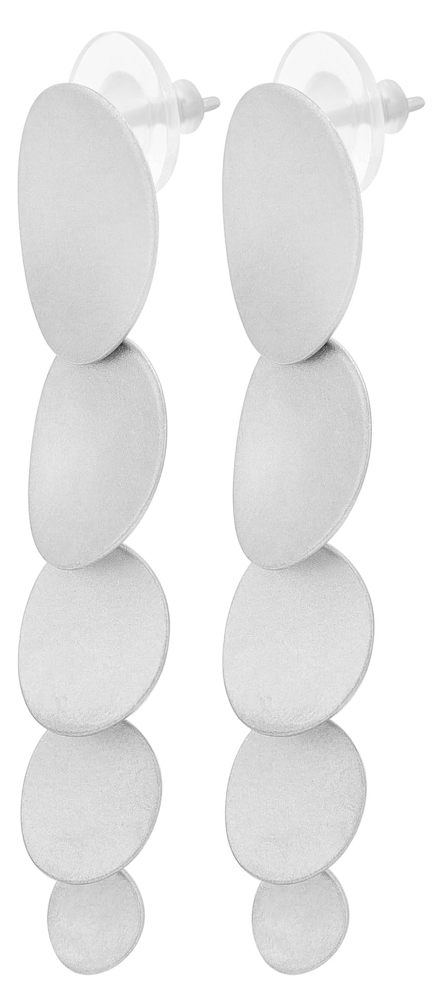 Ein echtes Leichtgewicht am Ohr mit komfortablem Steckverschluss. "Ruma" präsentiert sich in bezaubernder Wasserfalloptik; leicht asymmetrische, kreisförmige, zarte Silberplättchen in variierenden Größen, vom größten zum kleinsten, reihen sich aneinander, um eine Gesamtlänge von 50 mm zu erreichen. Die Elemente sind beweglich und das größte unter ihnen misst 16 mm in der Breite. Gefertigt ist "Ruma" aus 925/- Echt Silber, welches eine mattierte Optik besitzt. Besonders an den beweglichen Elementen dieses Ohrhängers ist die Materialstärke von nur rund 1 mm, welche "Ruma" zu einem luftig-leichten Erlebnis am Ohr werden lassen. Dieser fast schwerelose Ohrschmuck in modernem Design eignet sich besonders für Alltag und Büro.