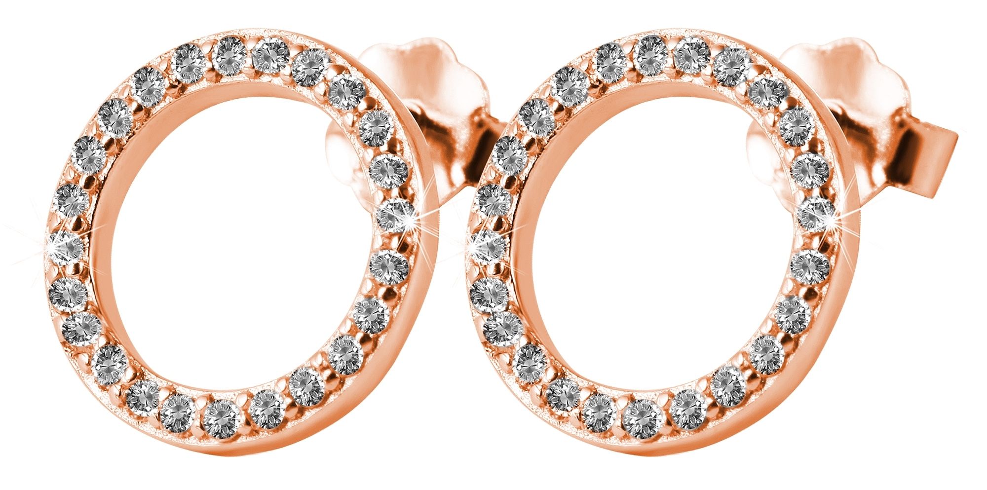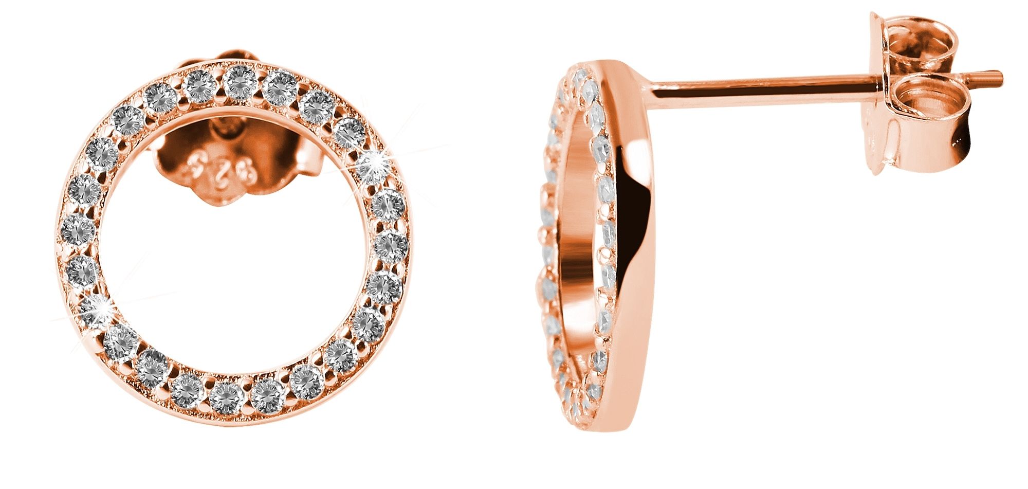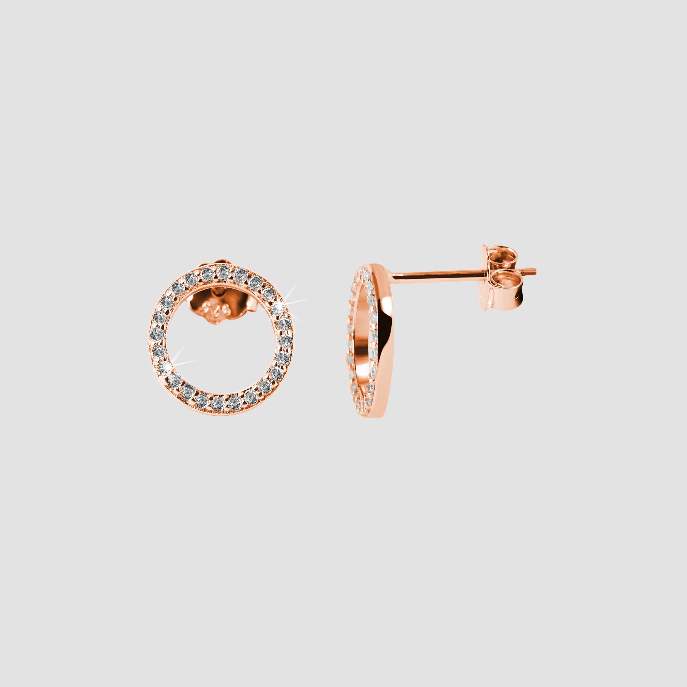 Die Ohrstecker in runder Form wurden aus 925/- Sterlingsilber hergestellt und rosévergoldet. Die Ohrstecker sind mittig offen, rundherum werden sie mit 25 funkelnden Zirkoniasteinen geschmückt. Dadurch sind die Ohrringe schlicht und zeitlos und strahlen trotzdem eine tolle Eleganz aus. Mit einer Flügelschraube aus Echtsilber können die Ohrringe hinten am Ohrloch gesichert werden. Die Größe ergibt sich aus einem Durchmesser von 10 mm und einer Stärke von 1,5 mm. Sie sind ein toller Blickfang, wodurch ein modisches Statement setzt und mit dem man garantiert nicht unbemerkt bleibt.