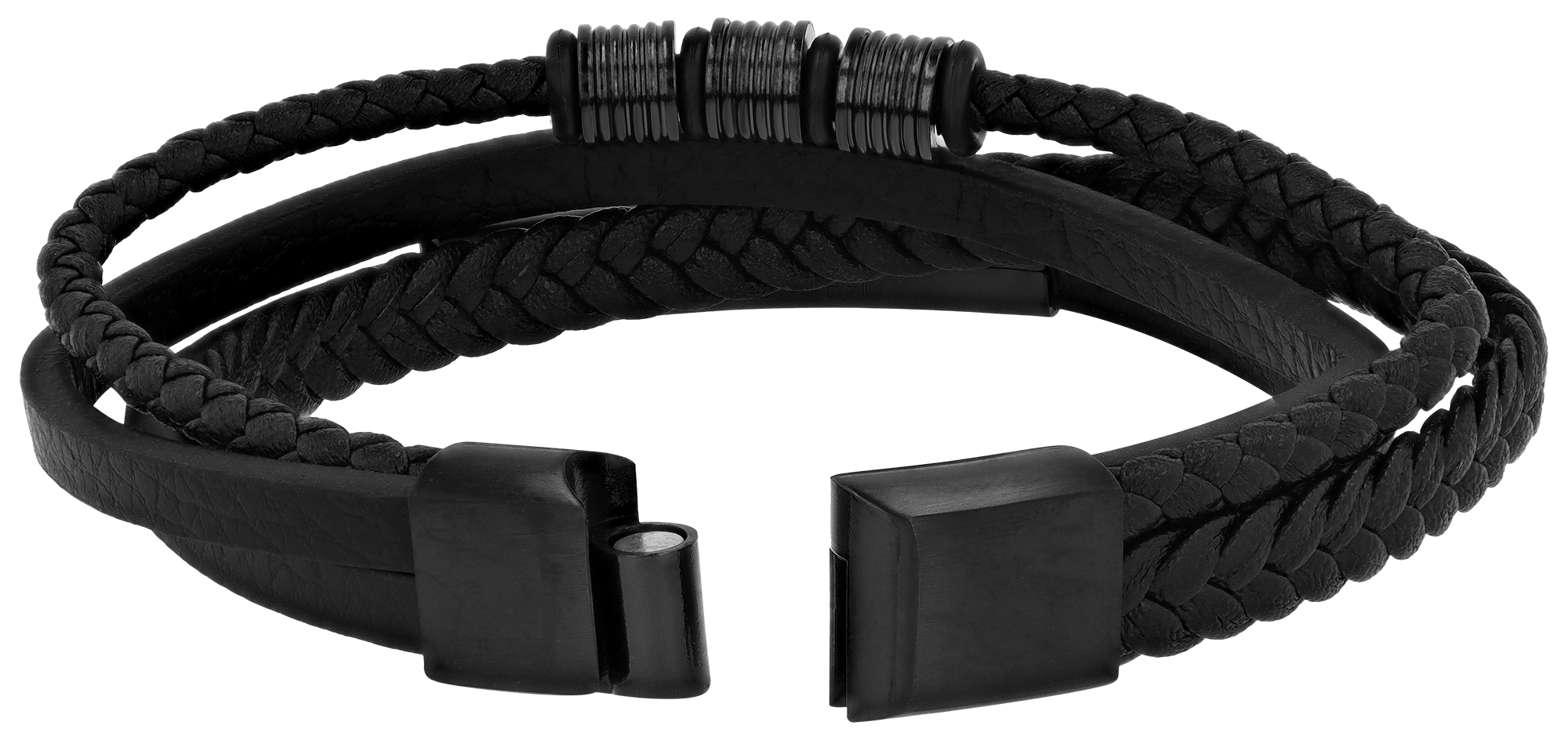 Das schwarze Armband der Marke Akzent wurde aus Echtleder gefertigt und ist in den Längen 21 cm und 23 cm erhältlich. Das vierreihige Schmuckarmband besteht aus einer geflochtenen Lederkordel, einem geflochtenen Riemen und zwei glatten Riemen. Mittig präsentieren sich schwarze Kautschukringe, Edelstahlelemente und eine Identplatte, welche das Design gekonnt vollenden und sich darüberhinaus perfekt für kleine Gravuren eignet. Mit einem praktischen und massiven Magnetverschluss lässt es sich leichthändig öffnen und schließen, der sich ebenfalls zum gravieren anbietet. Die mattierte Schließe ist aus Edelstahl gefertigt und mit einer hochwertigen Ionenplattierung veredelt. Die Kombination aus verschiedenen Materialien lassen dieses Armband besonders wirken.