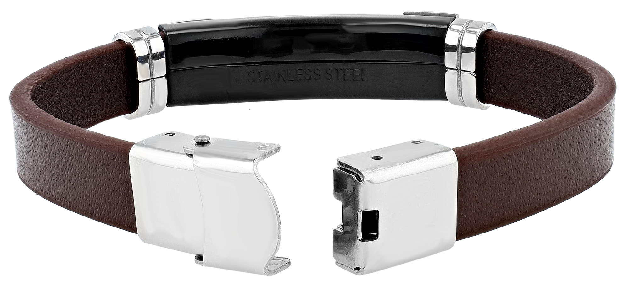 Das Echtlederarmband der Marke Akzent ist aus einem 12 mm breiten Echtlederriemen gefertigt und fasst mittig ein silberfarbenes Edelstahlelement, welches an den Seiten schwarz abgesetzt ist. Öffnen und schließen lässt sich das moderne Schmuckarmband mit einem silberfarbenen Hakenverschluss, der ebenfalls aus Edelstahl gefertigt ist.