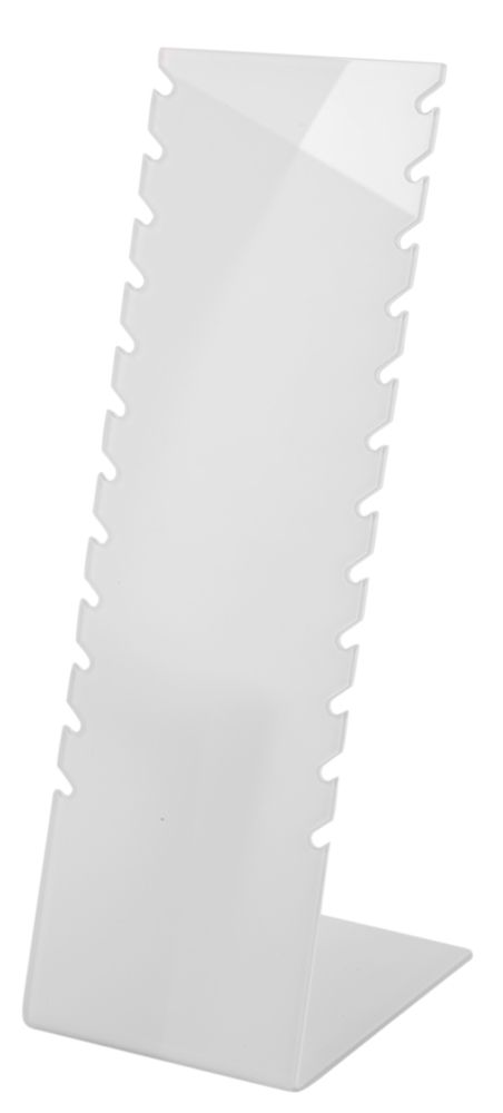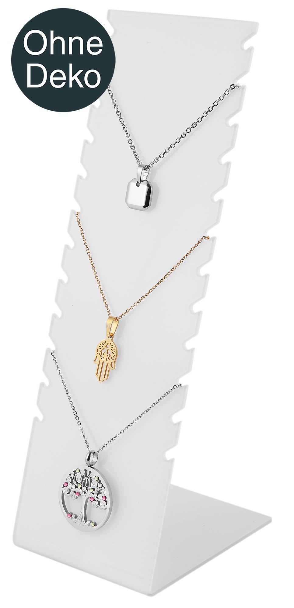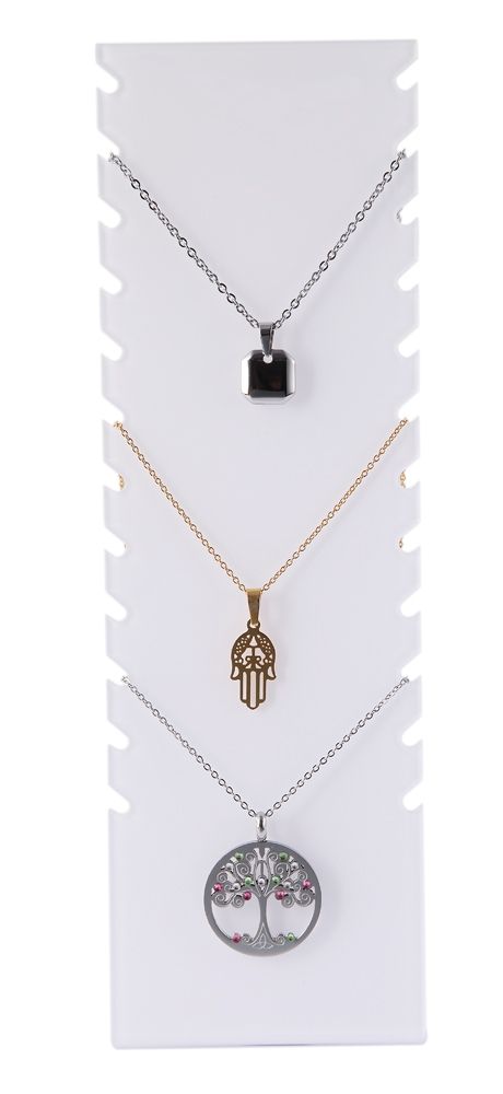 Der Schmuckaufsteller ist wahlweise in weiß oder schwarz erhältlich. Er ist zur Präsentation von Halsketten, Armbändern und Fußketten geeignet. Der Aufsteller ist aus einem Stück gefertigt. Die Maße ergeben sich aus einer Breite von 8 cm, einer Höhe von 25 cm und einem 10 cm langen Fuß. Auf einer von oben gemessenen Höhe von 0,5 cm sind in einer Reihe in gleichmäßigen Abständen beidseitig 24 Einkerbungen zum Einhängen von Ketten, Armbändern und Fußketten angebracht, somit lassen sich gleichzeitig zwölf Kettchen in geordneter Sortierung präsentieren. Die prägnante Oberfläche unterstreicht das Aussehen des Schmucks und präsentiert sie von ihrer besten Seite. Eine simple Präsentationsmöglichkeit mit der man viel erreichen kann.