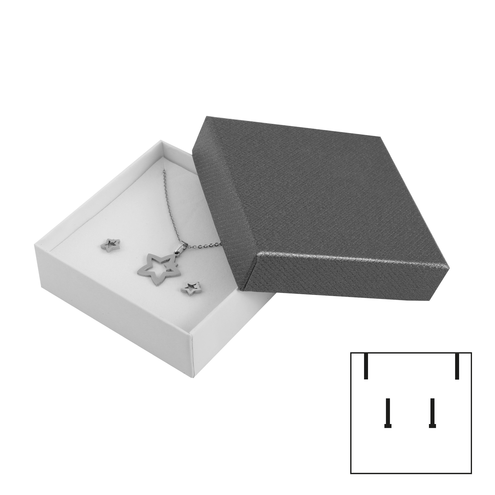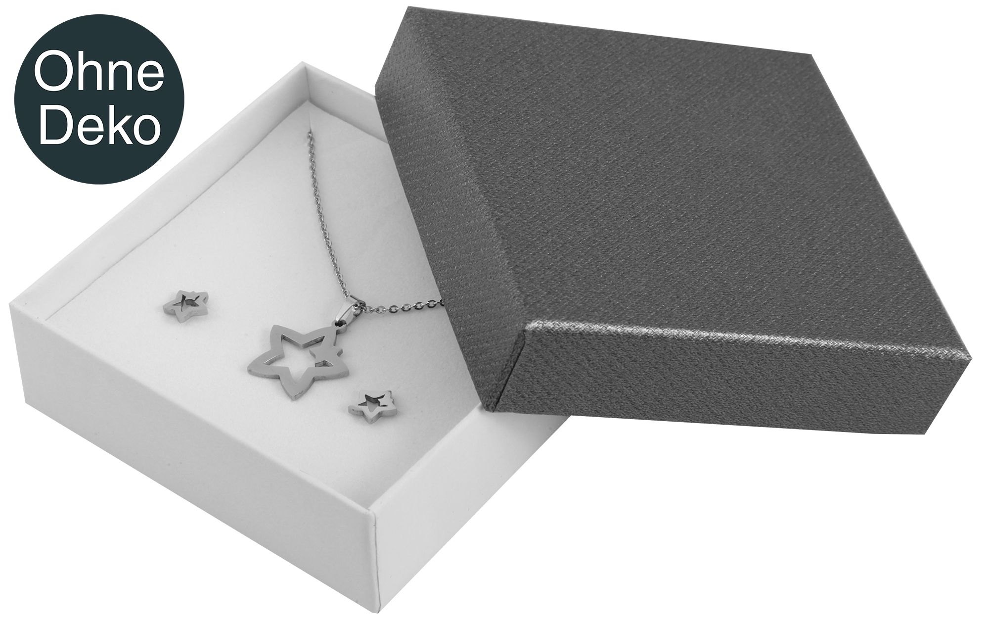 Die Schmuckverpackungen, bestehend aus zwölf Stück in einer Verpackungseinheit, wurden aus hochwertigem und robusten Karton gefertigt. Besonders durch das auffällige Design eignet sich diese Schmuckverpackung besonders gut als Geschenkverpackung. Die Box verfügt über einen grauen Deckel und einen weißen Karton. Im Inneren befindet sich ein weißes Einlageinlett, welches mit einer Stoffschicht überzogen ist. Die Box eignet sich hervorragend zur Präsentation und Aufbewahrung von unterschiedlichen Schmuckstücken. Dank des Einlageinlett ist es möglich ein Set bestehend aus Kette, Ohrstecker und Kette zu Präsentieren. Die Größe der Schmuckverpackung ergibt sich aus einer Länge von 9 cm, einer Breite von 9 cm und einer Tiefe von 3 cm.