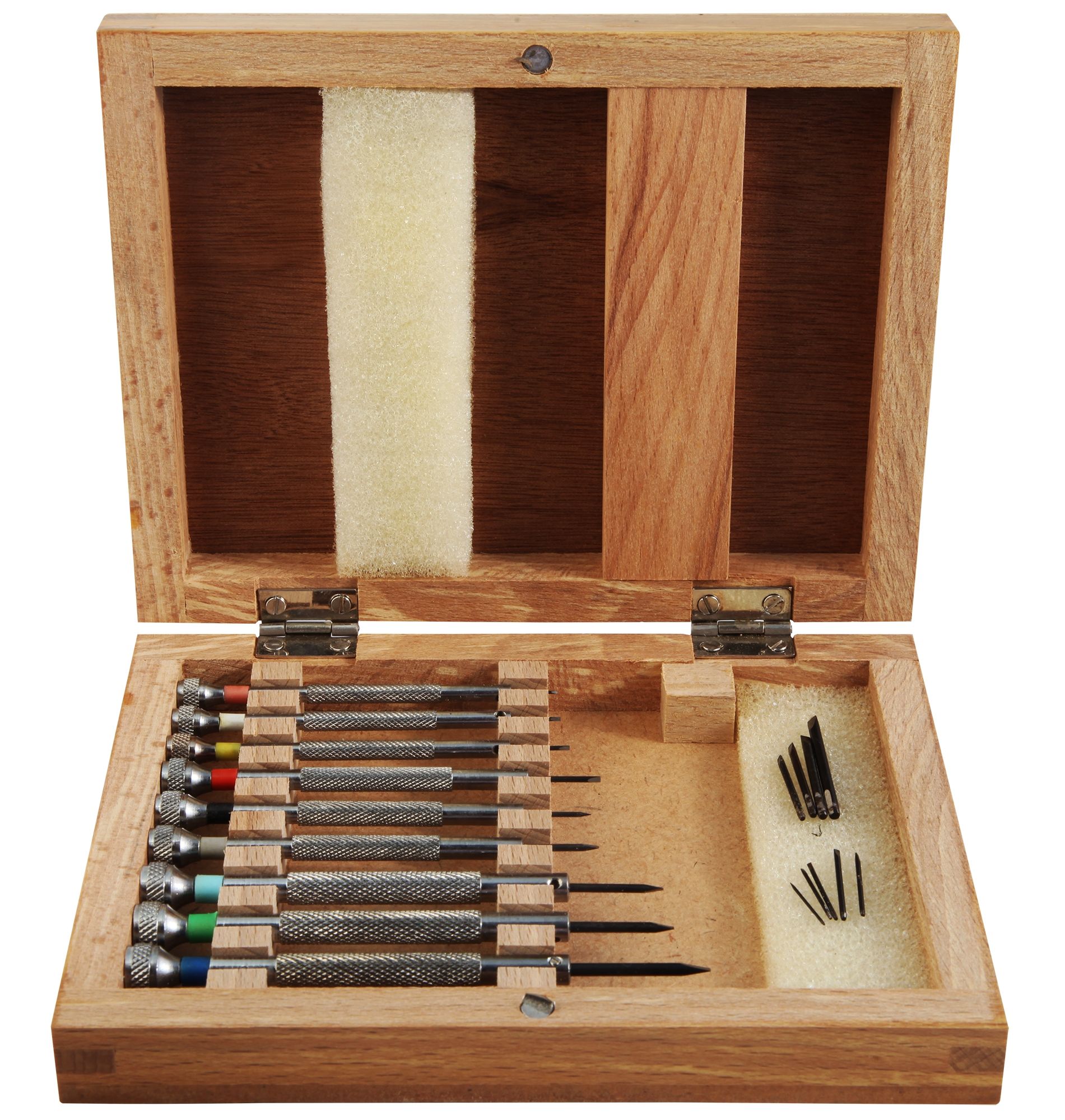 Das Schraubendreherset besteht aus neun sortierten Schlitzschraubendrehern, die in einer magnetisch verschließbaren Holzbox geliefert werden. Die Schraubendreher sind in den Stärken 2,5 mm, 2,0 mm, 1,8 mm, 1,5 mm, 1,3 mm, 1,1 mm, 1,0 mm, 0,9 mm und 0,7 mm vorhanden. Zusätzlich ist für jeden Schraubenzieher eine Ersatzklinge enthalten. Schraubendreher sind aus einer Uhrmacherei nicht wegzudenken. Man benötigt sie zum Öffnen von Uhrengehäusen, zum Kürzen von Uhrenarmbändern und für Reparaturen im und am Uhrwerk. Die Holzbox hat Abmessungen von 16,1 cm in der Breite, 12,5 cm in der Länge und 3,2 cm in der Höhe.